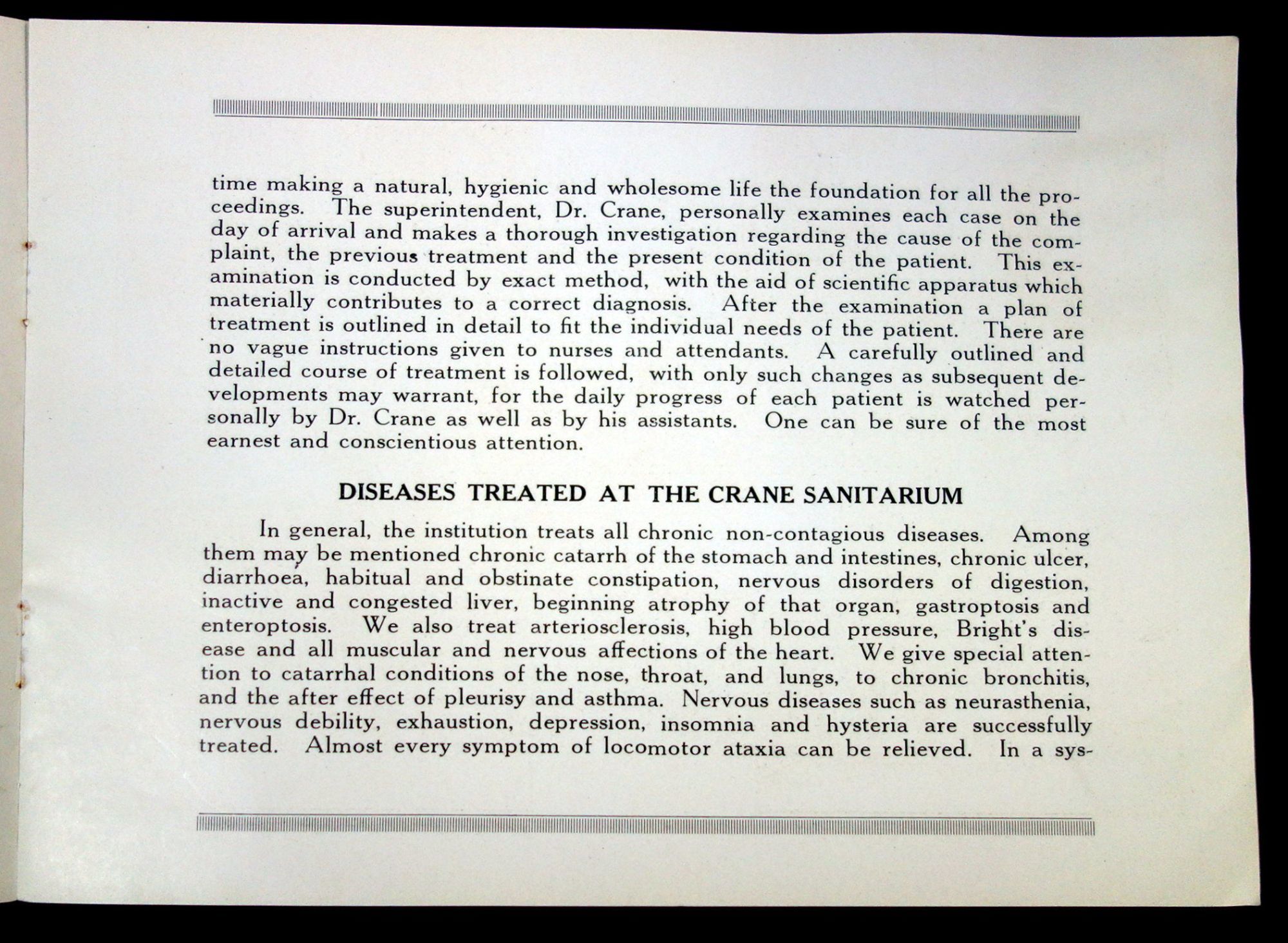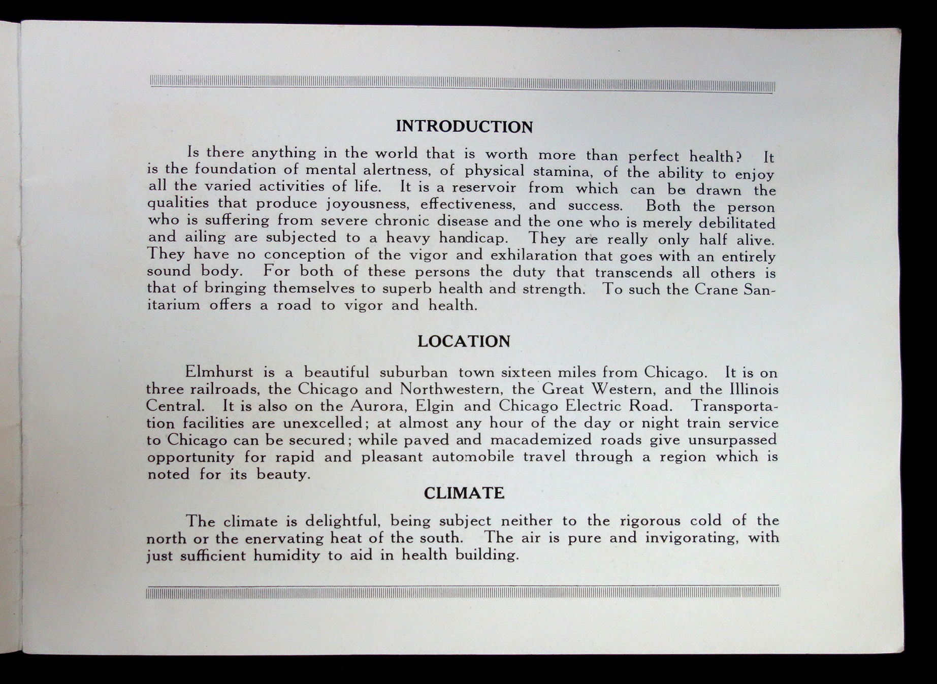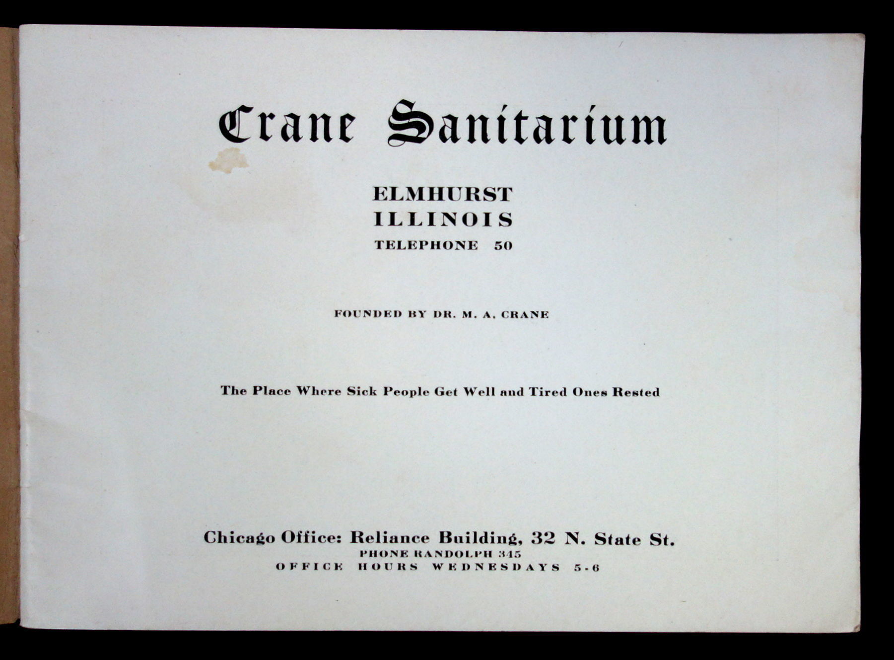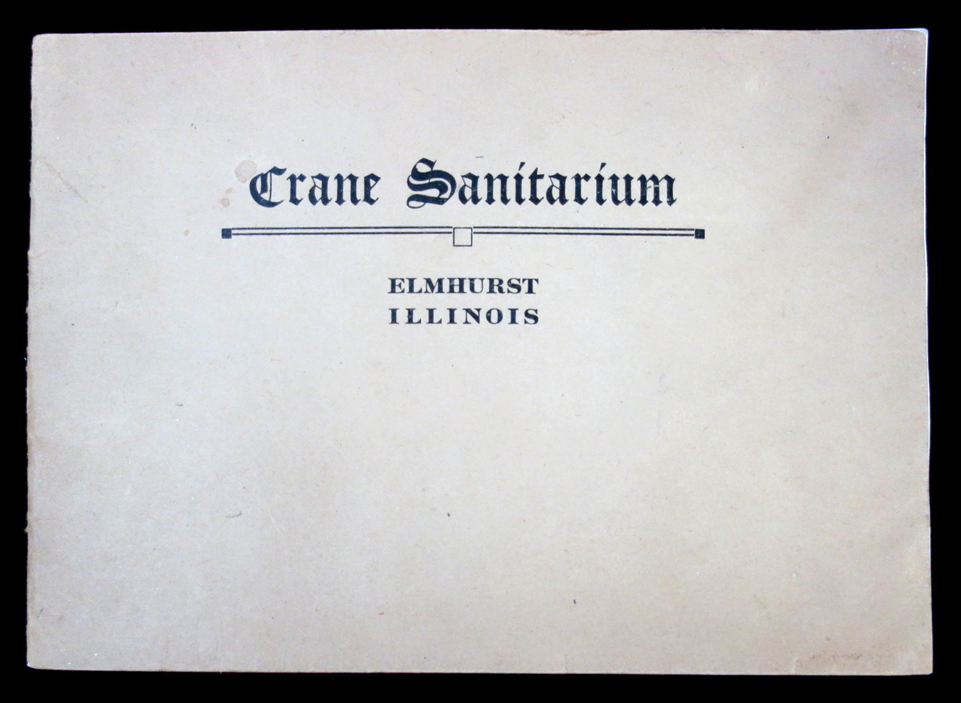 Chicago, IL: Wm H Gallo & Son, Printers, 1910. Age toning. Staple are rusting.. A brochure for the Crane Sanitarium located in Elmhurst, IL, and founded by Milo A. Crane. The slogan of this sanitarium was "The place where sick people get well and the tired ones rest." The sanitarium sourced its water supply from Mammoth Mineral Springs, located only a few miles away from the town. The water was "highly charged with radium activity and also with sulphur [sic] and iron and many other mineral remedial agents of a nature so necessary for the health of the body." Mammoth Mineral Springs also supplied the water for the entire town of Elmhurst until it was depleted in 1916. While the mineral water was used for various forms of hydrotherapy, the sanitarium also provided other services such as a specialty diets- such as the milk cure-, massages, exercises and Swedish Medical Gymnastics. These treatments were specifically designed to help cure 'chronic non-contagious diseases' such as catarrh, ulcers, diarrhea, constipation, nervous disorders of digestion, congested liver, liver atrophy, gastroptosis, enteroptosis, arteriosclerosis, high blood pressure, Bright's diease, bronchitis, and asthma. The sanitarium also has a variety of 'amusements and recreations' such as tennis and croquet. At the end of the brochure is a section about the Diamond Lake Sanitarium, which was a popular resort that was transformed into a sanitarium during the summer months to handle to overflow of persons wanting to stay at the Crane Sanitarium. The brochure has twelve pages of printed photographs- some pages have up to five printed photographs- and one black and white illustration of Diamond Lake Sanitarium. 24 pages, brown printed wrappers, staple binding. Measures 7 1/2" x 5 1/4"