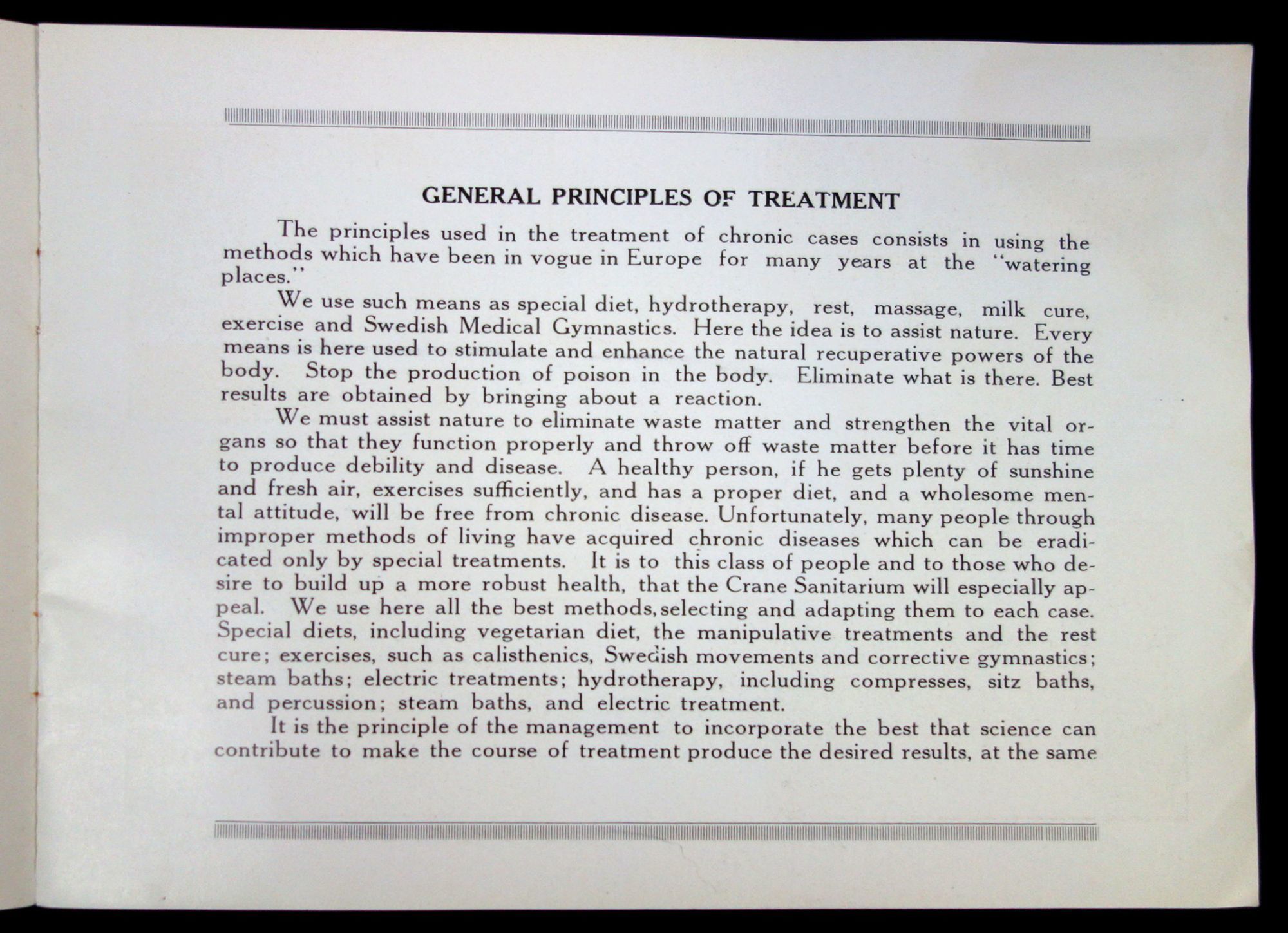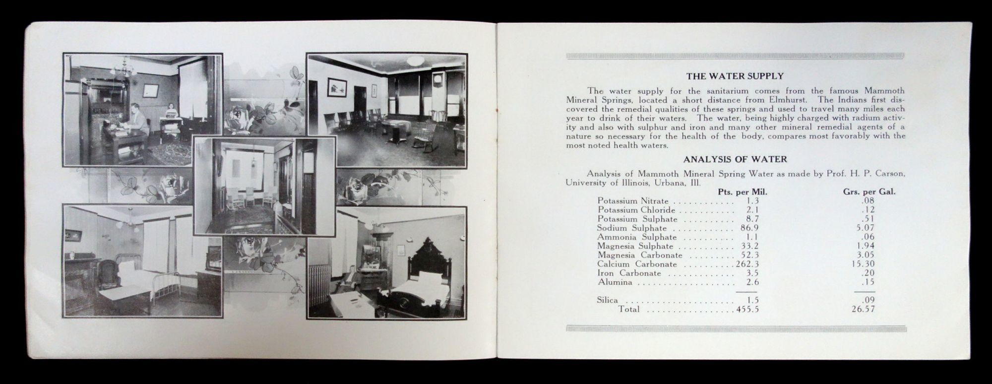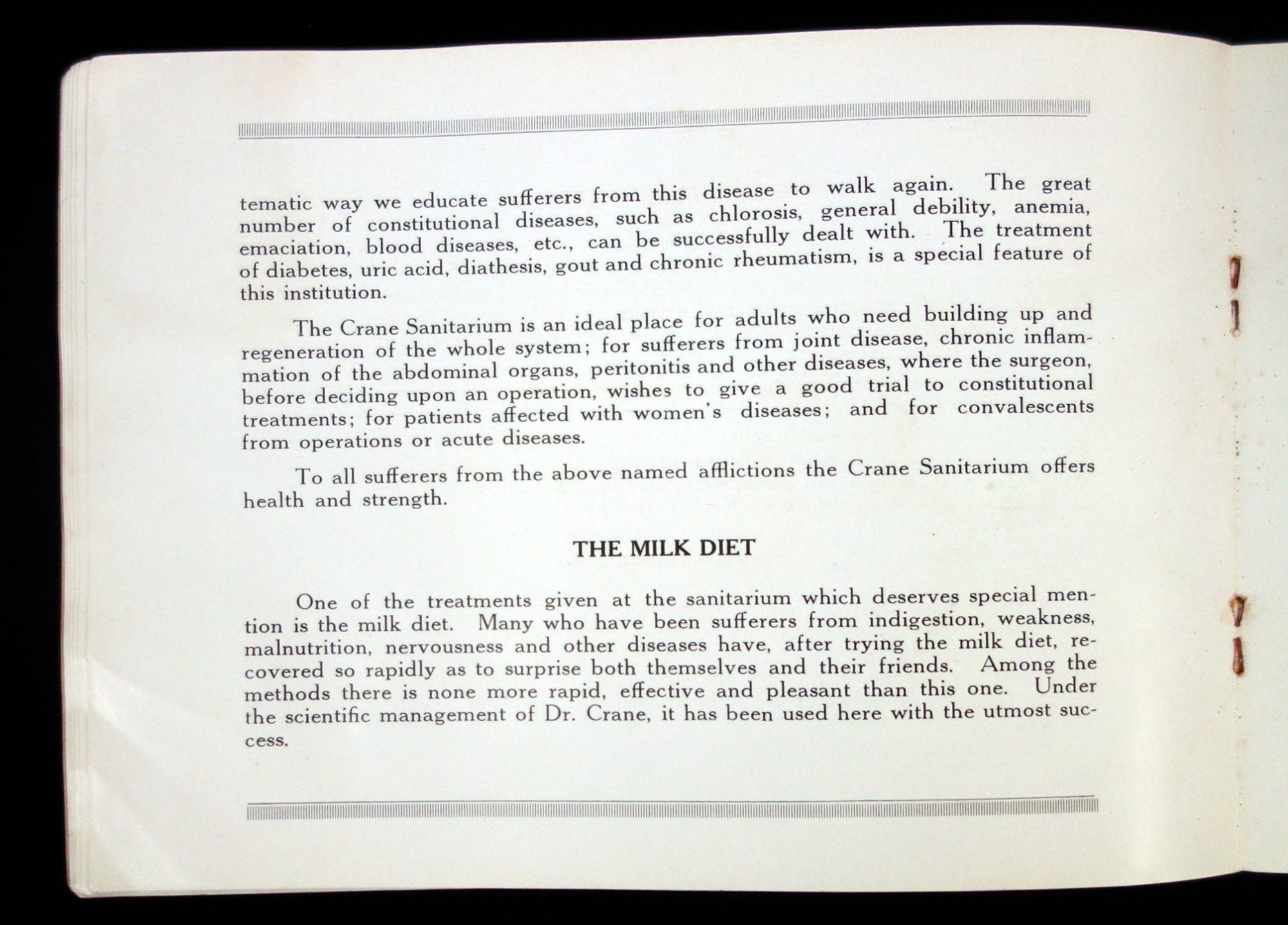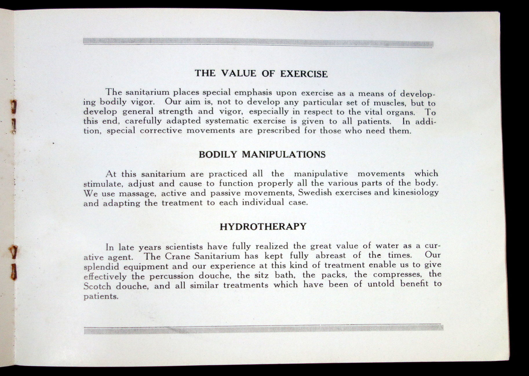 Chicago, IL: Wm H Gallo & Son, Printers, 1910. Age toning. Staple are rusting.. A brochure for the Crane Sanitarium located in Elmhurst, IL, and founded by Milo A. Crane. The slogan of this sanitarium was "The place where sick people get well and the tired ones rest." The sanitarium sourced its water supply from Mammoth Mineral Springs, located only a few miles away from the town. The water was "highly charged with radium activity and also with sulphur [sic] and iron and many other mineral remedial agents of a nature so necessary for the health of the body." Mammoth Mineral Springs also supplied the water for the entire town of Elmhurst until it was depleted in 1916. While the mineral water was used for various forms of hydrotherapy, the sanitarium also provided other services such as a specialty diets- such as the milk cure-, massages, exercises and Swedish Medical Gymnastics. These treatments were specifically designed to help cure 'chronic non-contagious diseases' such as catarrh, ulcers, diarrhea, constipation, nervous disorders of digestion, congested liver, liver atrophy, gastroptosis, enteroptosis, arteriosclerosis, high blood pressure, Bright's diease, bronchitis, and asthma. The sanitarium also has a variety of 'amusements and recreations' such as tennis and croquet. At the end of the brochure is a section about the Diamond Lake Sanitarium, which was a popular resort that was transformed into a sanitarium during the summer months to handle to overflow of persons wanting to stay at the Crane Sanitarium. The brochure has twelve pages of printed photographs- some pages have up to five printed photographs- and one black and white illustration of Diamond Lake Sanitarium. 24 pages, brown printed wrappers, staple binding. Measures 7 1/2" x 5 1/4"