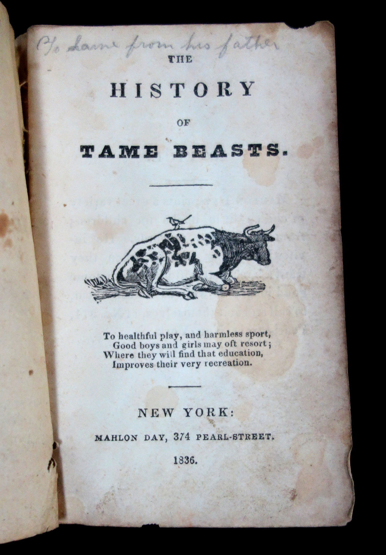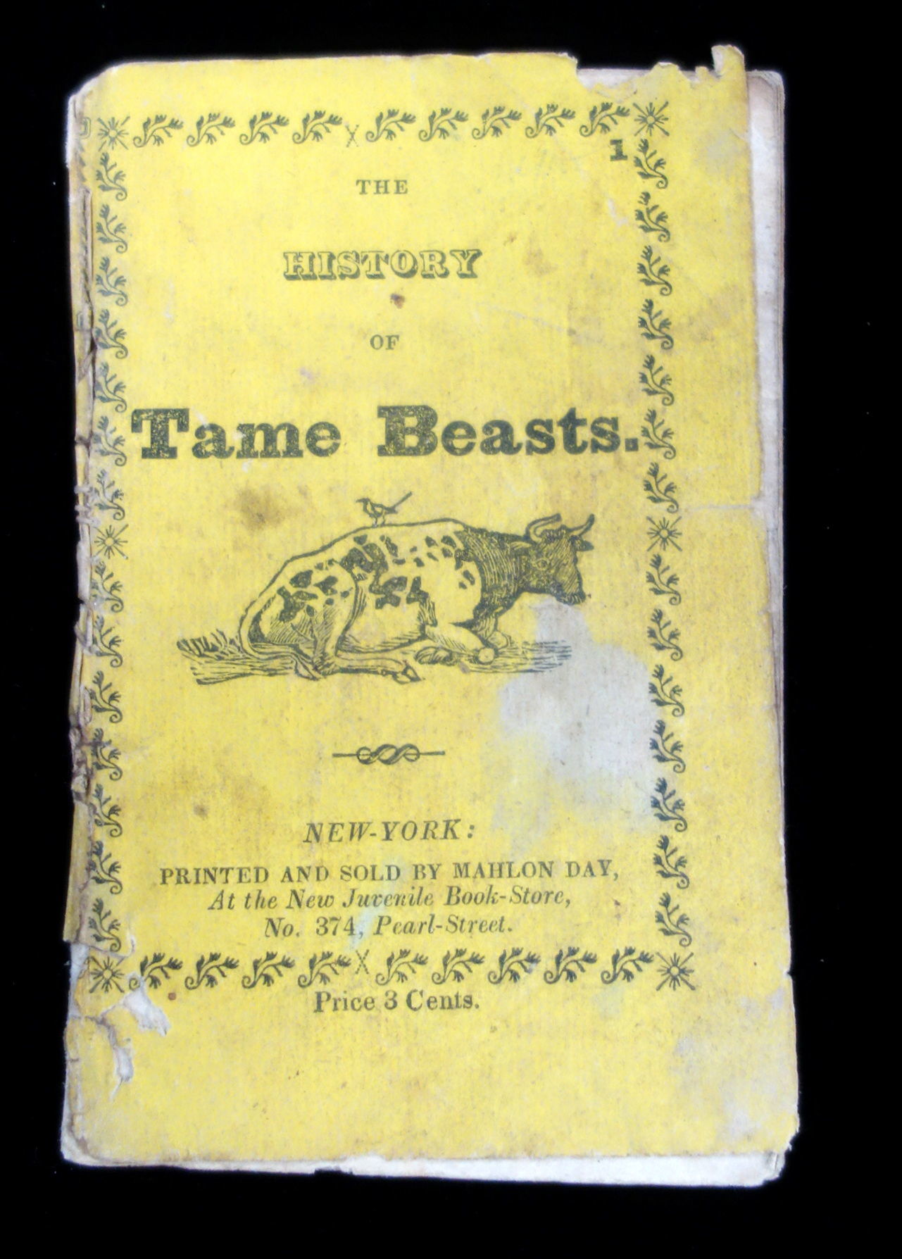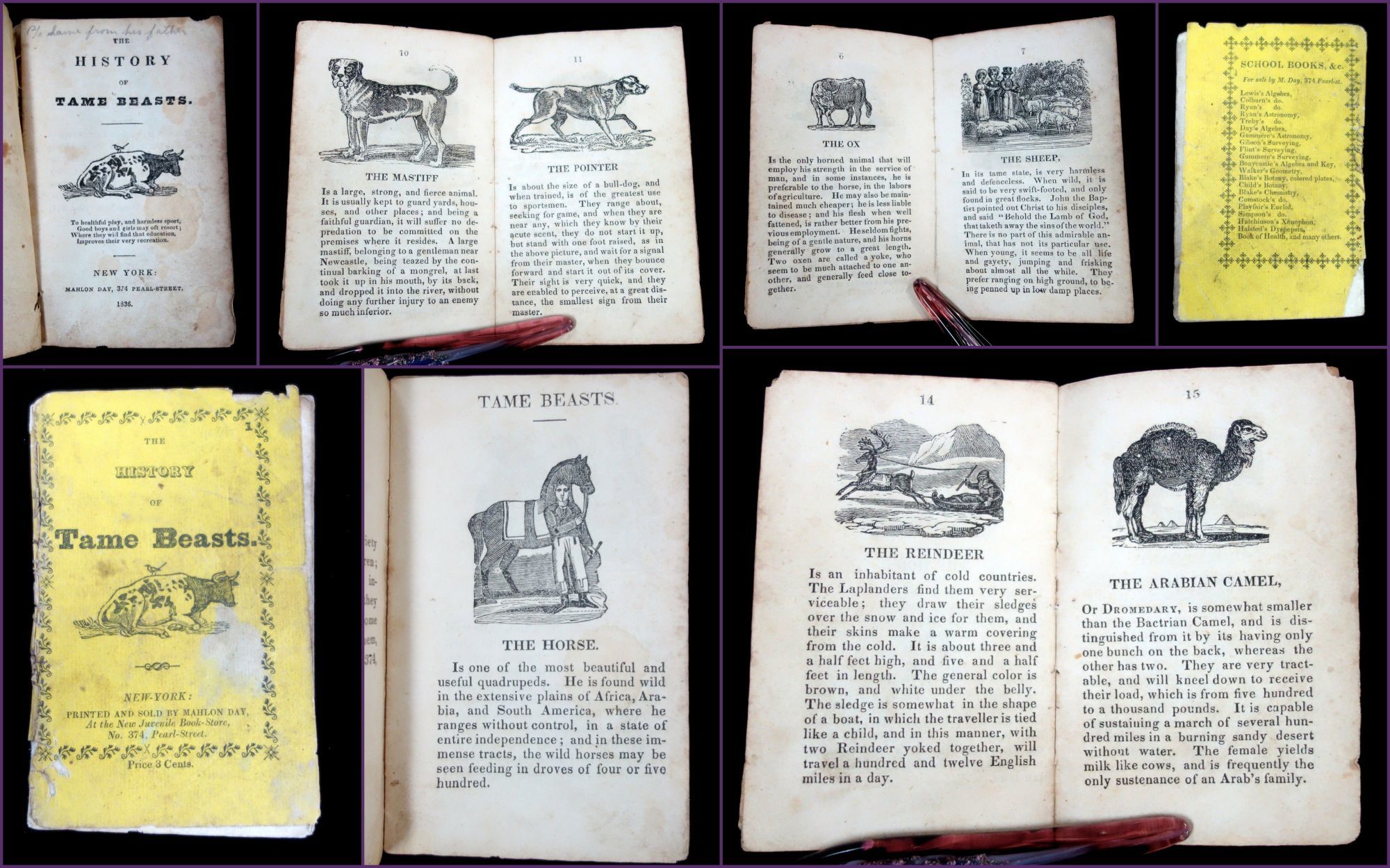 New York, NY: Mahlon Day, 1836. Age toning and soiling. Sewing repair. Back cover missing small section on bottom.. A short chap book that provides an illustration and description of fourteen domesticated animals (three of which are different species of dogs). The animals described in the book are: the horse, the ass the cow, the ox, the sheep, the goat, the cat, the mastiff, the pointer, the spaniel, the hog, the reindeer, Arabian camel and the elephant. The back cover has a list of other books sold by Mahlon Day. On the front cover, it states that this book was sold a the New Juvenile Book Store located at No. 374 Pearl Street in New York. 16 pgs. Yellow printed wrappers. Thread binding. OCLC 2 (Oct 2019) Measures 4 1/2" x 2 3/4