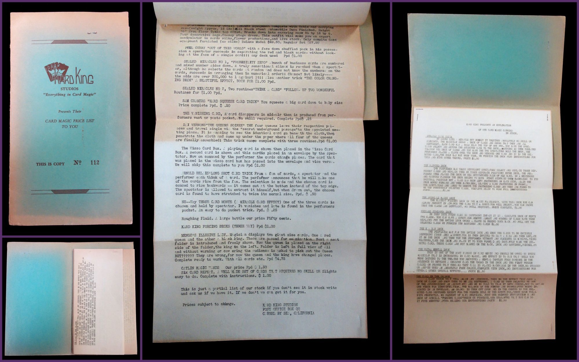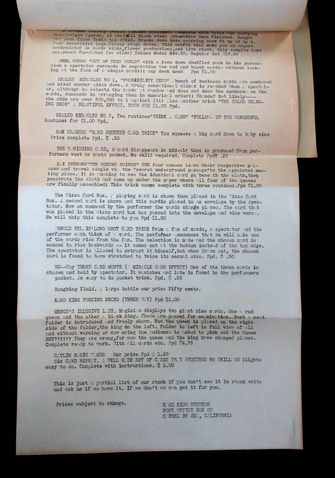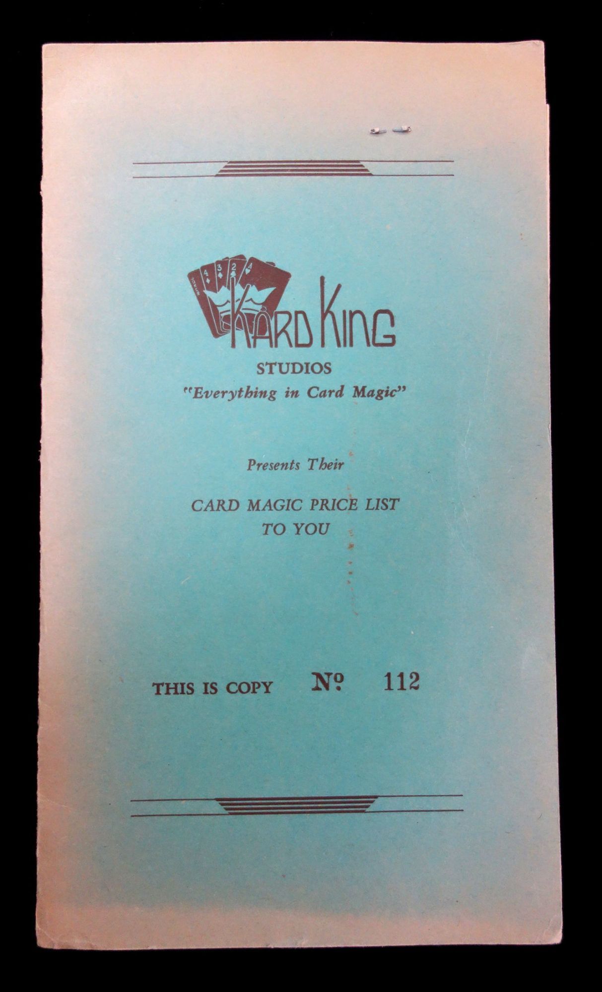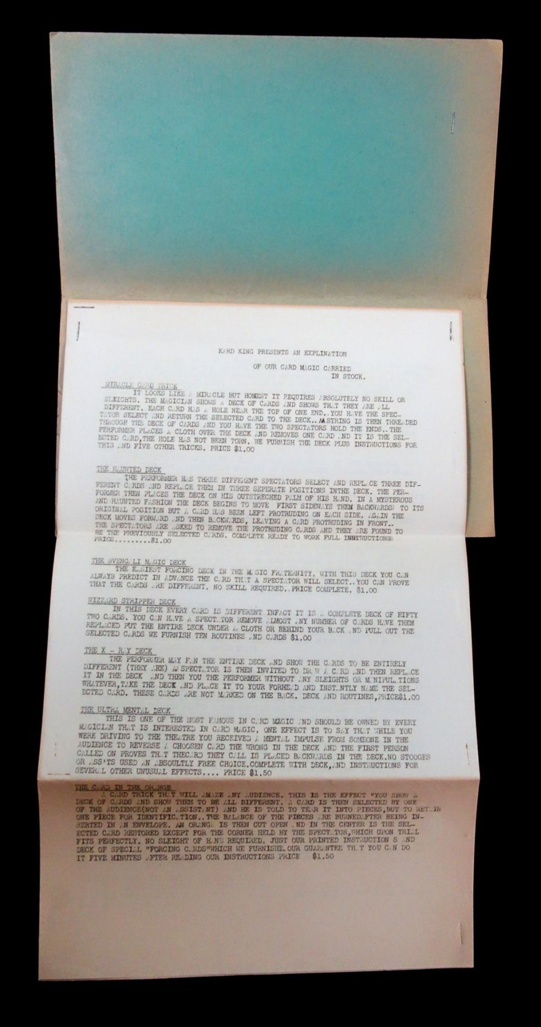 Carmel, CA: Kard King Studios, Sep-45. Light damage to covers. Toning on interior pages.. A trade catalogue about the "art" of card magic. Published by Kard King Studios, a magic shop that specializes in magic done with a deck of cards. The catalogue itself is a single fold blue heavy stock cover, with four legal size pages attached onto the interior with staples. These pages are then folded so that the catalogue is flat. These interior pages list each item currently in stock at Kard King Studios along with a short explanation of the item and the magic trick. There are approximately forty-five (45) items on the list, such as the X-Ray deck (, Miracle Card Trick, Sterlings Walking Card, and the New Queens Mystery. The catalogue is careful to explain the magic trick each item performs without telling the reader how to perform the magic trick itself. The reader would need to purchase the item to receive detailed instructions. For example, for an item called 'The Haunted Desk', the catalogue provides the following instructions: "The performer has three different spectators select and replace three different cards and replace them in three seperate [sic] positions in the deck. The performer then places the deck on his outstretched palm of his Hand. IN a mysterious and haunted fashion the deck begins to move first sideways then backwards to its original position but a card has been left protruding on each side. Again the deck moves forward and then backwards, leaving a card protruding in front. The spectators are asked to remove the protruding cards and they are found to be the previously selected cards. Complete, ready to work, full instructions. Price..... $1.00" The front cover states "This is a copy, No. 112". Measures 9 1/4" x 5 1/4" (folded catalogue), 14" x 8 1/2" (unfolded interior pages).