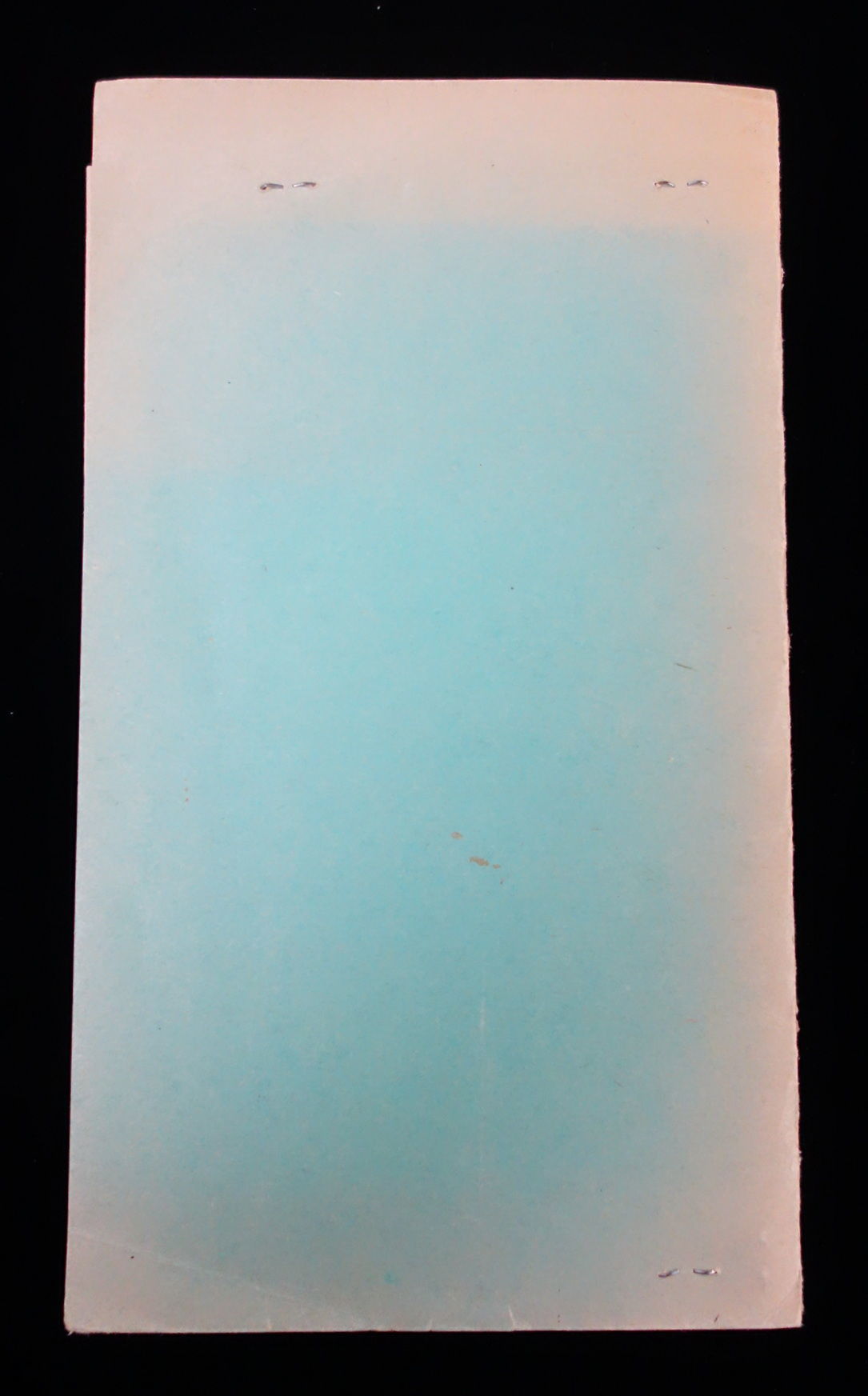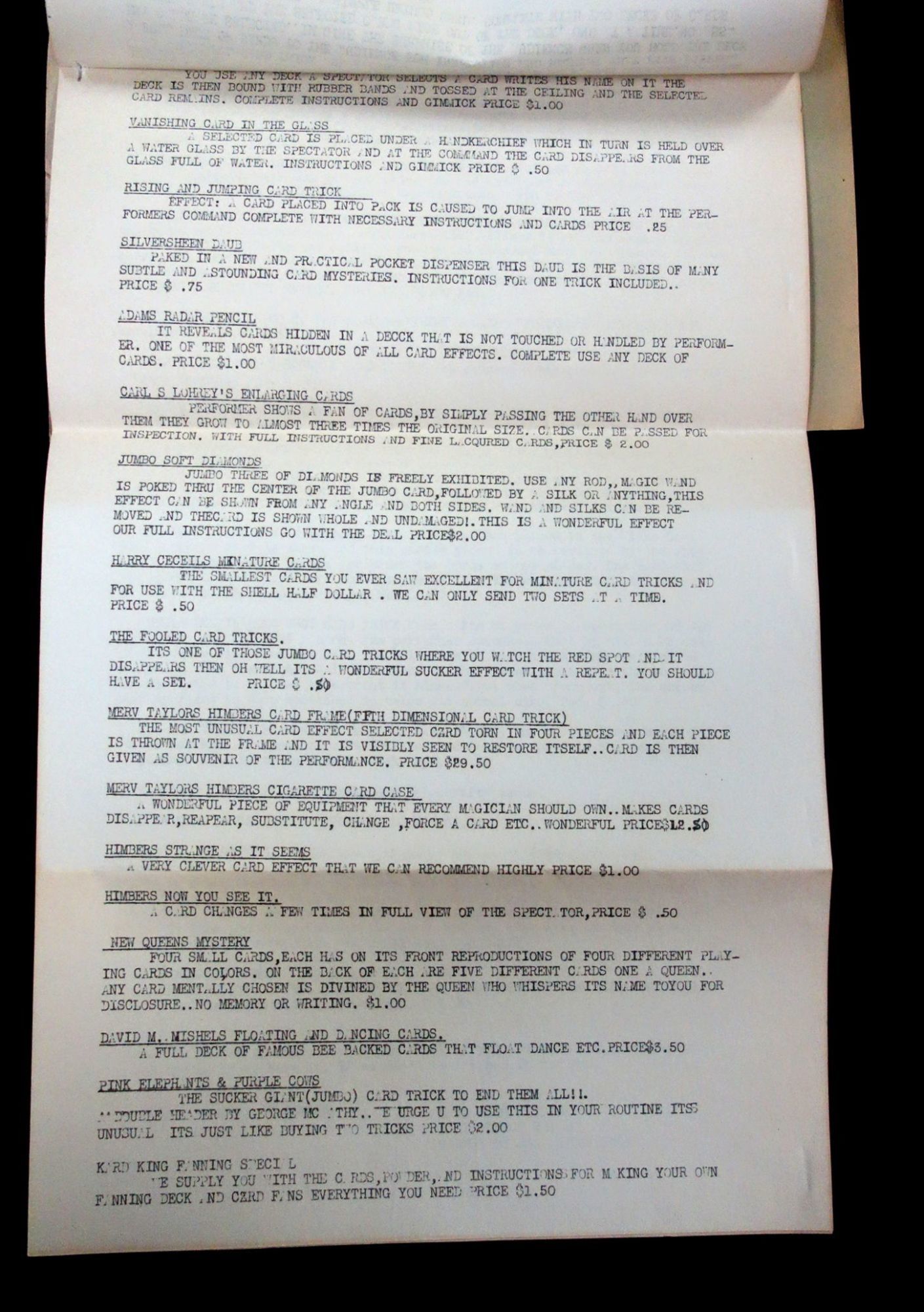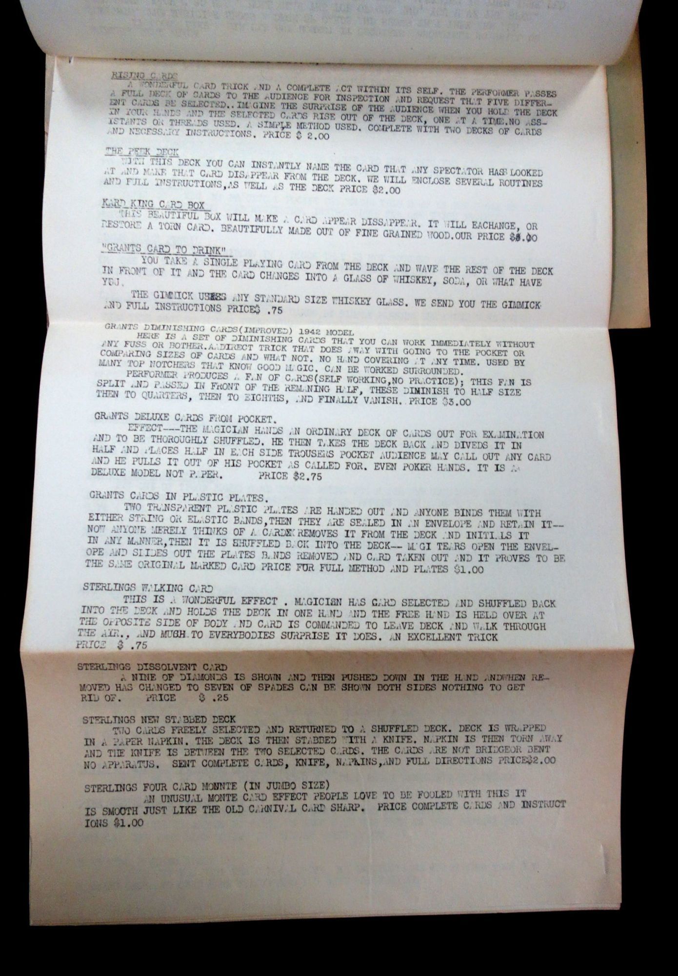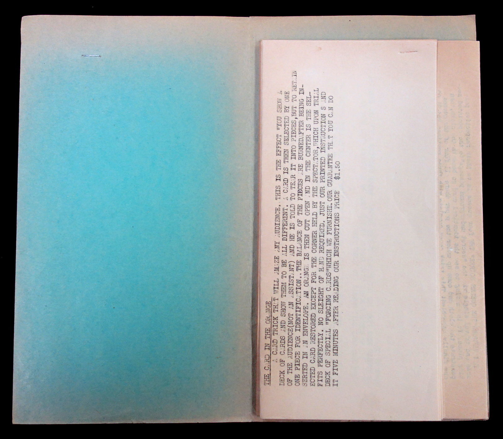 Carmel, CA: Kard King Studios, Sep-45. Light damage to covers. Toning on interior pages.. A trade catalogue about the "art" of card magic. Published by Kard King Studios, a magic shop that specializes in magic done with a deck of cards. The catalogue itself is a single fold blue heavy stock cover, with four legal size pages attached onto the interior with staples. These pages are then folded so that the catalogue is flat. These interior pages list each item currently in stock at Kard King Studios along with a short explanation of the item and the magic trick. There are approximately forty-five (45) items on the list, such as the X-Ray deck (, Miracle Card Trick, Sterlings Walking Card, and the New Queens Mystery. The catalogue is careful to explain the magic trick each item performs without telling the reader how to perform the magic trick itself. The reader would need to purchase the item to receive detailed instructions. For example, for an item called 'The Haunted Desk', the catalogue provides the following instructions: "The performer has three different spectators select and replace three different cards and replace them in three seperate [sic] positions in the deck. The performer then places the deck on his outstretched palm of his Hand. IN a mysterious and haunted fashion the deck begins to move first sideways then backwards to its original position but a card has been left protruding on each side. Again the deck moves forward and then backwards, leaving a card protruding in front. The spectators are asked to remove the protruding cards and they are found to be the previously selected cards. Complete, ready to work, full instructions. Price..... $1.00" The front cover states "This is a copy, No. 112". Measures 9 1/4" x 5 1/4" (folded catalogue), 14" x 8 1/2" (unfolded interior pages).