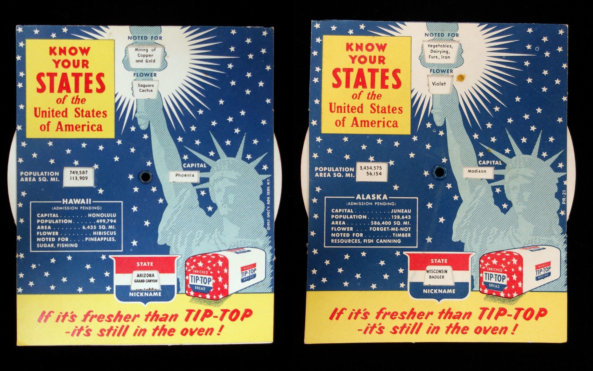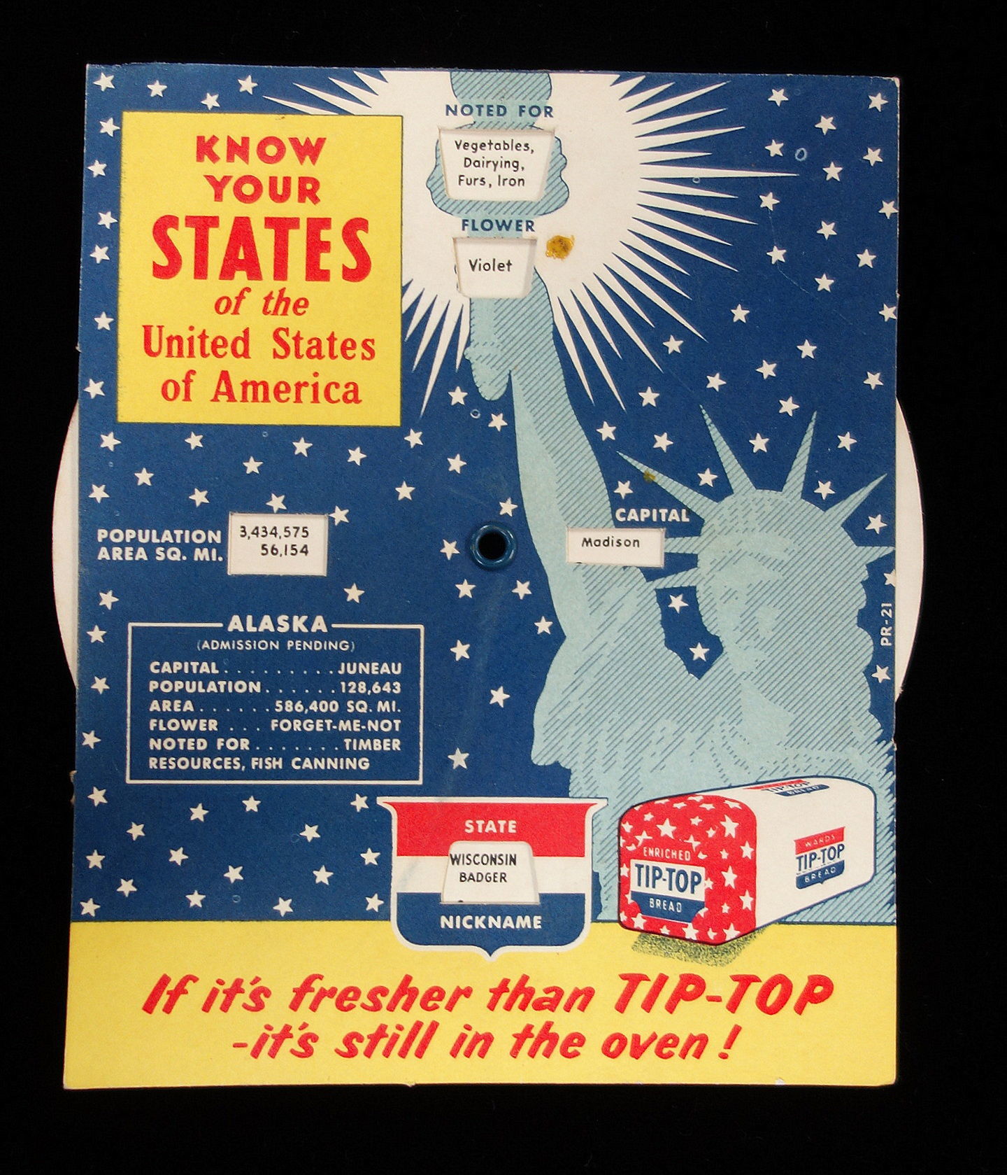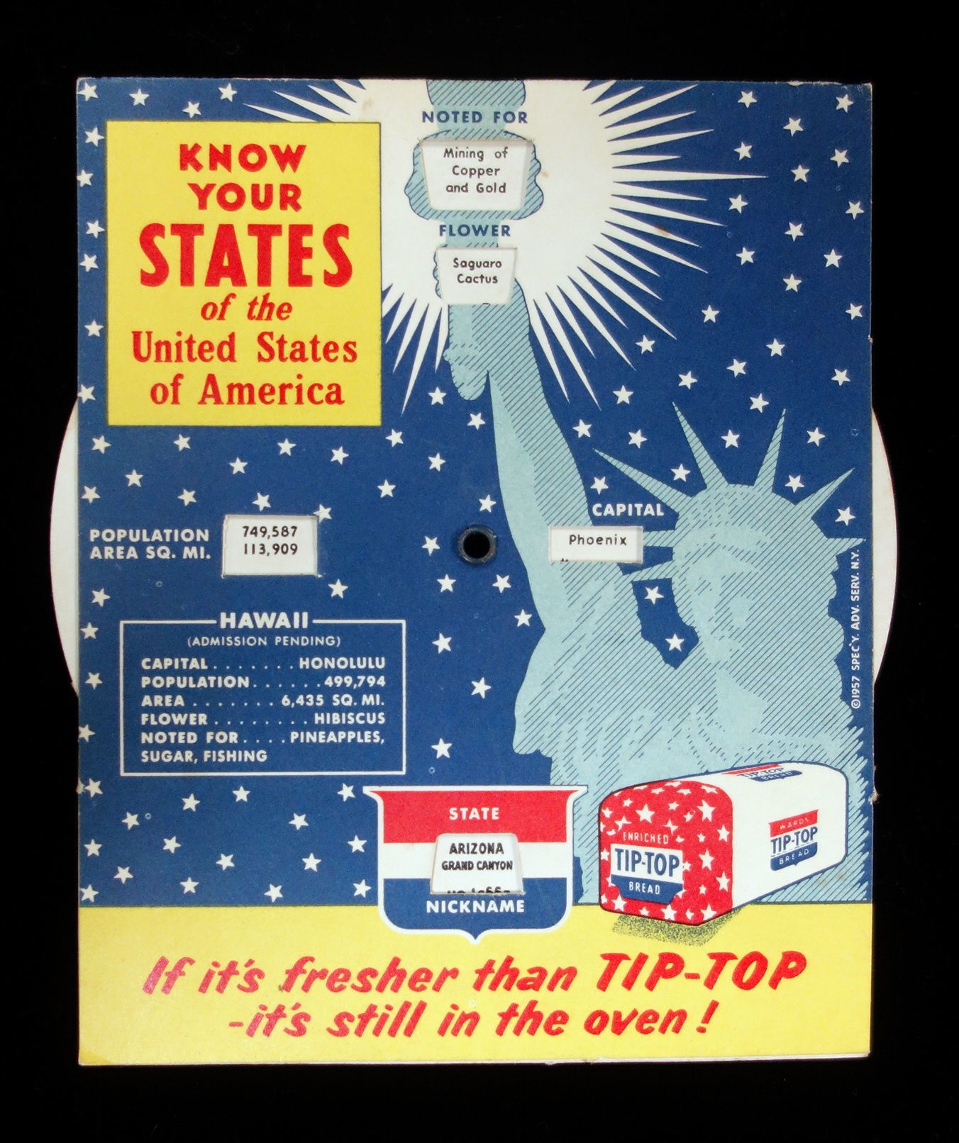 Enriched Tip Top Bread, 1959. A vibrant colorful volvelle created by Enriched Tip Top Bread, both to advertise their bread and also teach the user interesting facts about the individual states. This double sided volvelle, has five openings on each side that reveals a fact about each state as you turn the wheel. For each state you learn its nickname, population, size in square miles, capitol, state flower, and what it is noted for. For example the state of Wisconsin, aka the Badger State, is noted for vegetables, dairying, furs and iron. The volvelle is double side as it only twenty-four states on each side of the wheel. The background of the volvelle has an image of the Statue of Liberty against the night sky. Each side of the wheel has a box of quick facts about Alaska and Hawaii with the note that their admission to statehood is pending. At the base of the volvelle is is Tip Top Bread's motto "If it's still fresher than TIP-TOP -it's still in the oven!" Measures 5 1/4" x 4 1/2