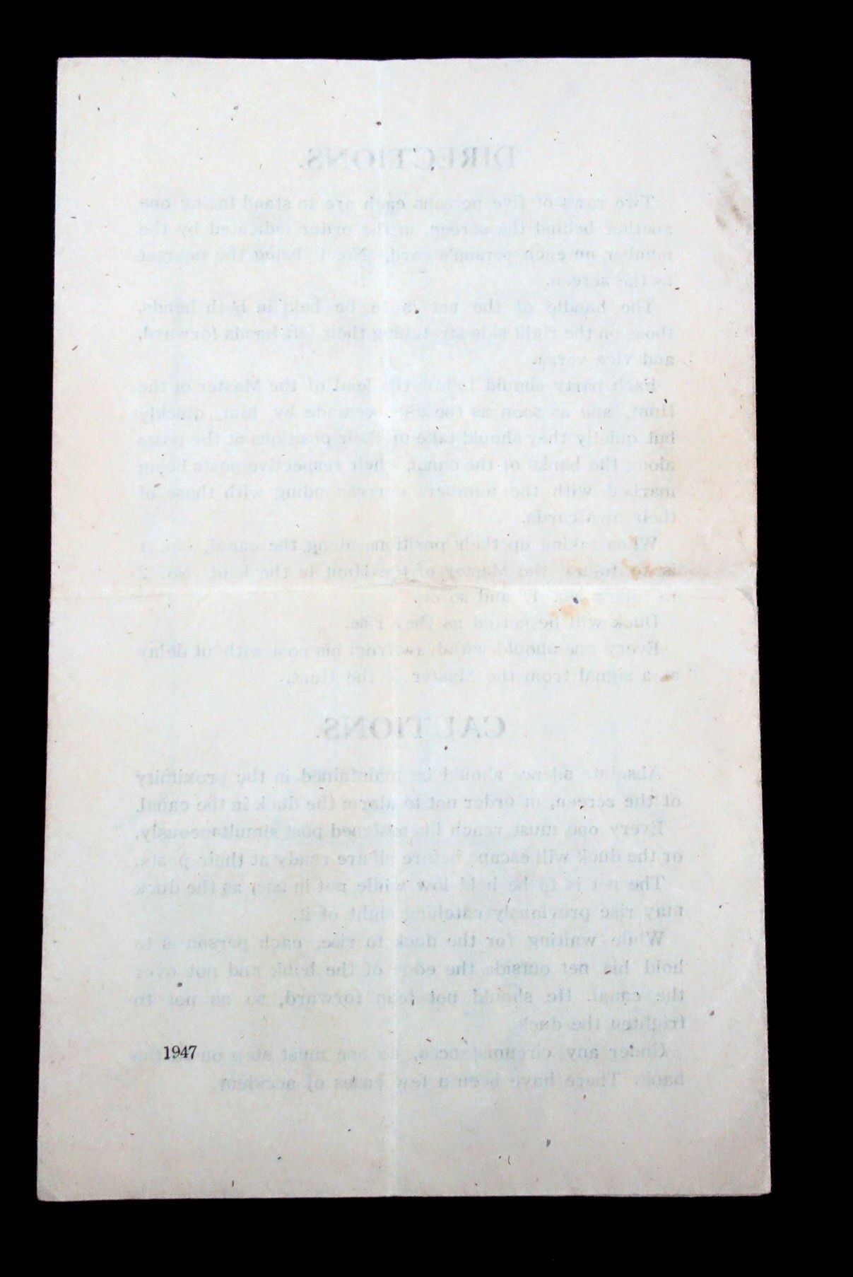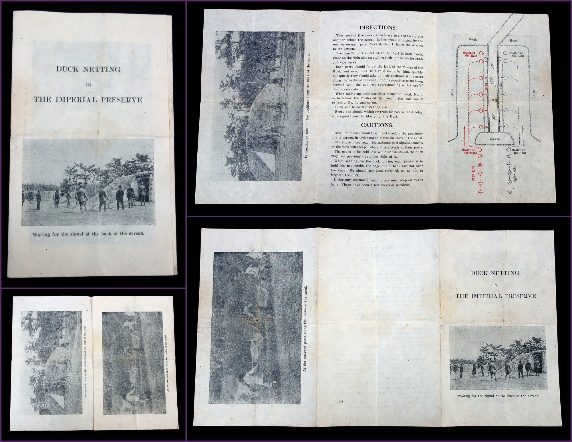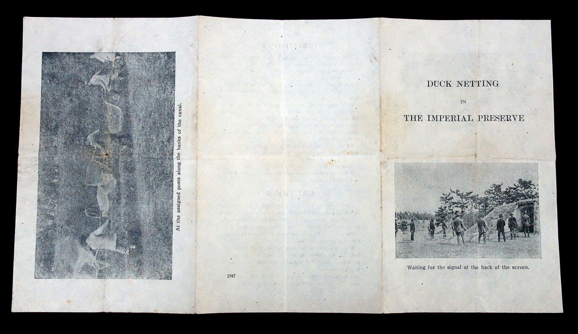 Japan, 1947. Age toning and soiling, crease marks. A tri-fold informational pamphlet on how to participate in the the noncompetitive hunting sport of duck netting. Exclusive to Japan, duck netting is a sport consisting of ten 'players', including a 'Master of the Hunt'. The players work to both startle a duck and swing a large net at the same time in order to ensnare the duck. The pamphlet includes three (3) printed photographs of duck hunting and one instructional diagram on the positions of the different players. The last line of the pamphlet instructs the reader that "under any circumstance, no one must step on to the bank. There have been a few cases of accident." As this pamphlet is printed exclusively in English, and during the occupation of Japan (1945-1952) after WWII, it was mostly likely published for British or American State or military guests. Measures 7 3/4" x 4 3/4" (folded), 14" x 7 3/4" (unfolded).