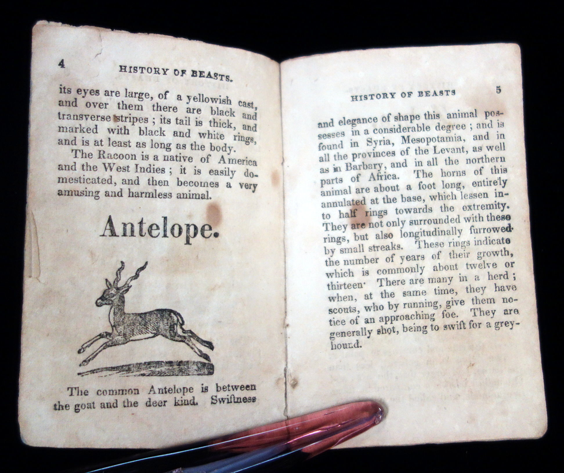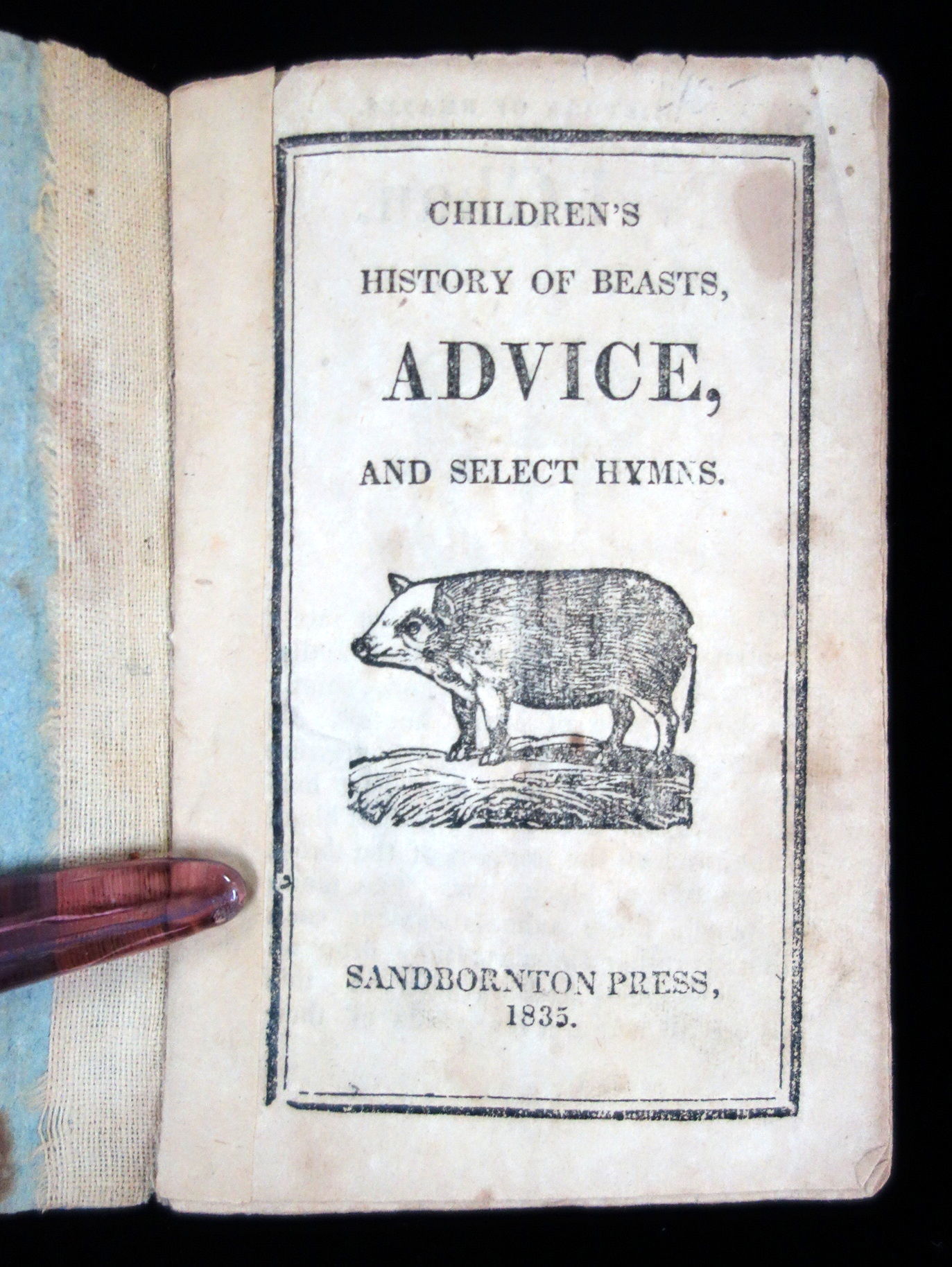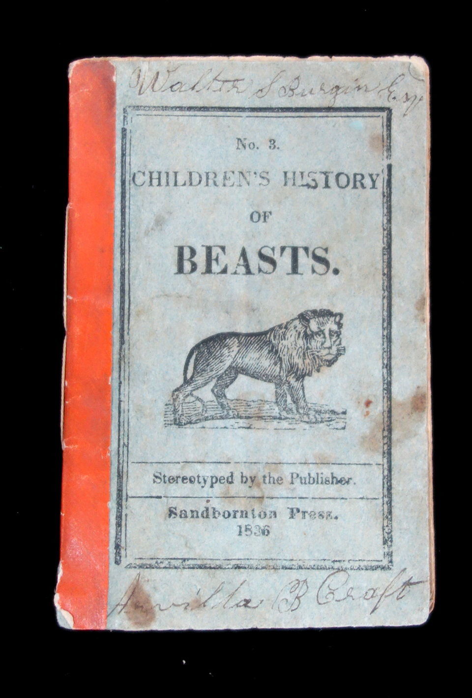 Sanborton, NH: Sanborton Press, 1836. Tape repair to binding. Binding rethreaded. Stains on covers. Inscribed on front cover. Age toning.. This married chap book is actually the front cover of one book, and the text block and back cover of another. Both were published by Sanborton Press. The front cover of the chap book has a picture of a lion on the front and is for "Children's History of Beasts, No. 3" published in 1836 (OCLC 3, Oct 2019), and the text block is for "Children's History of Beasts, Advice, and Select Hymns" published in 1835 (OCLC 9, Oct 2019). The text block is complete (when comparing it to OCLC catalogue). It features an engraving and description of the following animals: Ny-Ghau, Racoon, Antelope, Zebra, and Kangroo. Next are two sections entitled "Address to Children" and "Advice to children", which starts with a short letter to children and then continues on to list five pieces of advice for them. Such as "When you go to the house of God... consider the solemnity of the service." Next is a short poem called "For a Little Child", followed by three hymns: "The Little Pilgrim", "Heaven and Earth" and "Good Every Where". The back cover is most likely a part of the "Children's History of Beasts, Advice, and Select Hymns" as it features an illustration of a zebra and antelope, both of which are described in this book. 16 pages. Green illustrated wrappers. Measures 3 1/4" x 2 1/4.