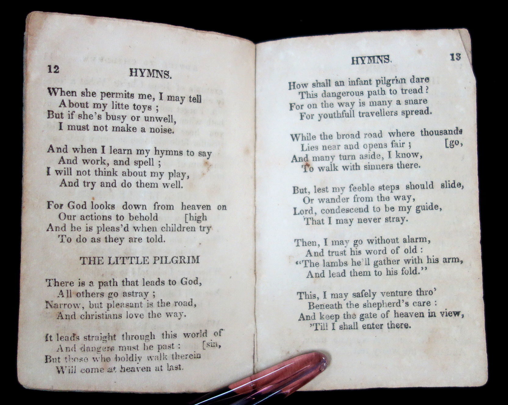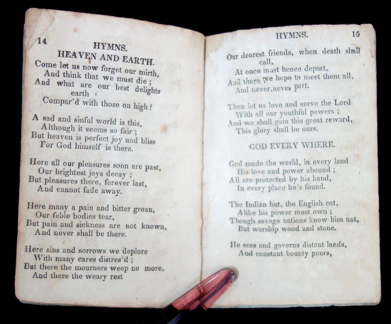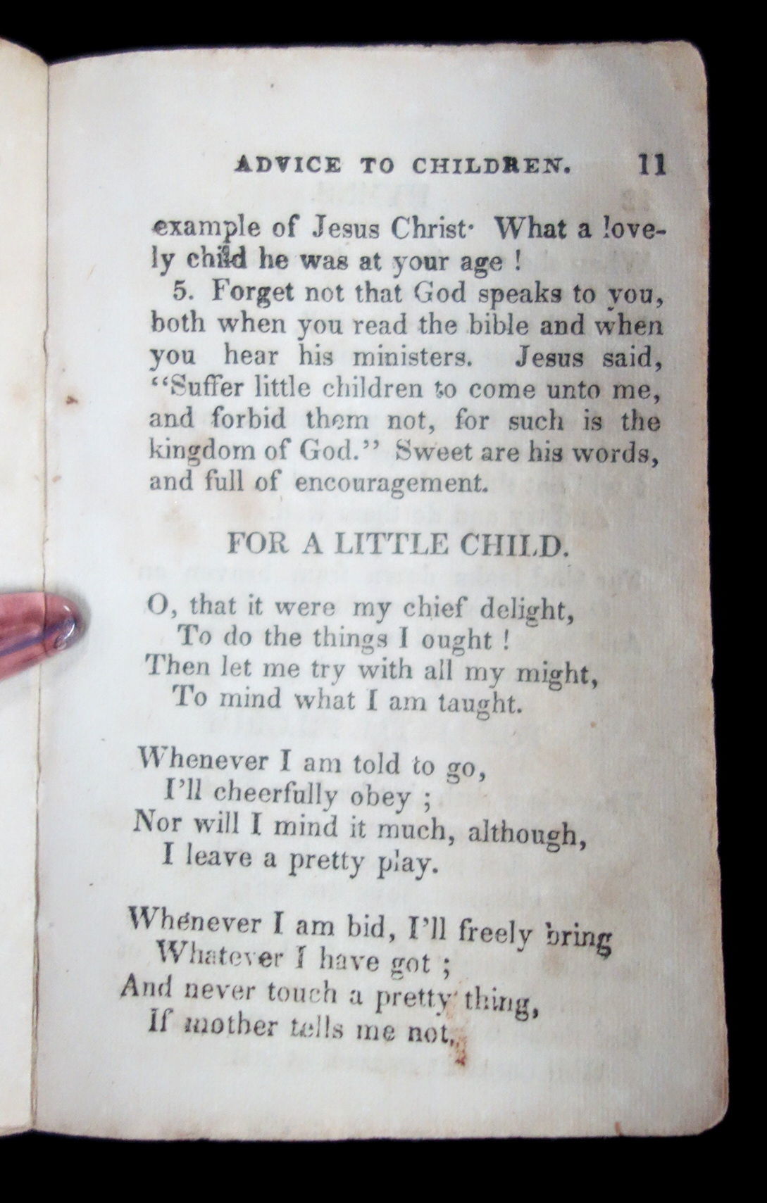 Sanborton, NH: Sanborton Press, 1836. Tape repair to binding. Binding rethreaded. Stains on covers. Inscribed on front cover. Age toning.. This married chap book is actually the front cover of one book, and the text block and back cover of another. Both were published by Sanborton Press. The front cover of the chap book has a picture of a lion on the front and is for "Children's History of Beasts, No. 3" published in 1836 (OCLC 3, Oct 2019), and the text block is for "Children's History of Beasts, Advice, and Select Hymns" published in 1835 (OCLC 9, Oct 2019). The text block is complete (when comparing it to OCLC catalogue). It features an engraving and description of the following animals: Ny-Ghau, Racoon, Antelope, Zebra, and Kangroo. Next are two sections entitled "Address to Children" and "Advice to children", which starts with a short letter to children and then continues on to list five pieces of advice for them. Such as "When you go to the house of God... consider the solemnity of the service." Next is a short poem called "For a Little Child", followed by three hymns: "The Little Pilgrim", "Heaven and Earth" and "Good Every Where". The back cover is most likely a part of the "Children's History of Beasts, Advice, and Select Hymns" as it features an illustration of a zebra and antelope, both of which are described in this book. 16 pages. Green illustrated wrappers. Measures 3 1/4" x 2 1/4.