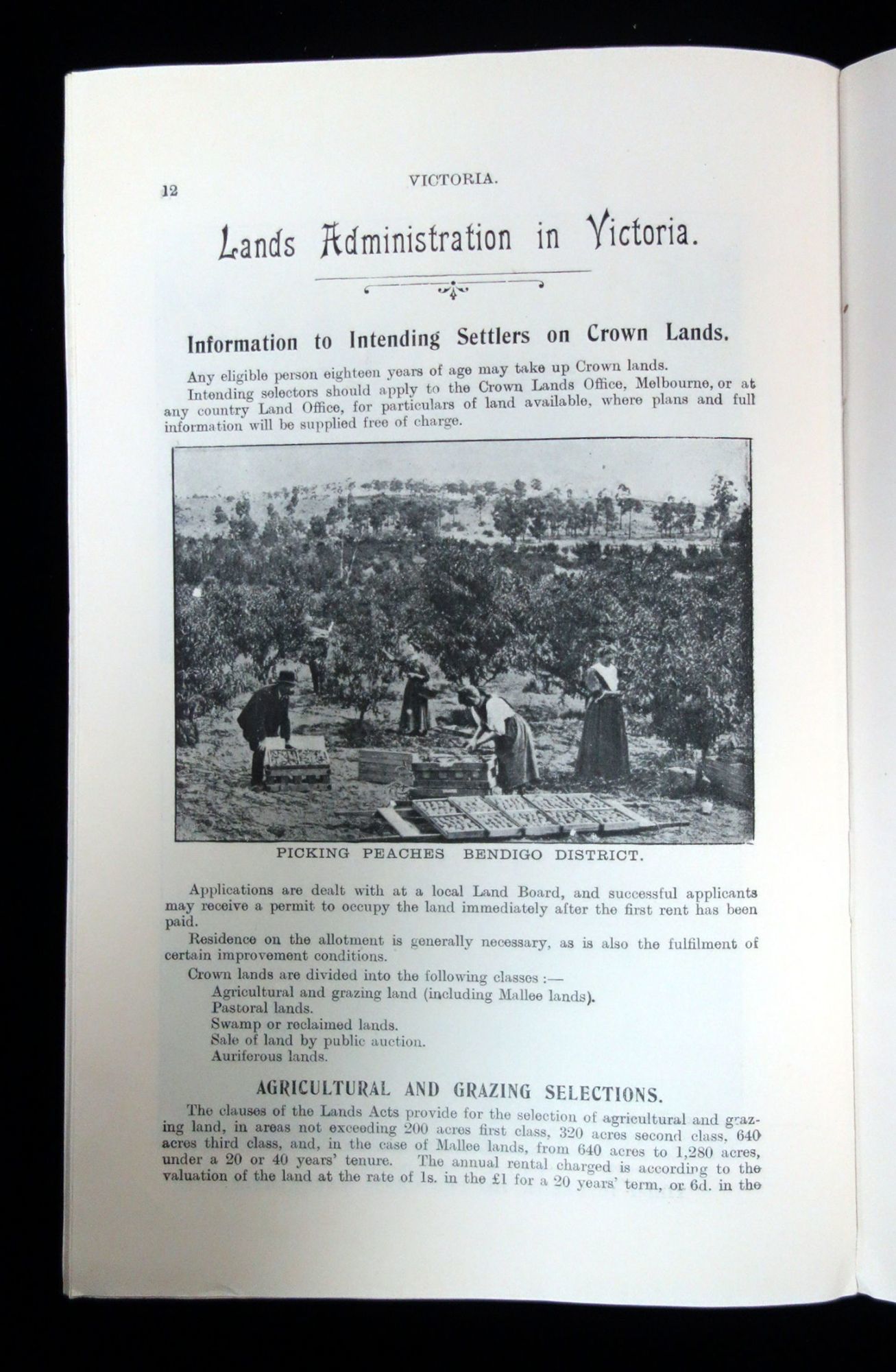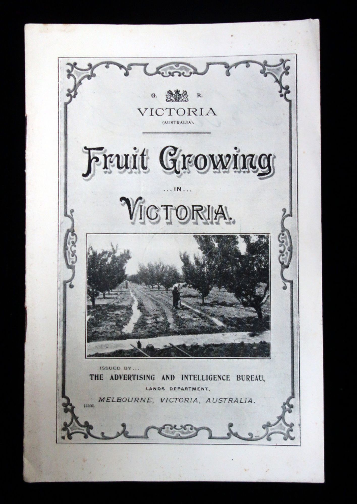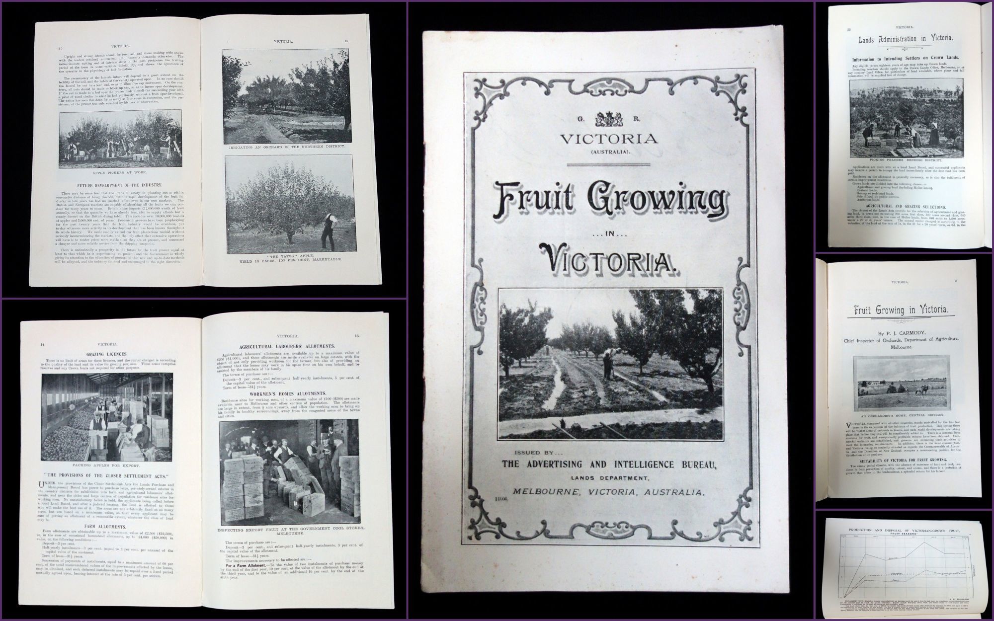 Melbourne, Victoria, Australia: Advertising and Intelligence Bureau, Lands Department, 1909. Age toning.. An advertising booklet meant to attract farmers into establishing fruit farms in the Victoria, Australia. The main portion of the booklet is written by Patrick Joseph Carmody who was the Chief Inspector of Orchards for the Department of Agriculture in Melbourne. He asserts that "Victoria, compared with all other countries stands unrivaled for the last few years in the expansion of the industry of fruit production." The rest of the booklet discusses the suitability of Victoria for fruit growing, how to dispose of the produce, state assistance offered to growers, the approximate cost to set up, the variety of fruit one can plant (Jonathan Apple, Cleopatra apple, Winter Nelis pear, etc.), pruning, and future development in the industry. Additionally, there is a smaller section dedicated to the 'Lands Administration in Victoria', where it provides information and advise on how to get land by various means, such as auriferous (rental) lands, lands by auction, and swamp/reclaimed lands, as well as the different types of land sites (business, garden, or residential). It also provides information on the various licenses one might need, such as grazing and bee farm licenses. Lastly there is a small section on the agricultural laborer's allotments as well as their home allotments. Approximately fifteen (15) printed black and white photographs. Advertisements on the inside covers. 16 pg. Pictorial wrappers. Staple Binding. Measures 8 1/2" x 5 1/2