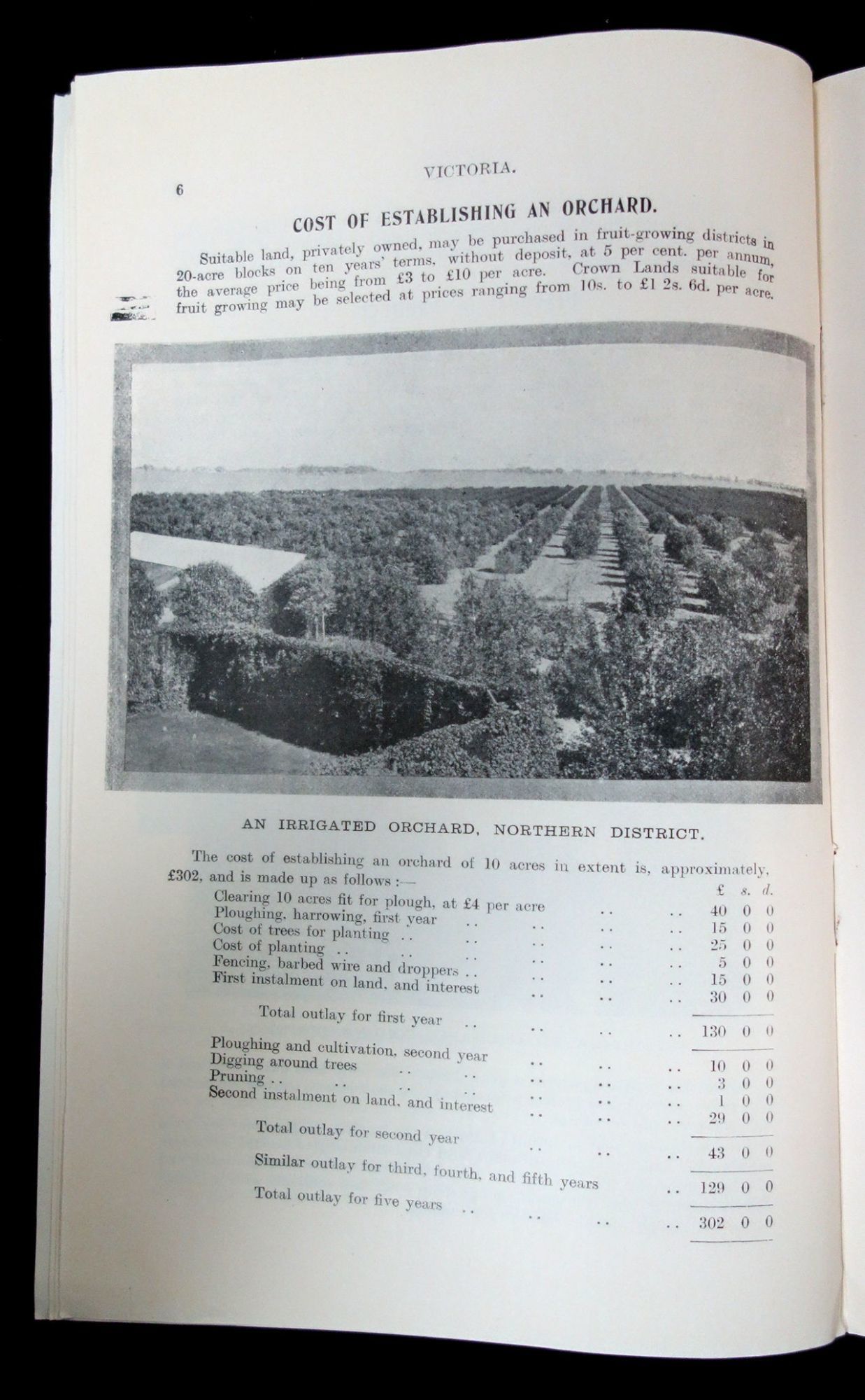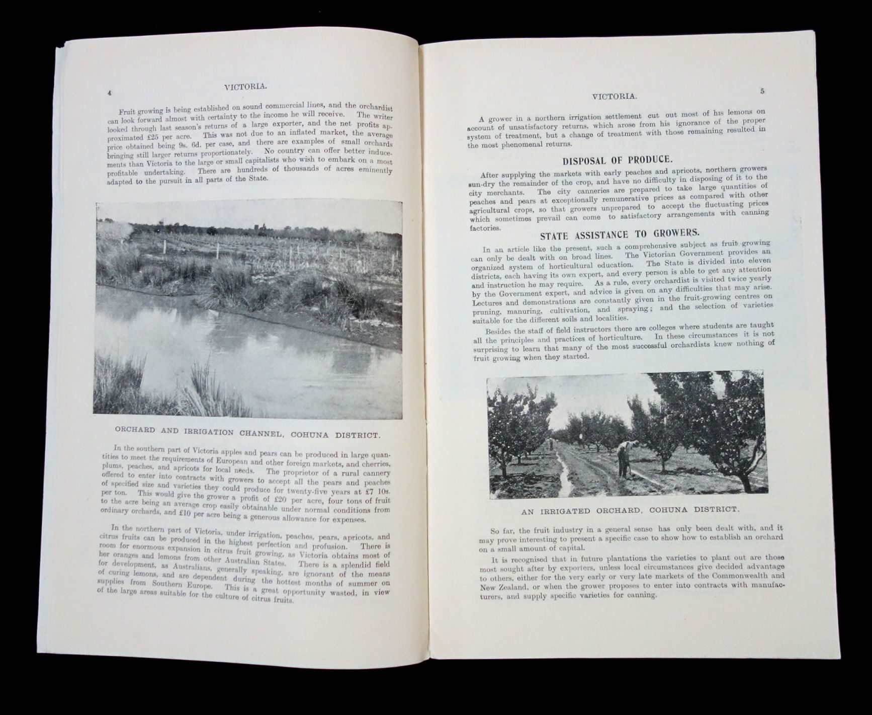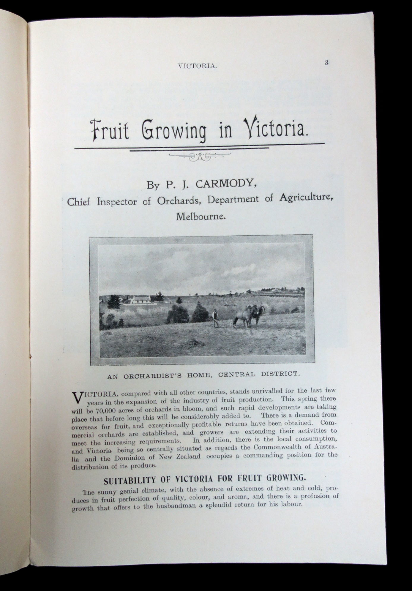 Melbourne, Victoria, Australia: Advertising and Intelligence Bureau, Lands Department, 1909. Age toning.. An advertising booklet meant to attract farmers into establishing fruit farms in the Victoria, Australia. The main portion of the booklet is written by Patrick Joseph Carmody who was the Chief Inspector of Orchards for the Department of Agriculture in Melbourne. He asserts that "Victoria, compared with all other countries stands unrivaled for the last few years in the expansion of the industry of fruit production." The rest of the booklet discusses the suitability of Victoria for fruit growing, how to dispose of the produce, state assistance offered to growers, the approximate cost to set up, the variety of fruit one can plant (Jonathan Apple, Cleopatra apple, Winter Nelis pear, etc.), pruning, and future development in the industry. Additionally, there is a smaller section dedicated to the 'Lands Administration in Victoria', where it provides information and advise on how to get land by various means, such as auriferous (rental) lands, lands by auction, and swamp/reclaimed lands, as well as the different types of land sites (business, garden, or residential). It also provides information on the various licenses one might need, such as grazing and bee farm licenses. Lastly there is a small section on the agricultural laborer's allotments as well as their home allotments. Approximately fifteen (15) printed black and white photographs. Advertisements on the inside covers. 16 pg. Pictorial wrappers. Staple Binding. Measures 8 1/2" x 5 1/2