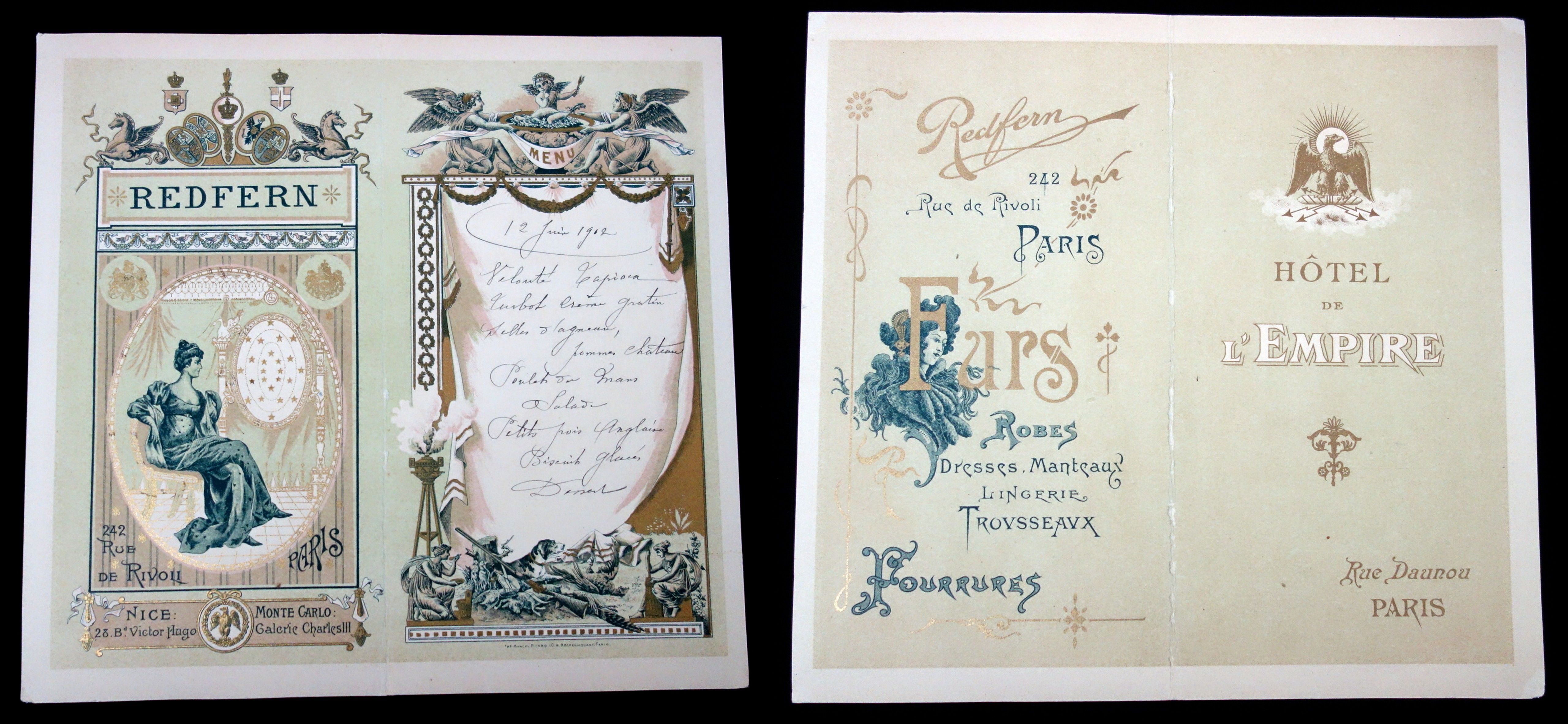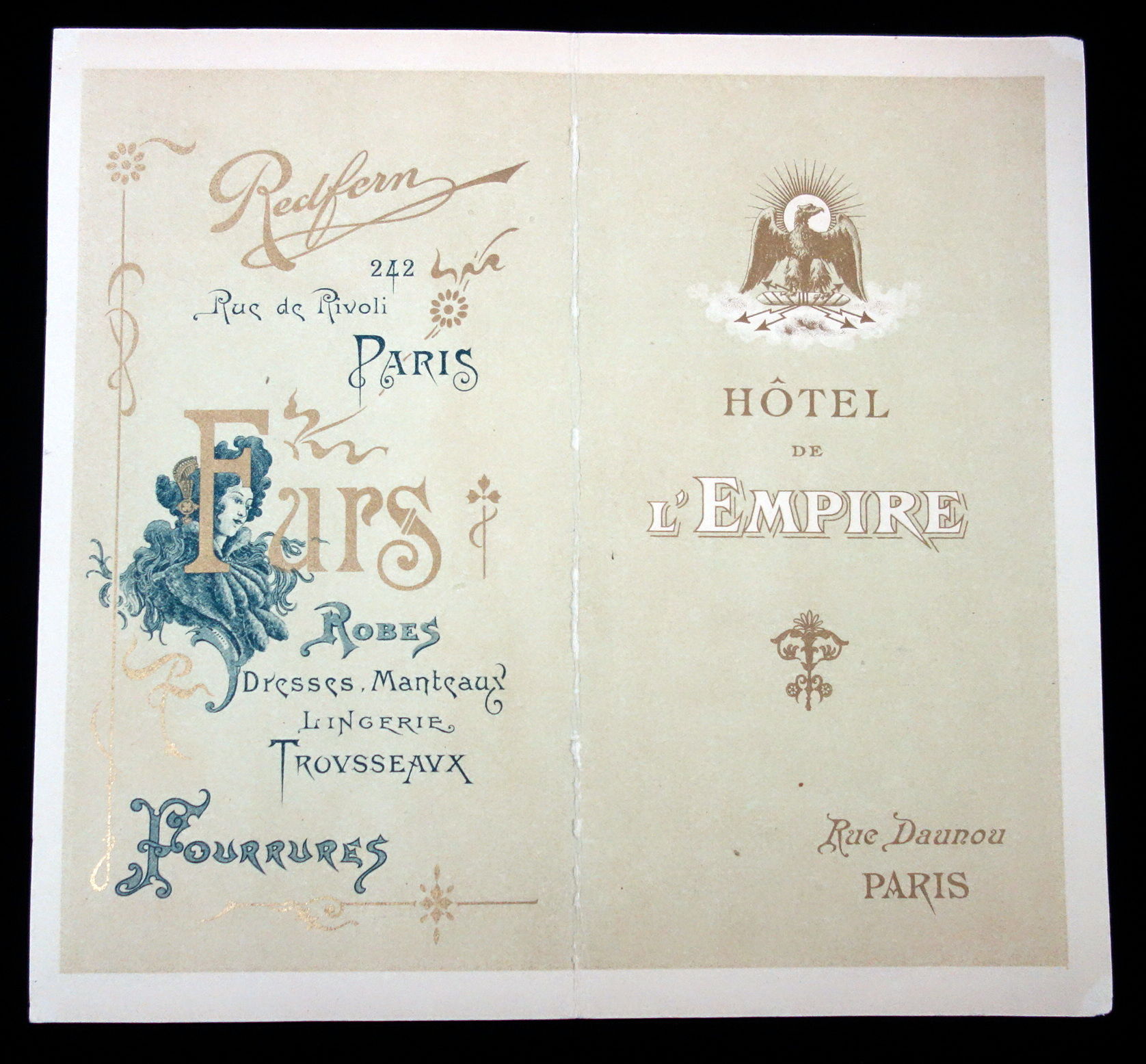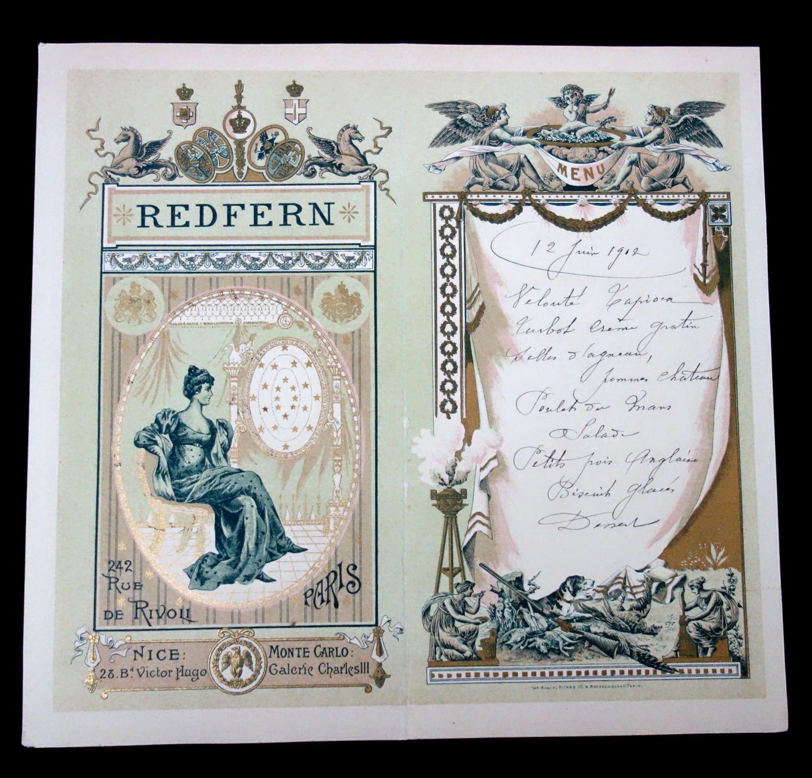 Paris, France: MP Marcel Picardo, 12-Jun-02. A single fold menu for Hotel de L'Empire located in Paris, France. The menu is most likely for their hotel restaurant and is dated June 12, 1902. That night dinners had a choice been Turbot (fish) in a cream sauce or chicken. The hotel was located at No. 7 Rue Daunou and is no longer in existence (though there is a hotel by the same name currently in Paris). The menu also has an advertisement for Redfern, a store in Paris that sold Furs, Robes, Dresses, Manteaux (coats), Lingerie and Trousseaux. Refern was a British tailoring firm founded in 1855 by John Redfern that had several stores across Europe. Its Paris extension was operated as a couture establishment which developed into a leading European Couture house, while its other branches were mostly tailors and/or importers. The Paris branch closed in 1940. The menu, as well as advertisement, have gilded decorative elements with the Refern advertisement featuring a high society lady dressed in a fashionable attire, and the menu depicting a hunting scene with a dog, rifle, and dead hare. Measures 9" x 8 1/4"