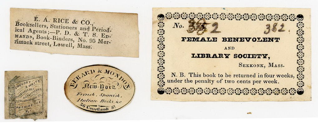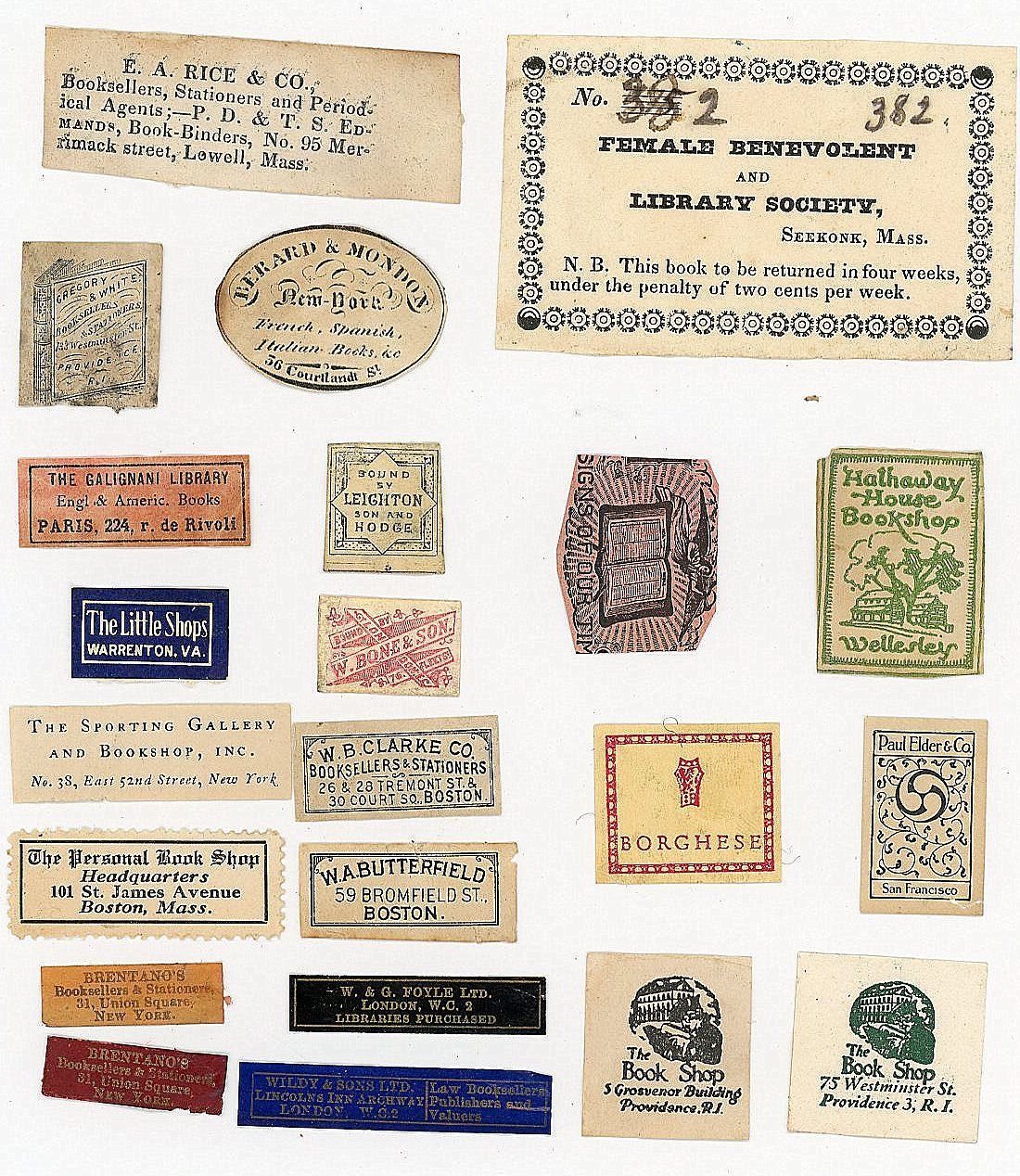 1920. Age toning.. A collection of twenty-two (22) bookseller labels (also called Bookseller Tags) from the 18th and 19th centuries. One of the more unique and largest labels in the collection is from the Female Benevolent and Library Society. This was a small library founded in 1825 by the female members of the town of Seeknok, MA. This society formed the basis of what has become the town's Public Library that is still in operation today. The next earliest labels are Berard & Mondon and E. A. Rice & Co. and based on store records and addresses, they date from between 1834-1842 and 1836-1840. The majority of the labels are from the New England/New York era, but several are from Europe, London and Paris more specifically. There are two sets of labels from the same store, Brentano's Booksellers & Stationers and The Book Shop, however the labels themselves are different. The Brentano's tags are two different colors, red and orange, while The Book Shop's tags are from two different locations. The labels range in size from 1" x 1/4" up to 2 3/4" x 1 3/4". Below is a list of all the labels in the collection, as well as the location of the bookseller.