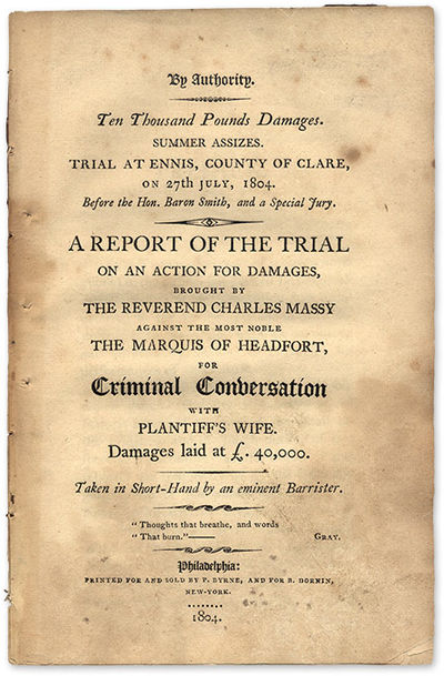 1804. Philadelphia & New York, 1804.. Philadelphia & New York, 1804. Designed to Display the Corruption of the Irish Nobility [Trial]. Taylour, Thomas, Marquess of Headfort [1757-1829], Defendant. A Report of the Trial on an Action for Damages Brought by the Reverend Charles Massy Against the Most Noble the Marquis of Headfort, For Criminal Conversation With Plaintiff's Wife: Damages Laid at ?40,000. Philadelphia: Printed and Sold by P. Byrne, And for B. Dornin, New-York, 1804. vii, 95 pp. Octavo (8" x 5-1/4"). Disbound stab-stitched pamphlet. Light soiling to exterior, a few minor tears and chips to edges of a few leaves, stitching loose, first signature detached. Light browning to text, faint dampstaining to foot of text block, light foxing to a few leaves. $950. * Only American edition. At head of title: Ten Thousand Pounds Damages, Summer Assizes, Trial at Ennis, County of Clare, on 27th July, 1804, Before the Hon. Baron Smith, And a Special Jury. The Marquis of Headfort, a member of the Irish House of Commons, eloped with the wife of a clergyman, who was awarded ?10,000 damages. The Patrick Byrne and Bernard Dornin were Irish political radicals living in exile. Published shortly after its printing in Ireland, this American imprint, which was issued in New York and Philadelphia, was probably issued to display the corruption of the Irish nobility. Cohen, Bibliography of Early American Law 12010.