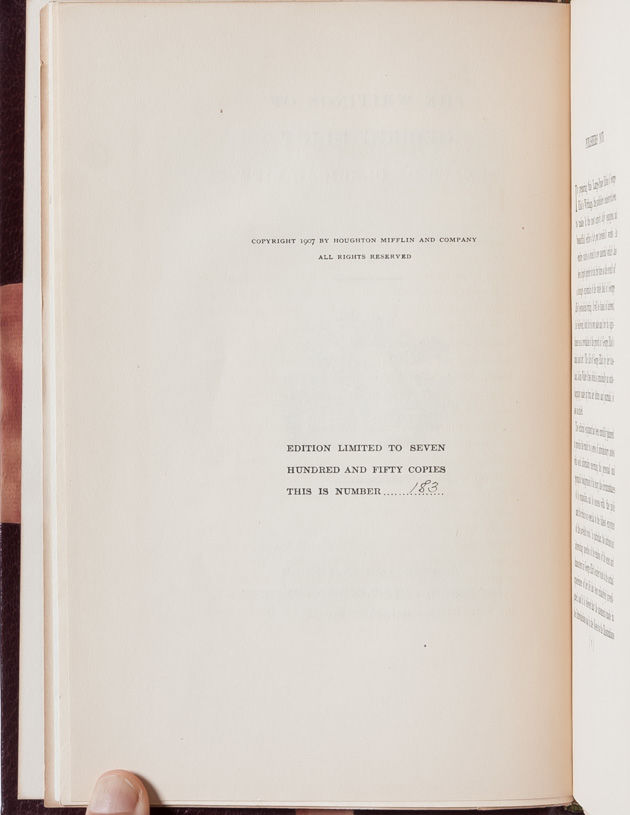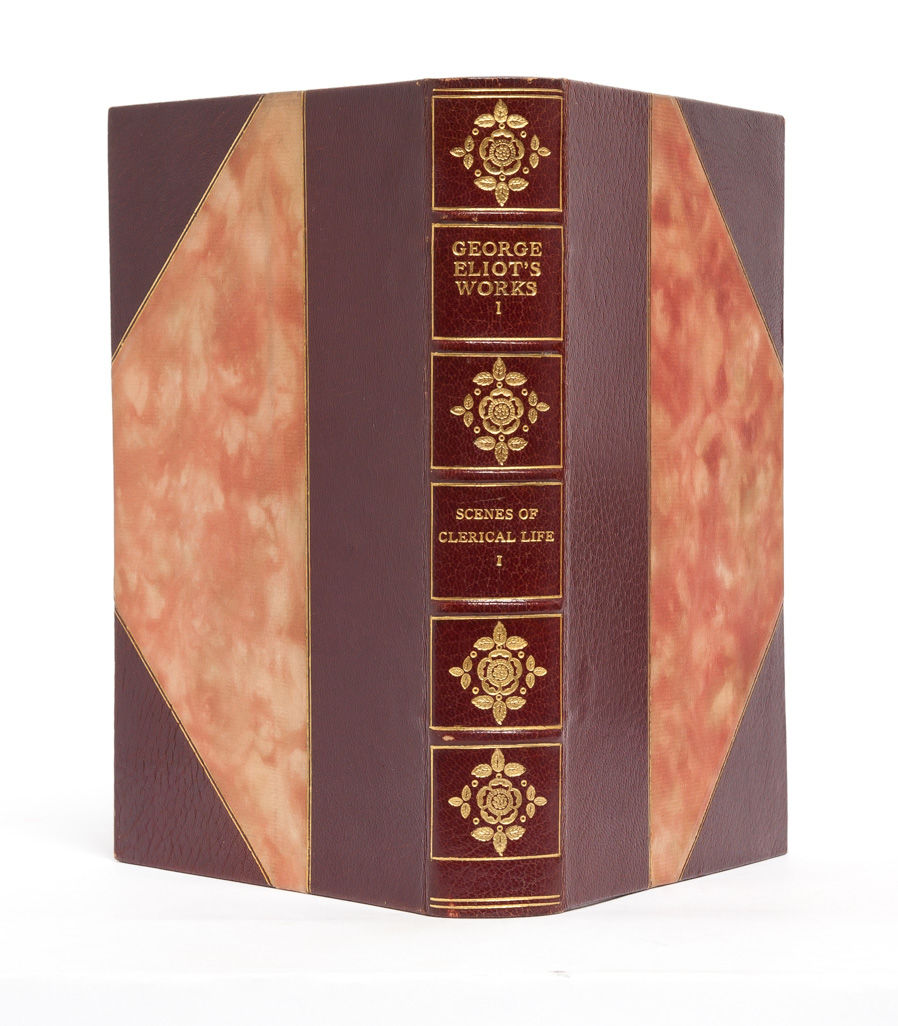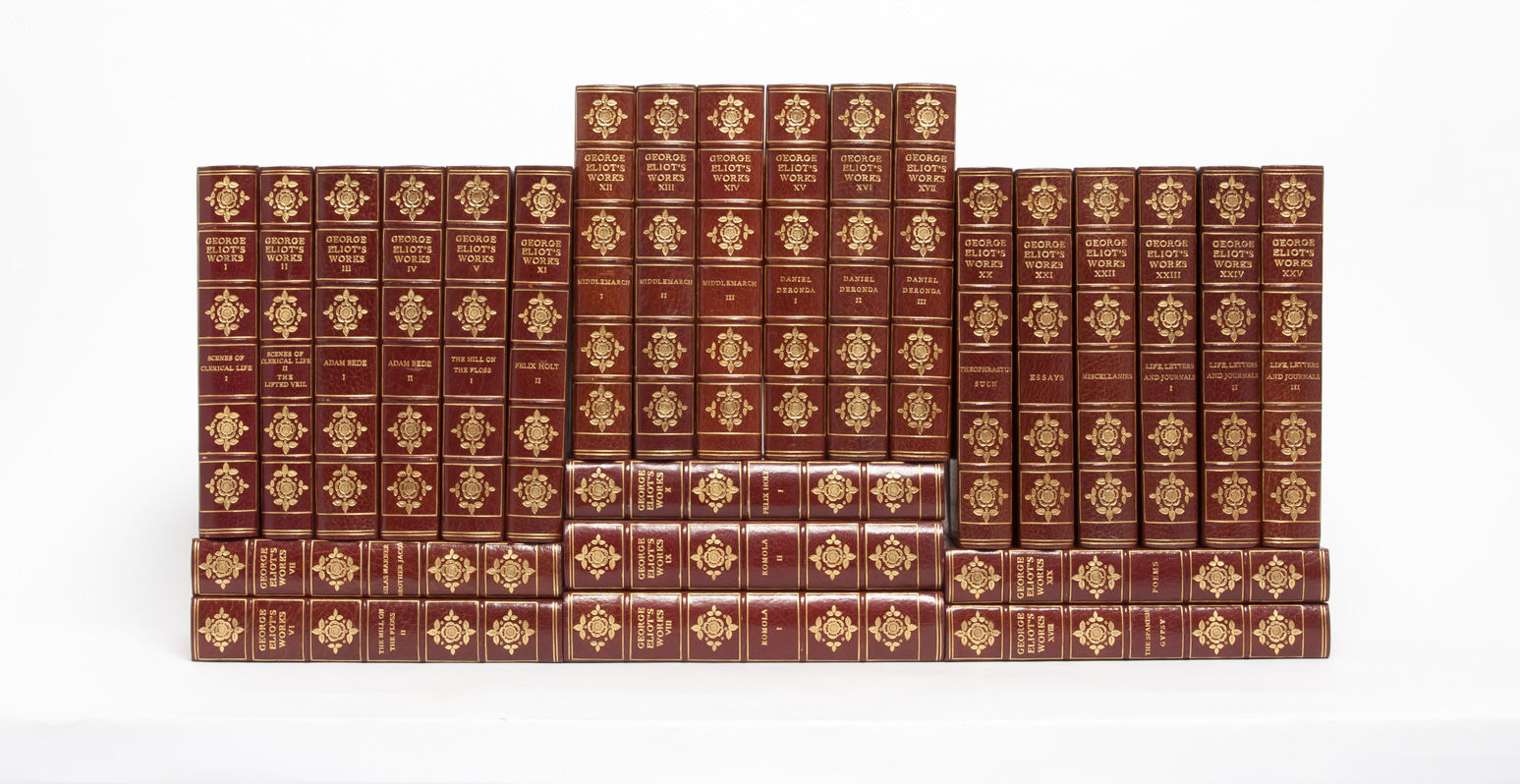 Boston: Houghton Mifflin, 1907. First thus. Fine. Large Paper Edition limited to 750 of which this is 183. Finely bound in half crushed morocco over marbled boards with gilt to spines. Twenty-five volumes (6 1/4 x 9 inches) occupying approximately 37 1/2 inches(95 1/4 cm.) of shelf space. Top edges brightly gilt. Remaining edges deckled. The following volumes signed in pencil by the illustrators: in volume one by C. E. Walmsley, eight by Ambrose Dudley, ten by Archibald Standish Hartrick, twelve by by Charles E. Brock, and sixteen by Frederick Pegram. In all a beautiful and pleasing illustrated set of George Eliot's works, which helped define the novel as a genre and brought women's experiences and inner lives into public dialogue.