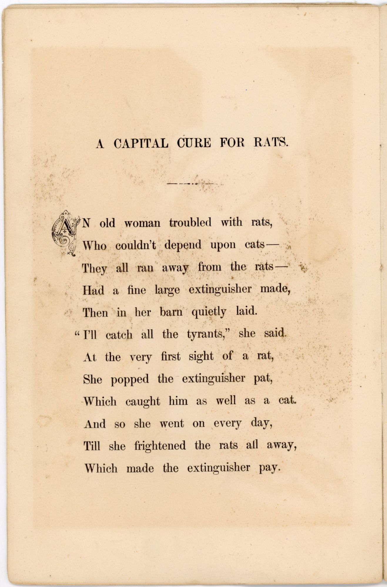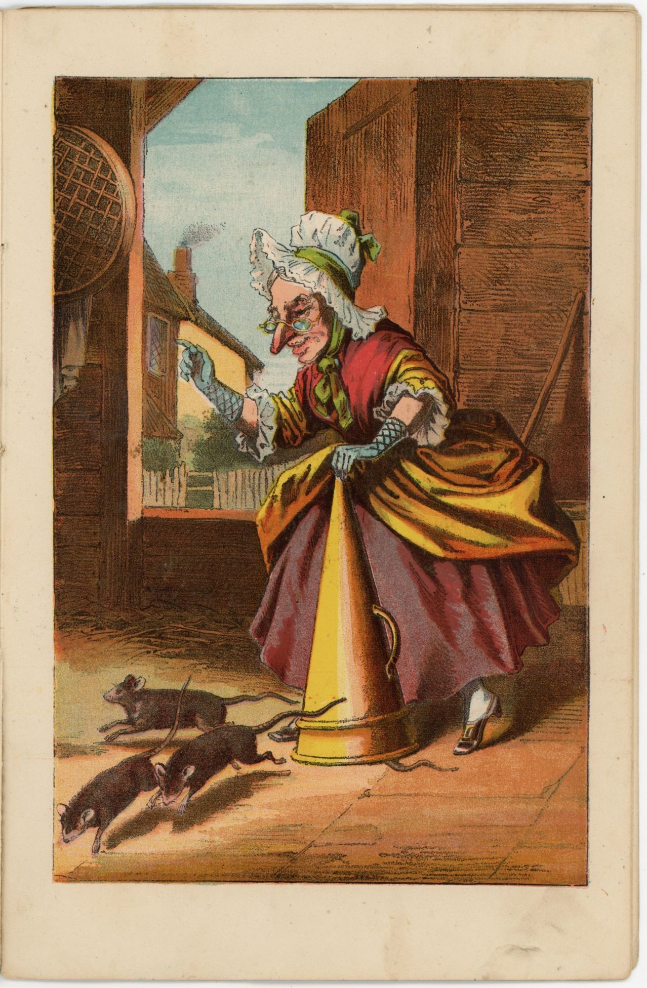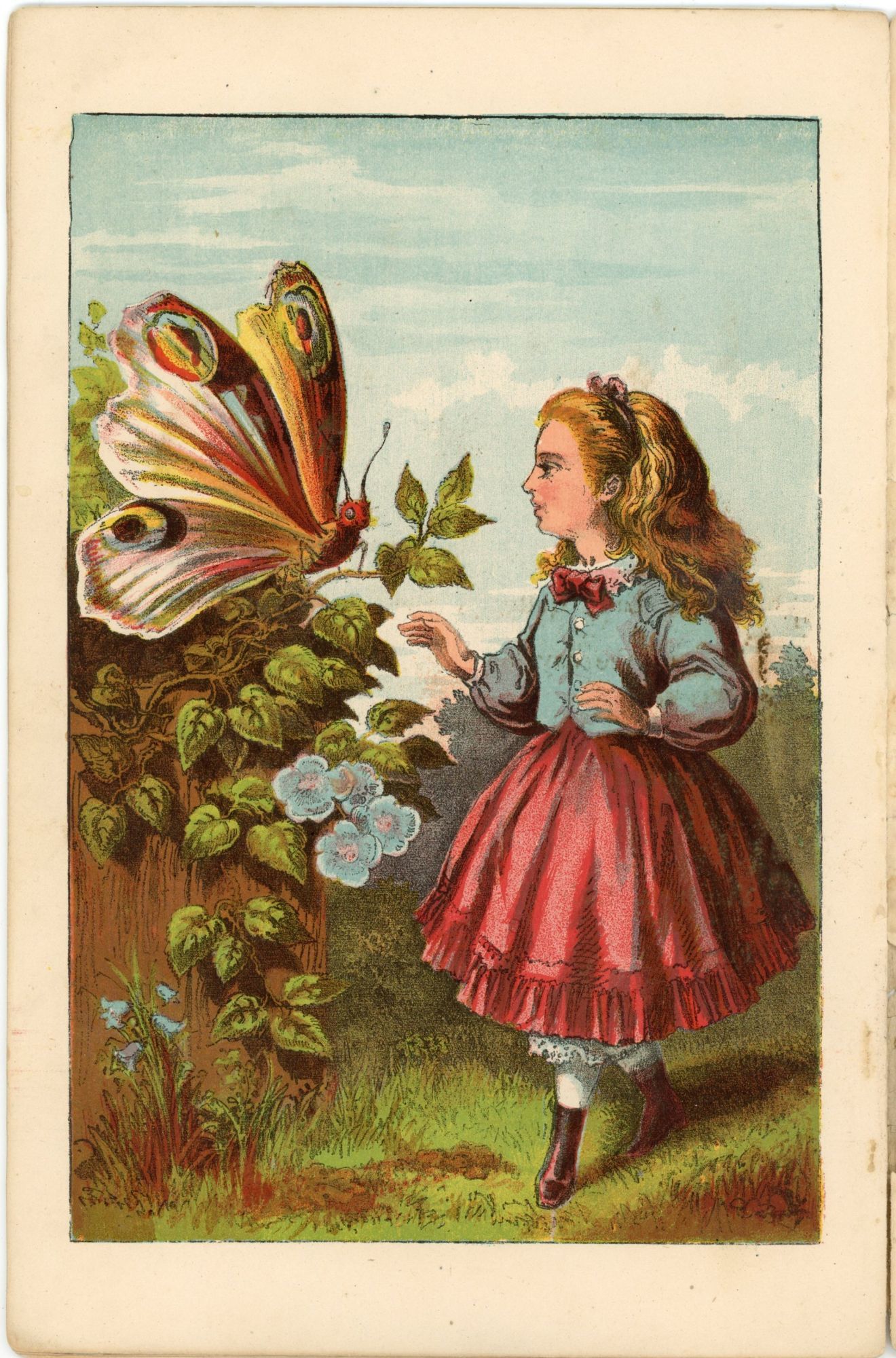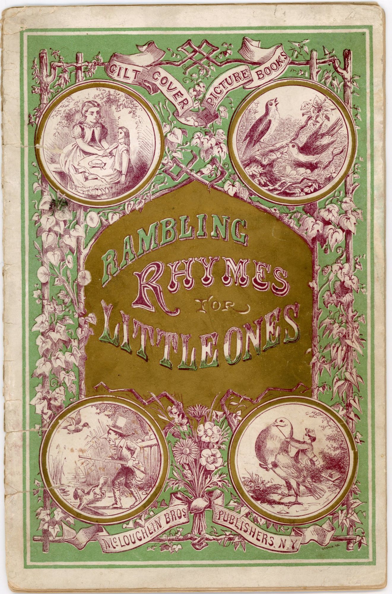 New York: McLoughlin Bros. Cover almost completely separated from the pages, several 1" tears along the spine, foxing and minor discoloration on pages. 8 leaves, one-sided; white paper wrapper with illustrations and decorative elements on the front cover, printed in green, brown and gilt. Includes four stories: The Little Man and His Gun -- The Selfish Old Woman -- A Capital Cure For Rats -- How Lady Butterfly Spent the Day. Total of 4 full-page color illustrations, with one for each story. Back cover lists the titles in the "New Picture Books For Little Children" series. 6 3/4" x 10 1/4