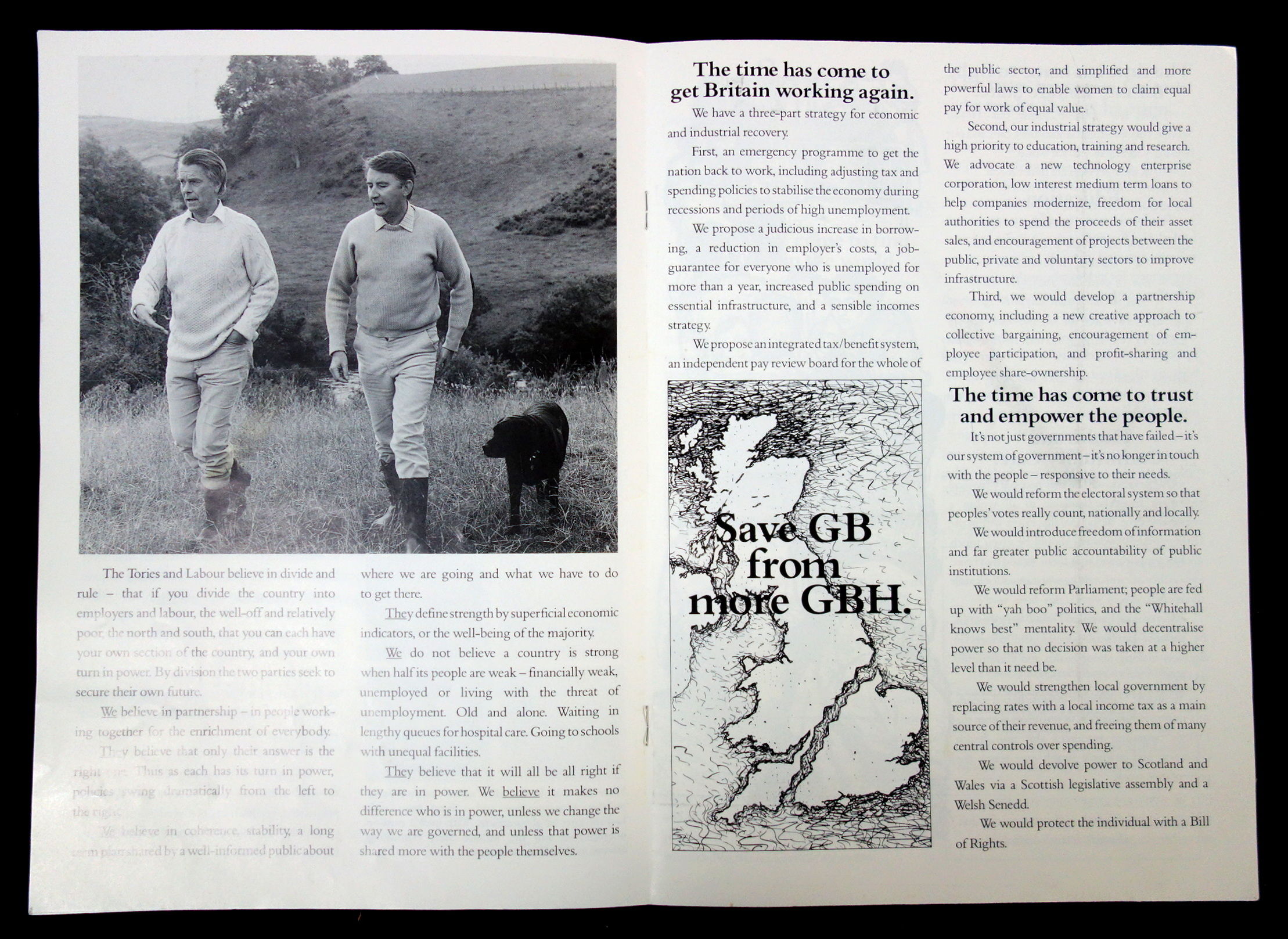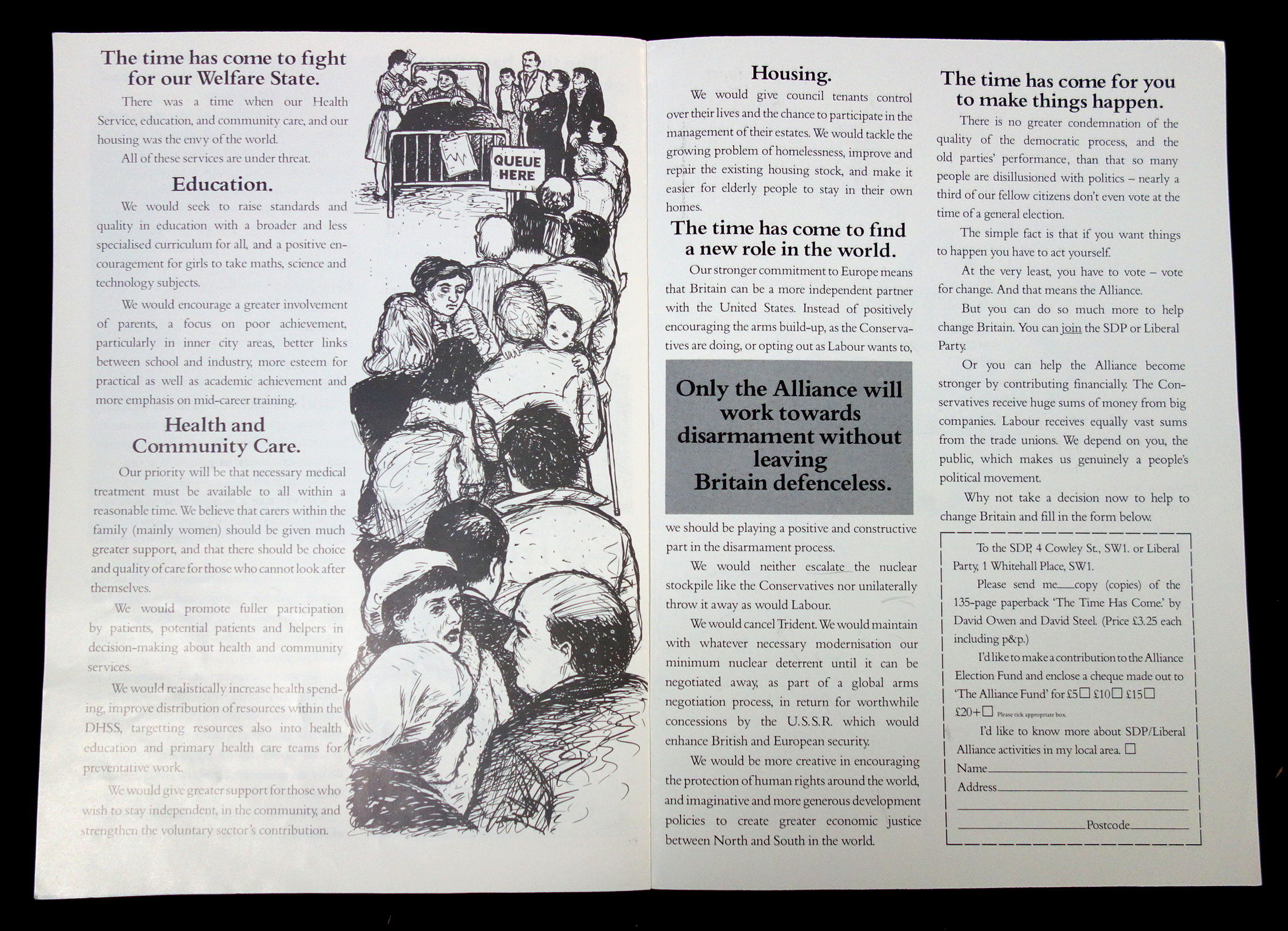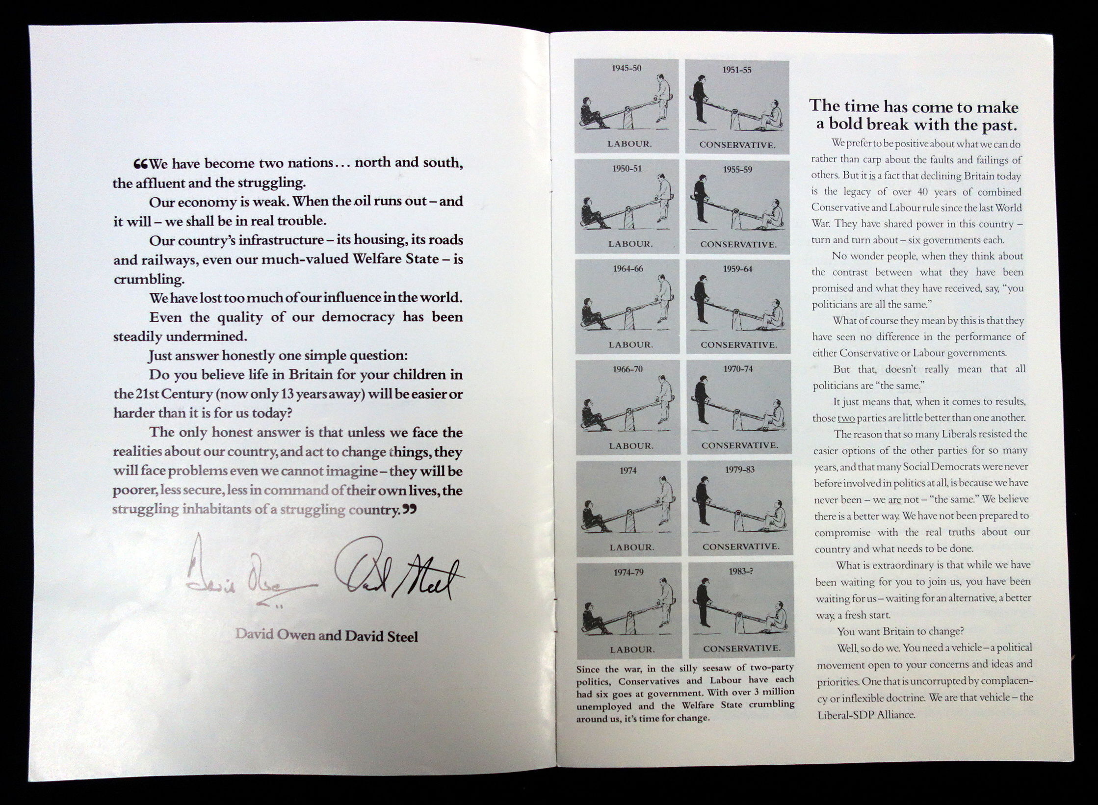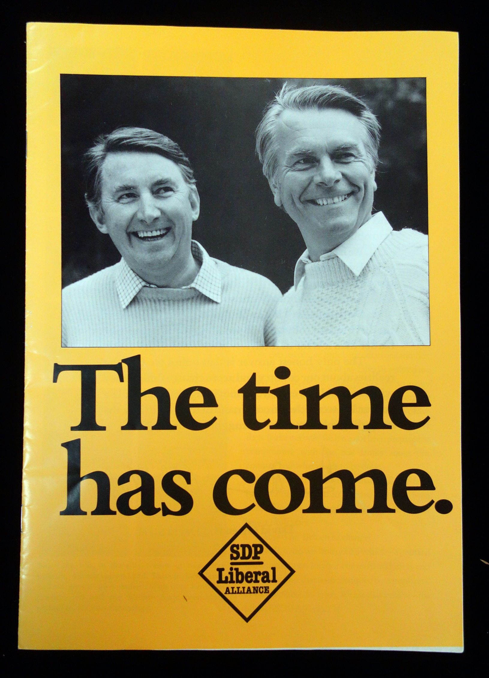 West Yorkshire, UK: Hebden Royd Publications, 1987. As new.. A political propaganda booklet for the SPD - Liberal Alliance, a British political party, most likely dating from the 1987 UK General Election, were their slogan was "Britain Untied: The Time Has Come." The cover of the booklet features a photo (and letter inside) from David Steel and David Owen leaders of the Liberal Party and SDP respectively. The rest of the booklet features messaging about their goals, particular in the arenas of education, heath and community care, and housing. It often bolds various lines starting with the phrase "the time has come". Such as "the time has come to get Britain working again", "the time has come to fight for our welfare state" and "the time has come to find a new role in the world." At the end of booklet is a small cut out donation form for the Alliance Election Fund. Yellow covers. Measures 11 3/4" x 8" The SDP - Liberal Alliance was a centrist political and electoral alliance in the UK first established in 1981 between the Social Democratic Party (SDP) and the Liberal Party. The alliance ended in 1988 when the two parties officially combined into the Social and Liberal Democrats (later renamed the Liberal Democrats).