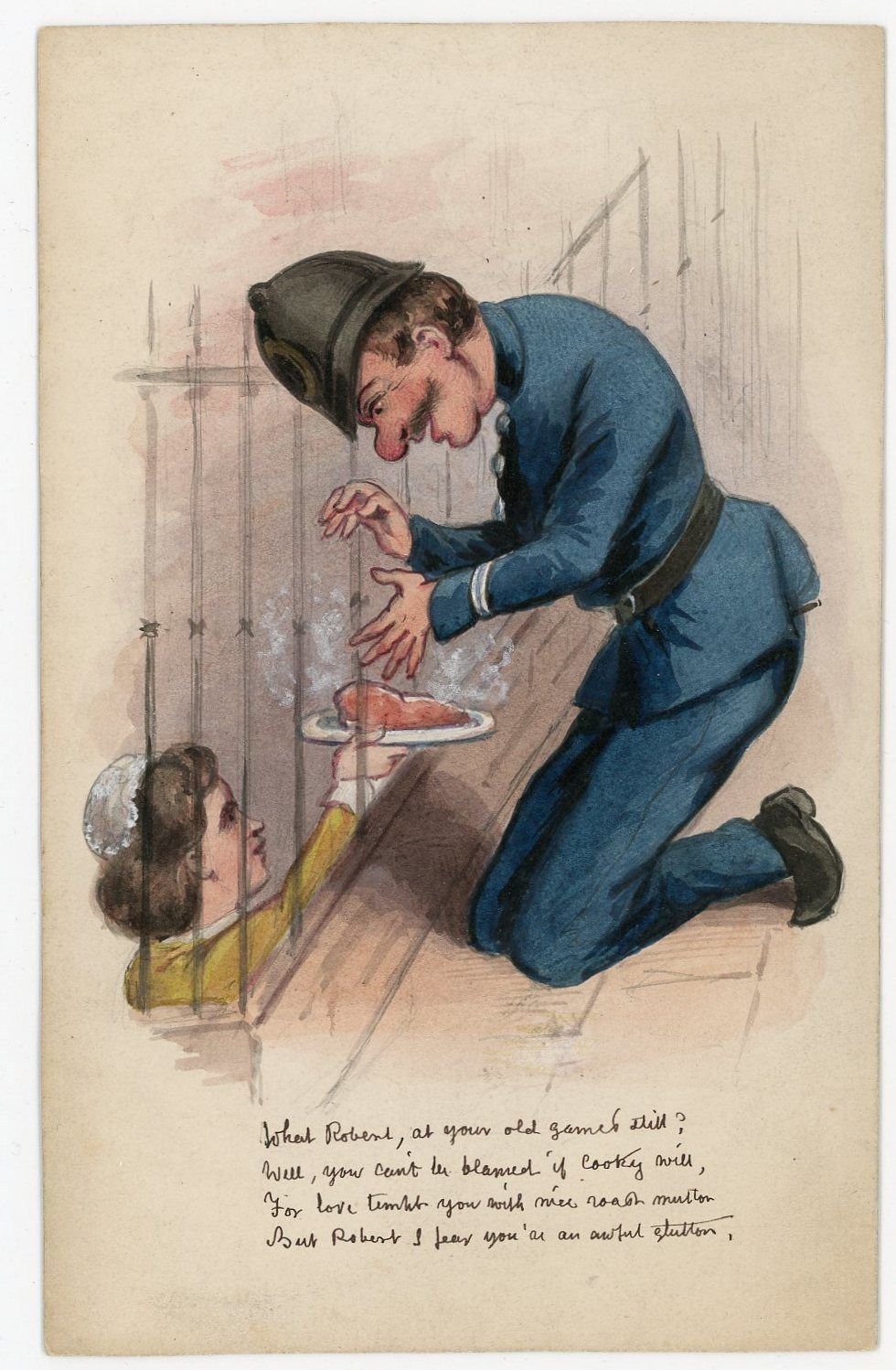 The second, a well executed original watercolor piece depicting the subservient maid offering the Bobby hot mutton is captioned "What Robert, at your old games still? Well, you can't be blamed 'if cooky will', For love tempt you with nice roast mutton But Robert I fear you're an awful glutton".