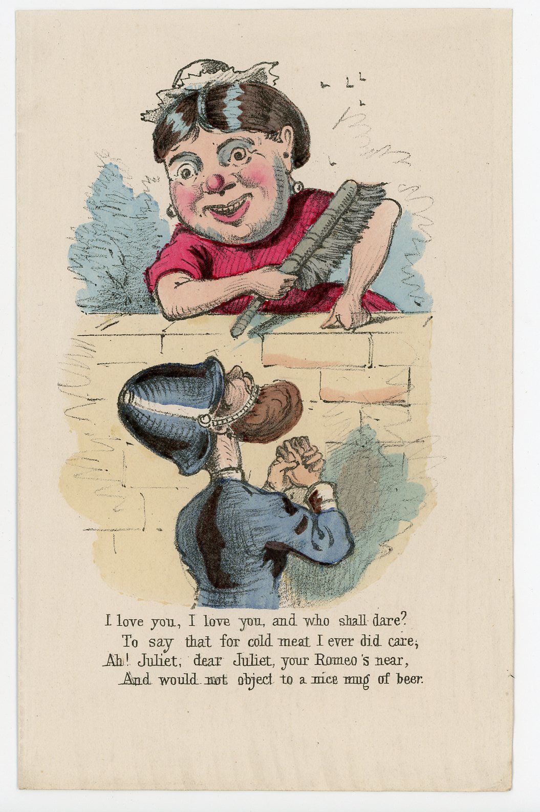 The first, single-fold, with the maid having the upper hand atop the wall reads "I love you, I love you, and who shall dare? To say that for cold meat I ever did care, Ah! Juliet, dear Juliet, your Romeo's near, And would not object to a nice mug of beer".
