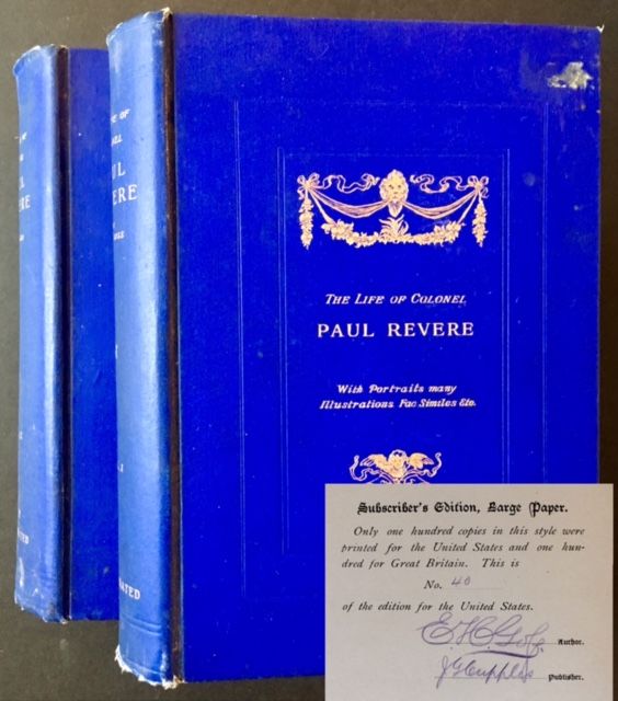 Boston: Joseph George Cupples, 1891. Very Good. The 1891 "Subscriber's Edition" (and 1st edition). "Only one hundred copies of this style were printed for the United States and one hundred for Great Britain. This is No. 40 of the edition for the United States". AND, AS CALLED FOR, EACH OF THE ONE HUNDRED COPIES IS SIGNED BY THE AUTHOR (ELBRIDGE HENRY GOSS) AND EACH SIGNED BY THE PUBLISHER (JOSEPH GEORGE CUPPLES) below the statement of limitation. A very presentable copy to boot of this sweeping 2 volume biography, "with portraits, many illustrations, facsimiles, etc." Both volumes tight and VG in their handsome navy-blue cloth, with bright, unrubbed gilt-titling and design along the front panels and spines. Light, forgiveable soiling to the panels (a bit more pronounced at Vol. II's front panel), a bit of light scuffing to the rear panels. Internally, very clean, with no writing or markings or foxing to speak of. Thick, massive octavos, all edges gilt. Several dozen plates, many tipped-in, all with their original tissue-guards. Elegant. tipped-in frontispiece portraits of Paul Revere as well. Imposing in scale, very impressive in appearance and ambition.