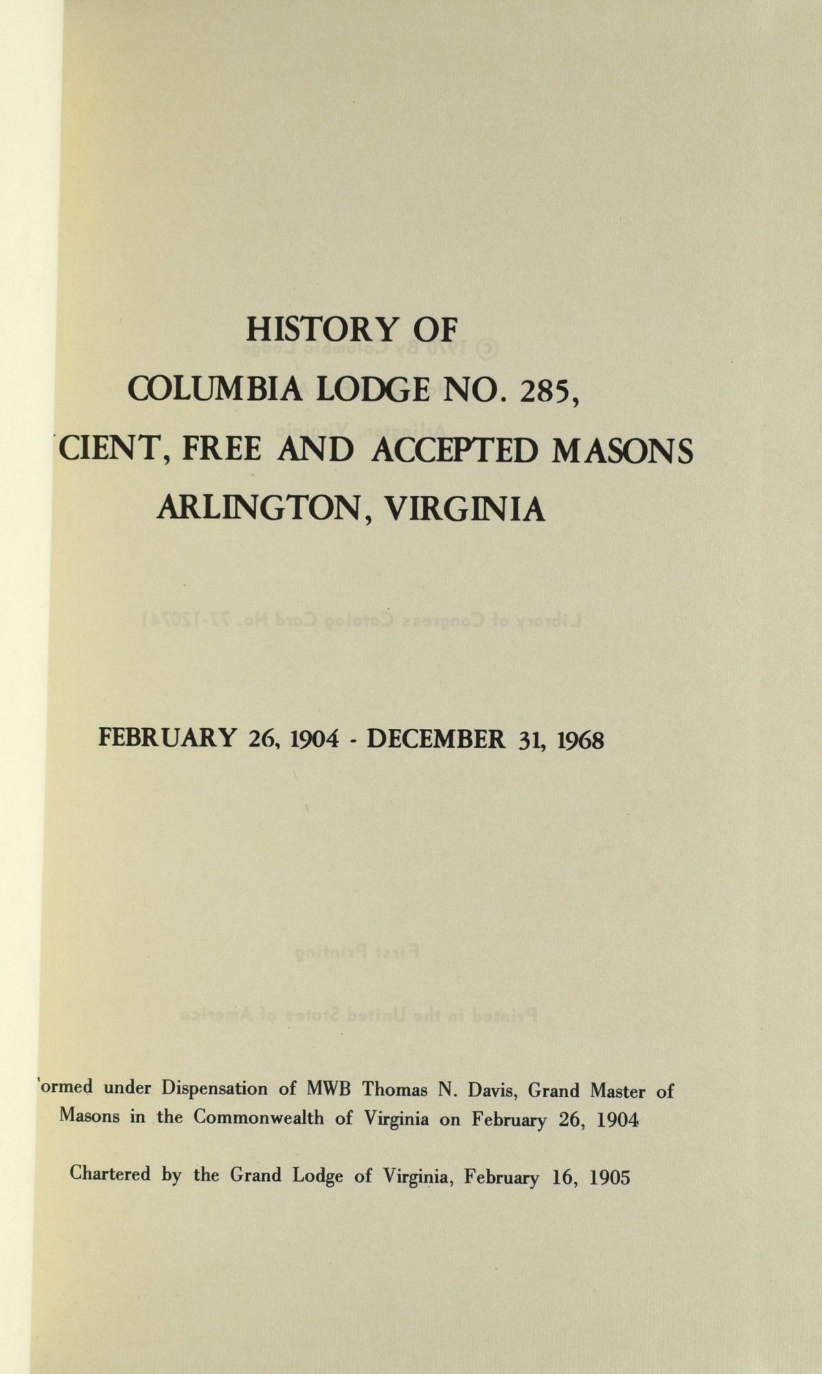 [MASONIC] HISTORY OF COLUMBIA LODGE NO. 285, ANCIENT, FREE AND ACCEPTED MASONS ARLINGTON, VIRGINIA. FEBRUARY 26, 1904 - DECEMBER 31, 1968
