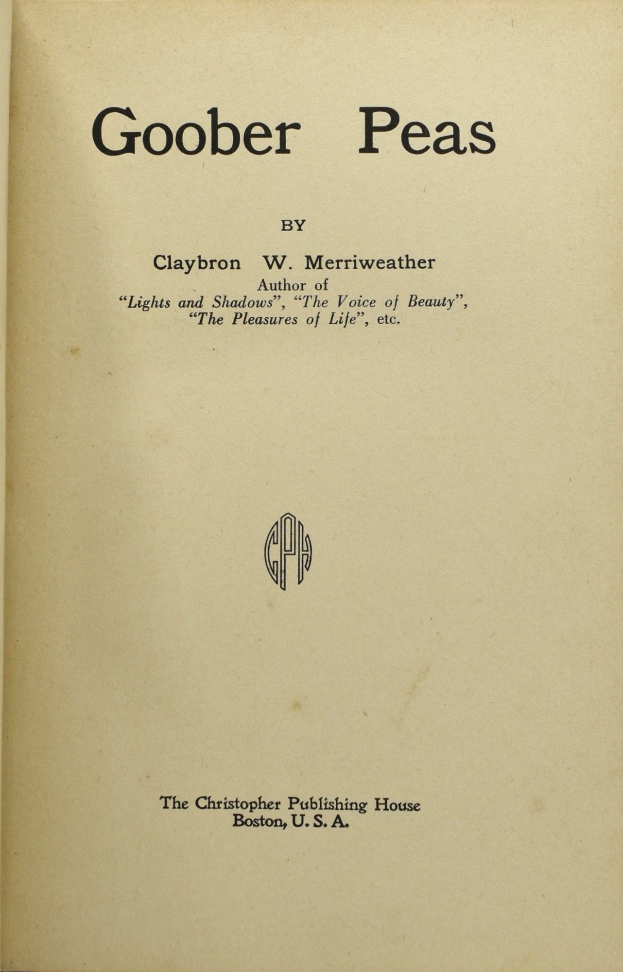Boston, U.S.A.: The Christopher Publishing House, 1932. First Edition. Hard Cover. Very Good binding. A book of poetry by Claybron W. Merriweather. Previous owner's name on the front endpaper, and scotch tape stains to the same. Minor sunning and wear to the spine. Red cloth with a silk-like design, with gilt lettering. Very Good binding.