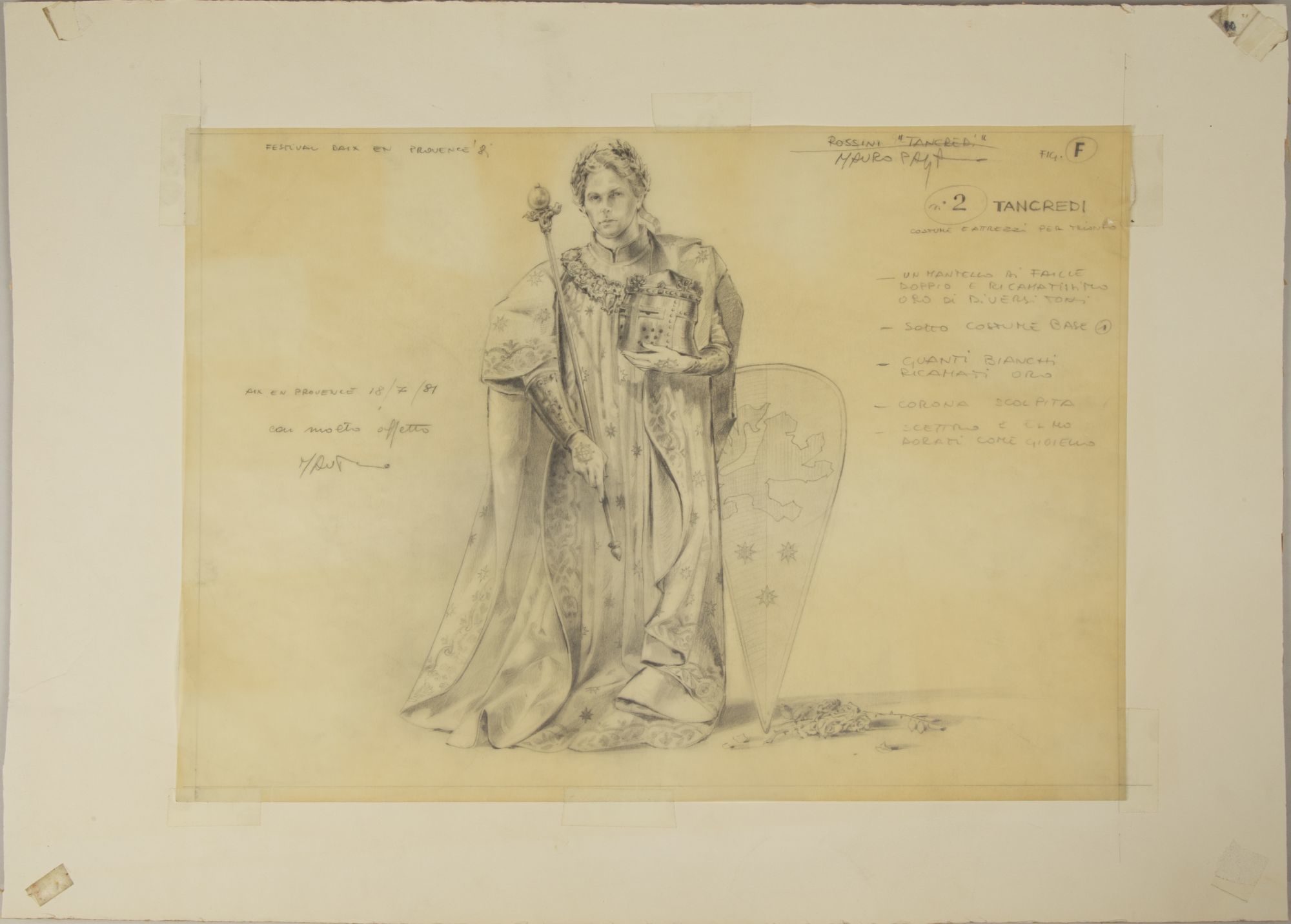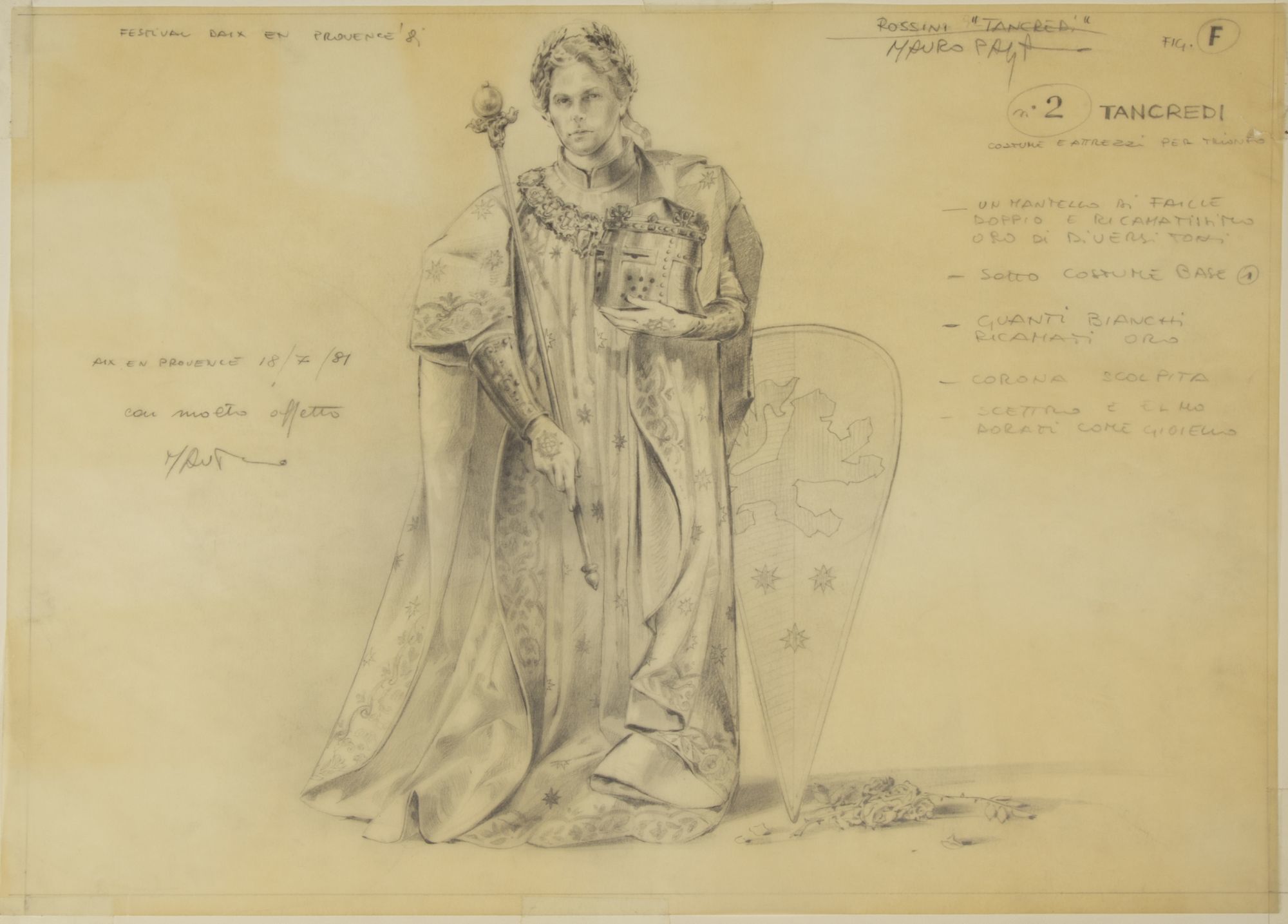 A detailed full-length depiction of the character Tancredi in ceremonial attire, holding helmet and scepter, with shield in background. Dated "Aix en Provence 18/7/81 con molto affetto" and signed "M Pagano" at left, with description of costume to right.