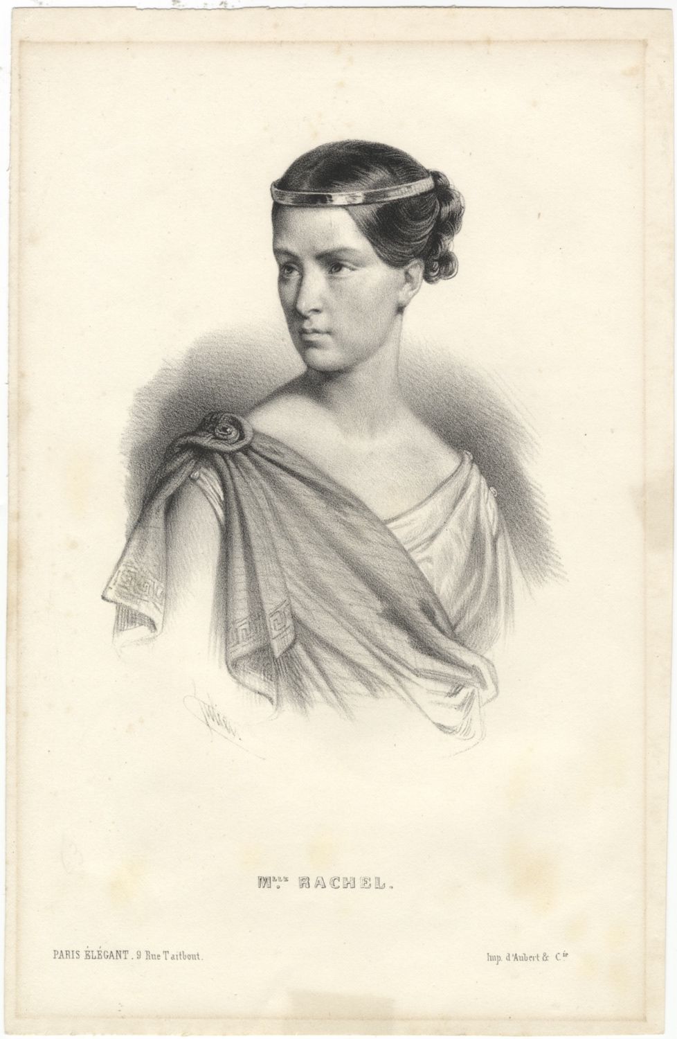 [Paris]: Aubert & Cie, 1840. Image size 150 x 110 mm, sheet size 245 x 157 mm. On wove paper. Bust-length, in Grecian robe, hair pulled back. Signed "Julien" in the stone, "Mlle. Rachel" below image.