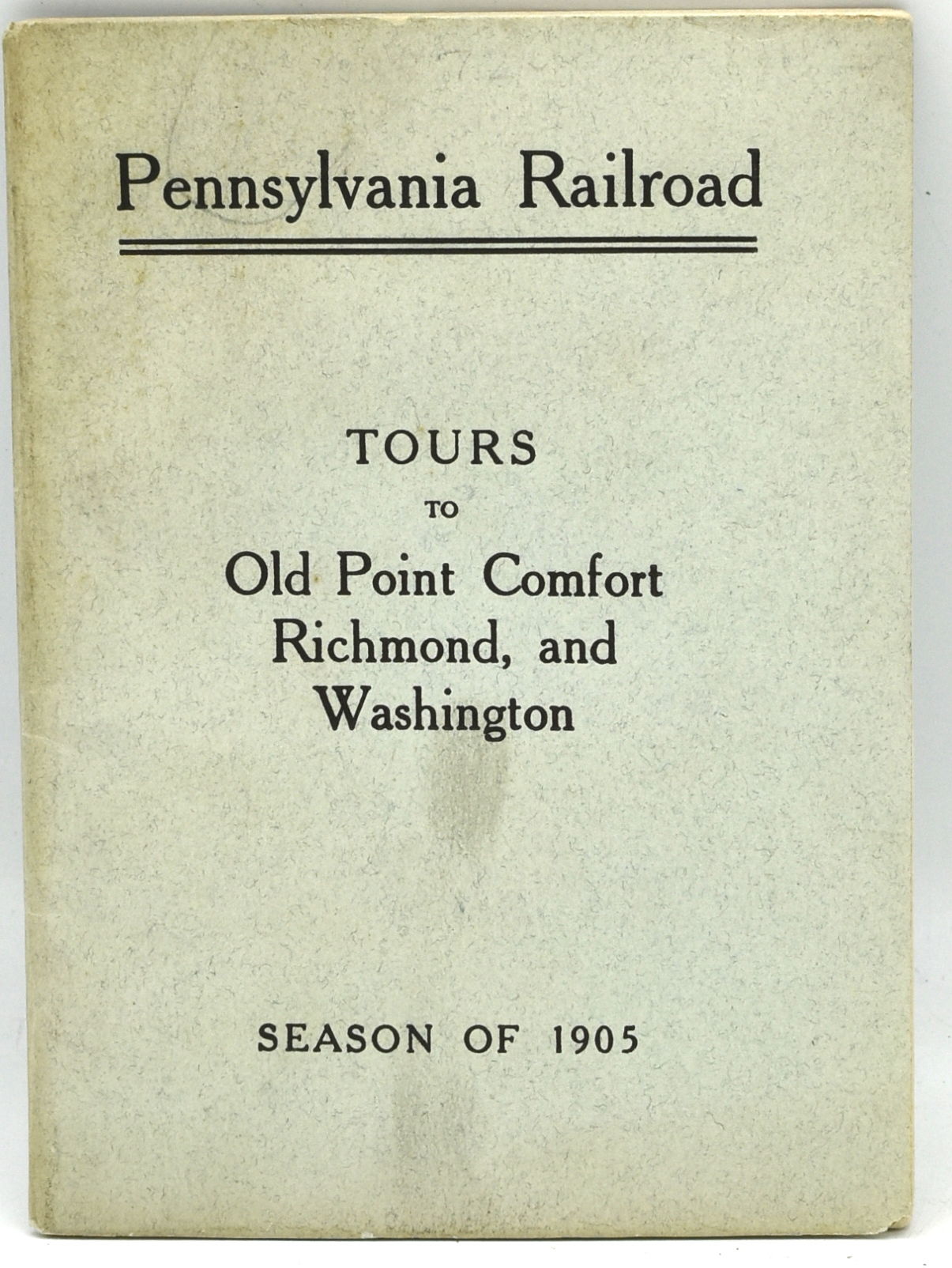Philadelphia: Allen, Lane & Scott, 1905. Stapled Pamphlet. Very Good binding. An advertising pocketbook for the Pennsylvania Railroad routes to Old Point Comfort, Richmond, and Washington. With pricing for each of the routes, and brief descriptions of landmarks and towns along the way. Sewn pamphlet, with blue paper wrappers. Measuring 14 x 10 cm. Very Good binding.
