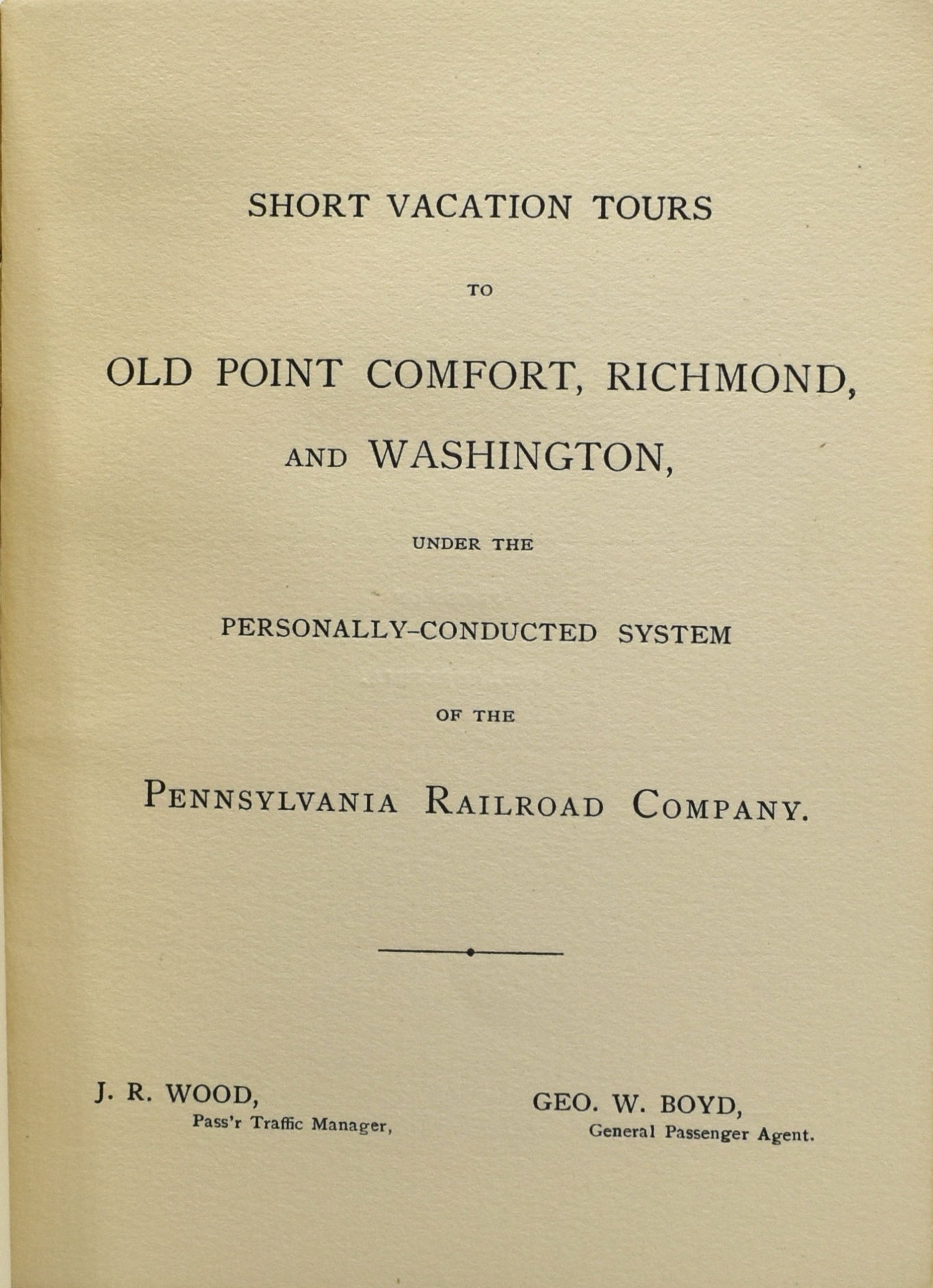 PENNSYLVANIA RAILROAD. SHORT VACATION TOURS TO OLD POINT COMFORT, RICHMOND, AND WASHINGTON, UNDER THE PERSONALLY-CONDUCTED SYSTEM OF THE PENNSYLVANIA RAILROAD COMPANY