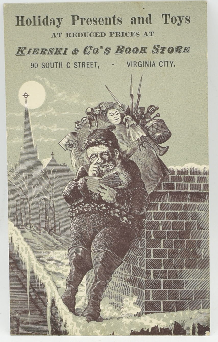 [Virginia City, Nevada]: [Kierski & Co's Book Store], 1870. Very Good binding. A Christmas advertising card depicting a weary Santa, taking a much needed reading break. Printed for the Kierski & Co. Book Store in Virginia City, Nevada, from the 1870's. Originally Prussian immigrants, William and his brother John Kierski operated a number of California book and stationary stores in Stockton, California, selling books, photographs, maps, and other items in addition to the 'presents and toys' here mentioned. They also very briefly opened a store on Victoria Island off the California West Coast, and later operated out of Virginia City, Nevada. (Palmquist & Kailbourn "Kierski, William" Pioneer Photographers of the Far West p. 349 | agreeableplace.com "William Kierski: First Bookseller in Victoria" published February 22, 2017). Very Good binding.
