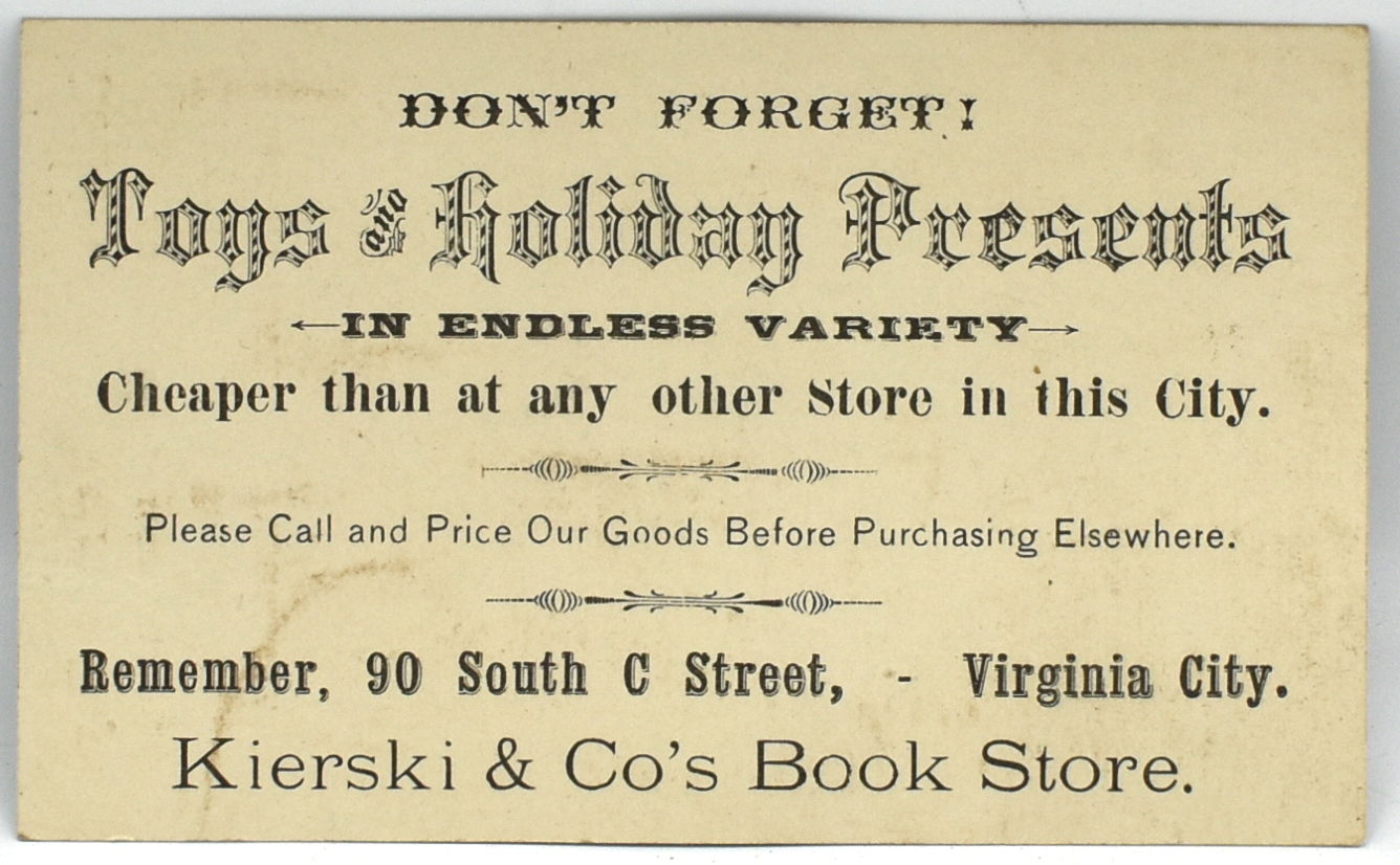 [HOLIDAY ADVERTISING CARD] HOLIDAY PRESENTS AND TOYS AT REDUCED PRICES AT KIERSKI & CO'S BOOK STORE. 90 SOUTH C STREET, VIRGINIA CITY