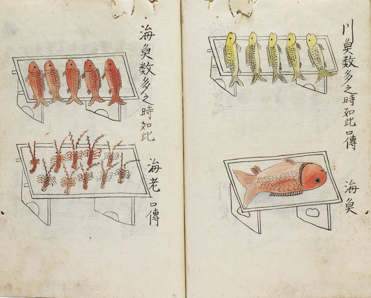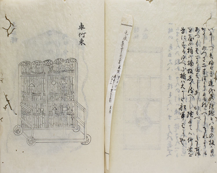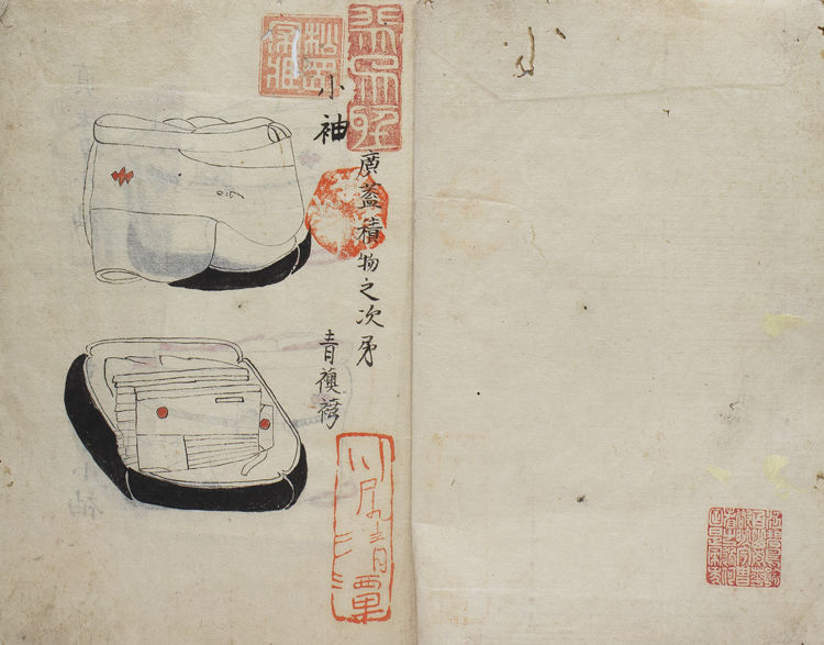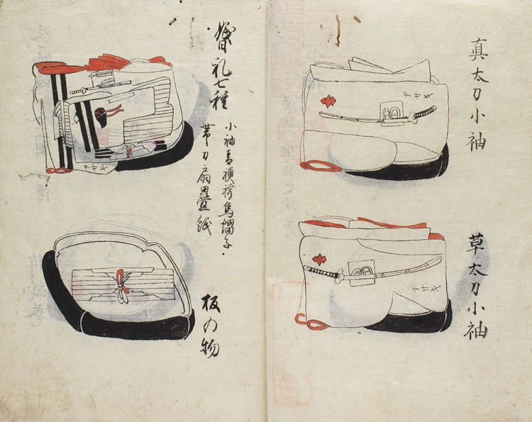 [Kyoto: c.1780]. 4to. Wrappers. 4to. "A pictorial guide to the various Samurai garments, arms and hats worn, 48 pp manuscript, 8vo (230 x 160 mm), on rice paper, illustrated with over 90 sketches in pen and ink and colors, some light worming at upper margins, covers in thicker paper, upper cover worn;