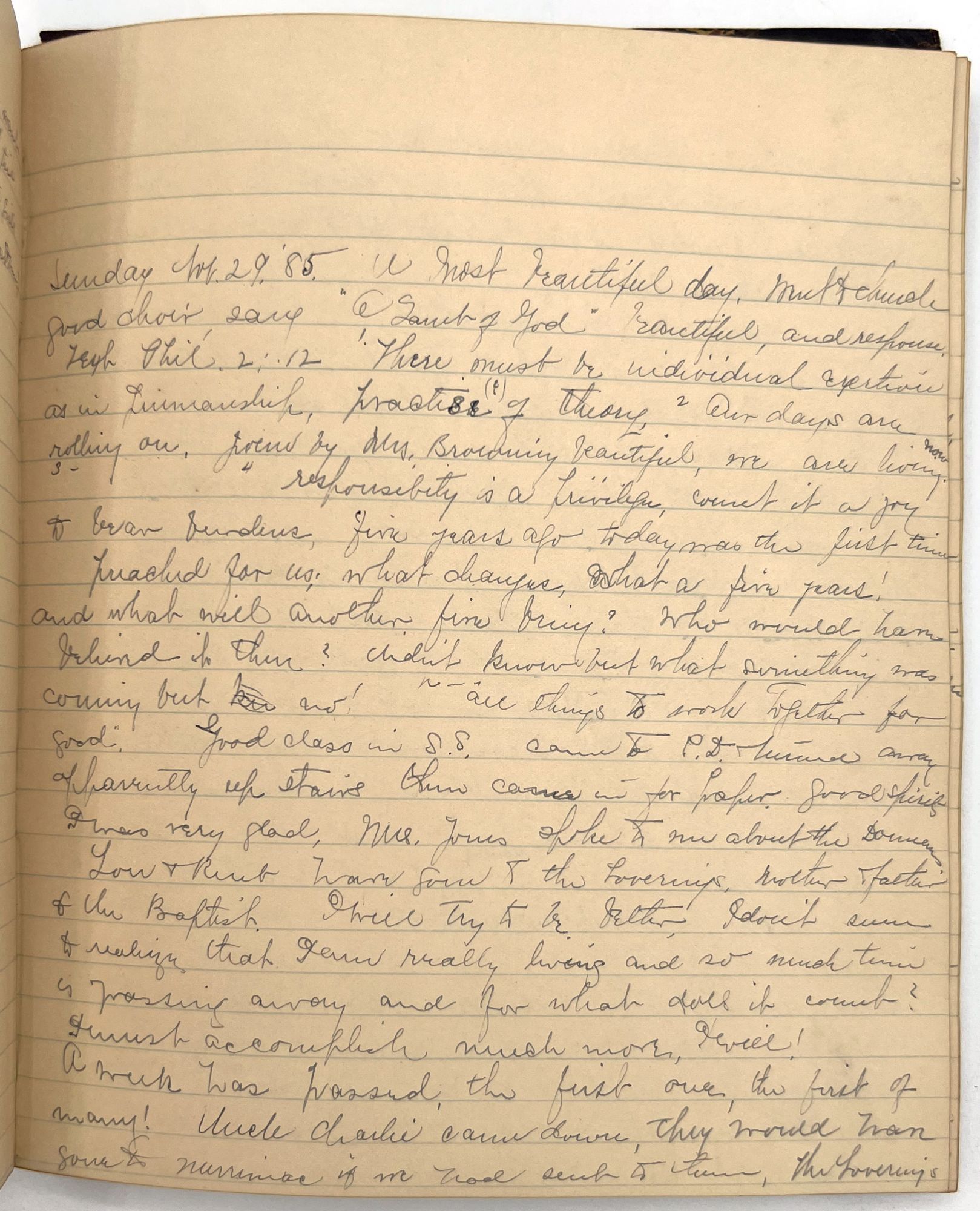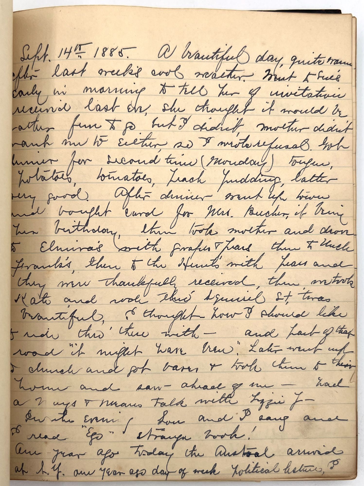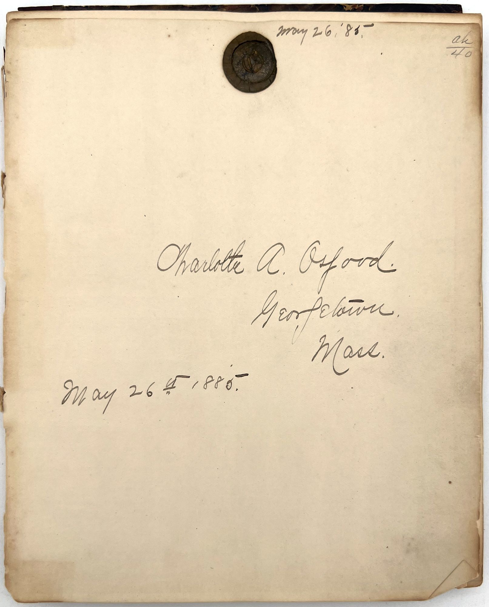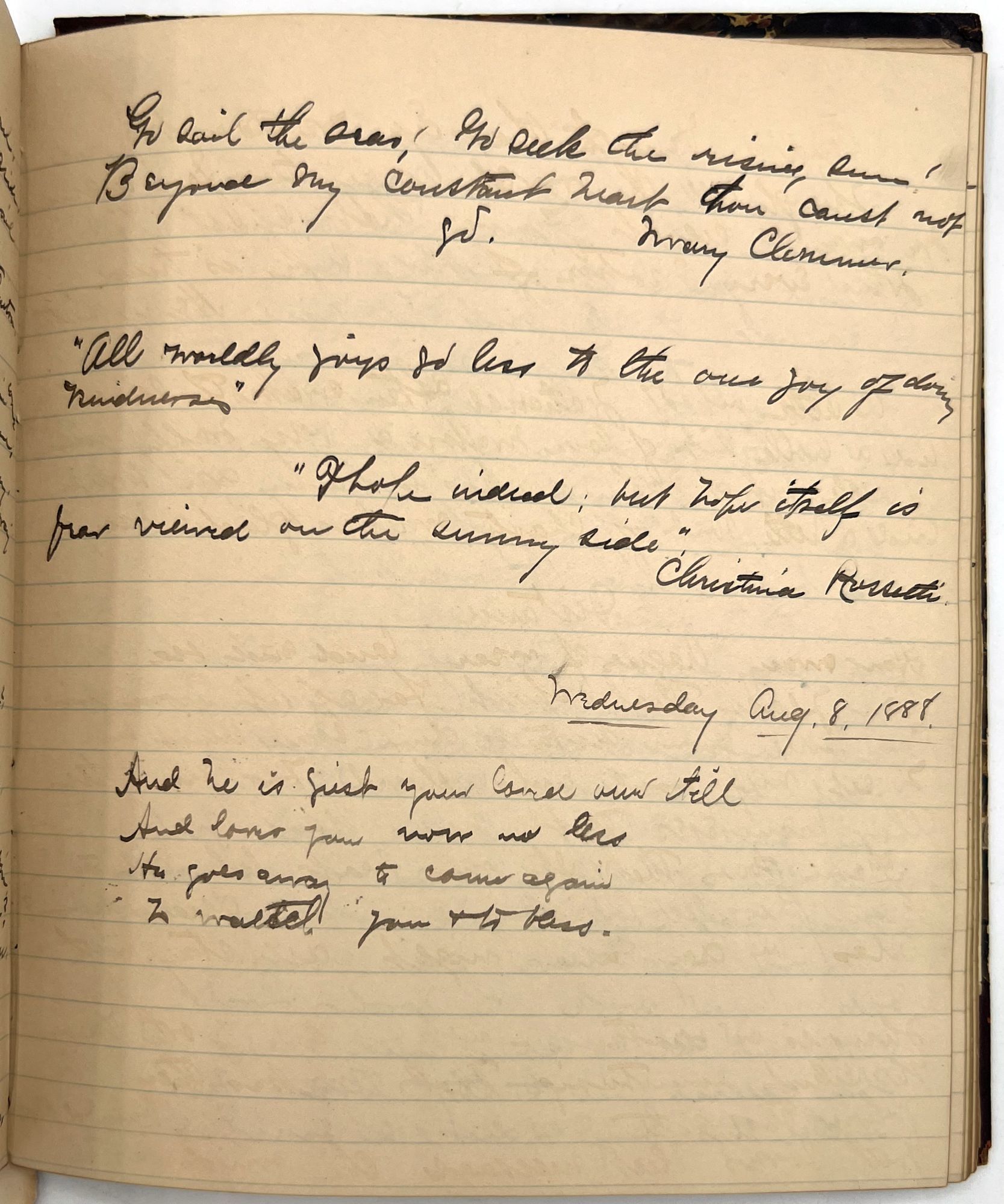 Georgetown, MA, 1889. Front cover detached. Back strip missing. Back cover mostly detached. Damage to binding.. A diary of a young woman from Georgetown, MA, named Charlotte Osgood. Her family were prominent in local society. Covering four years, the journal starts with almost daily entries. As the years progress, the entries diminish in frequency, but are always picked up again during some of the exciting times in Charlotte's life. For example her trip to Provincetown in August of 1886. Charlotte also toured at Perkins School for the Blind and met Laura Bridgmen (the first American blind and deaf individual to be educated). The rest of her entries generally start with a note on the current weather, and detail her activities for the day. Such as who visited who, and where she went. Her daily activities consisted of a variety of meetings, such as church meetings, choir meetings, and missionary meetings. Charlotte loved music and often went to concerts and plays. Some of the quotes do revolve around the theme of government, perhaps an influence of her father. Towards the end of the journal, Charlotte has recorded a variety of her favorite songs, poems, and quotes, as well as a few recipes (for Lemon Sherbet and pop over. Below are a few excerpts from the journal.