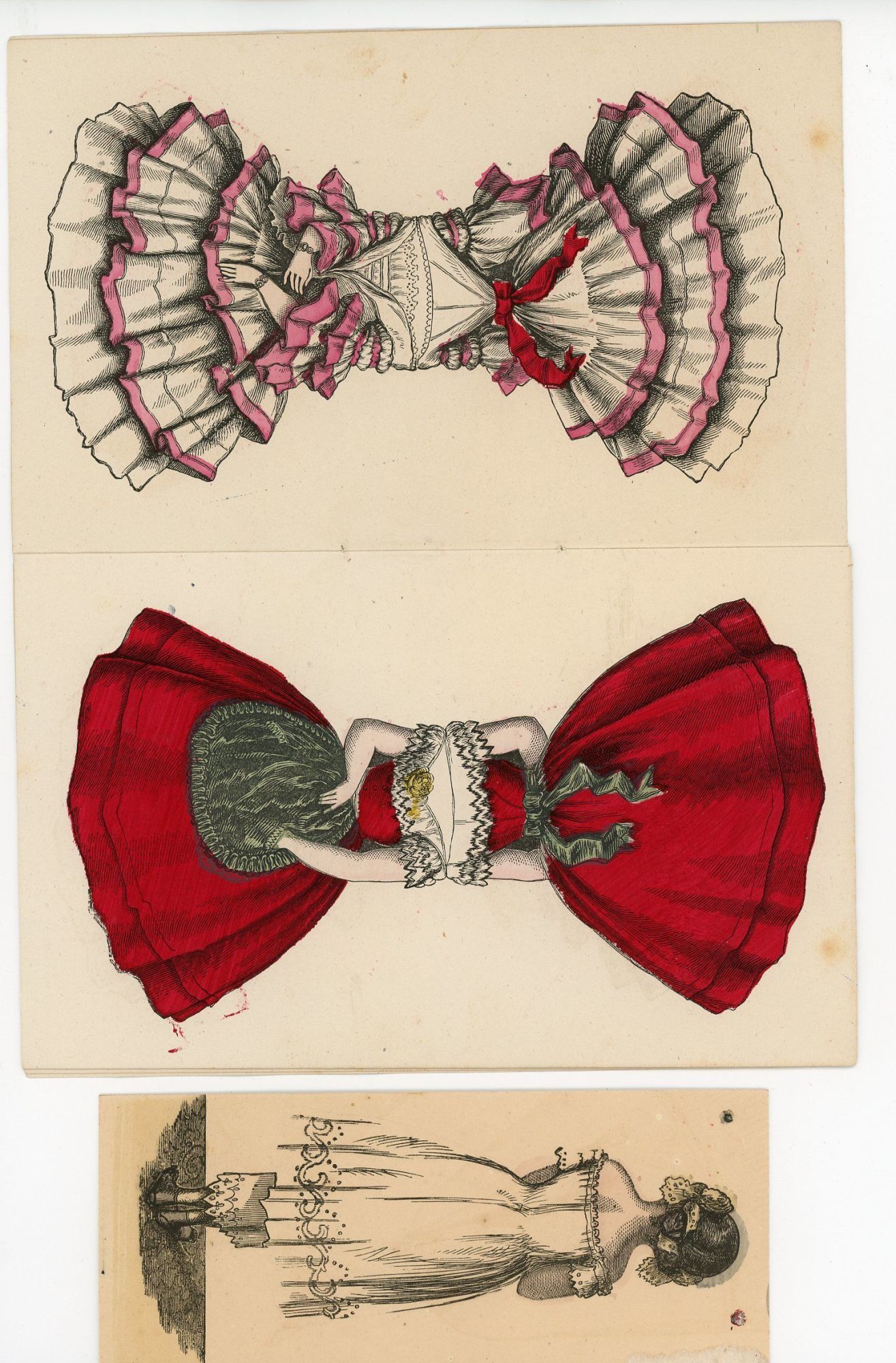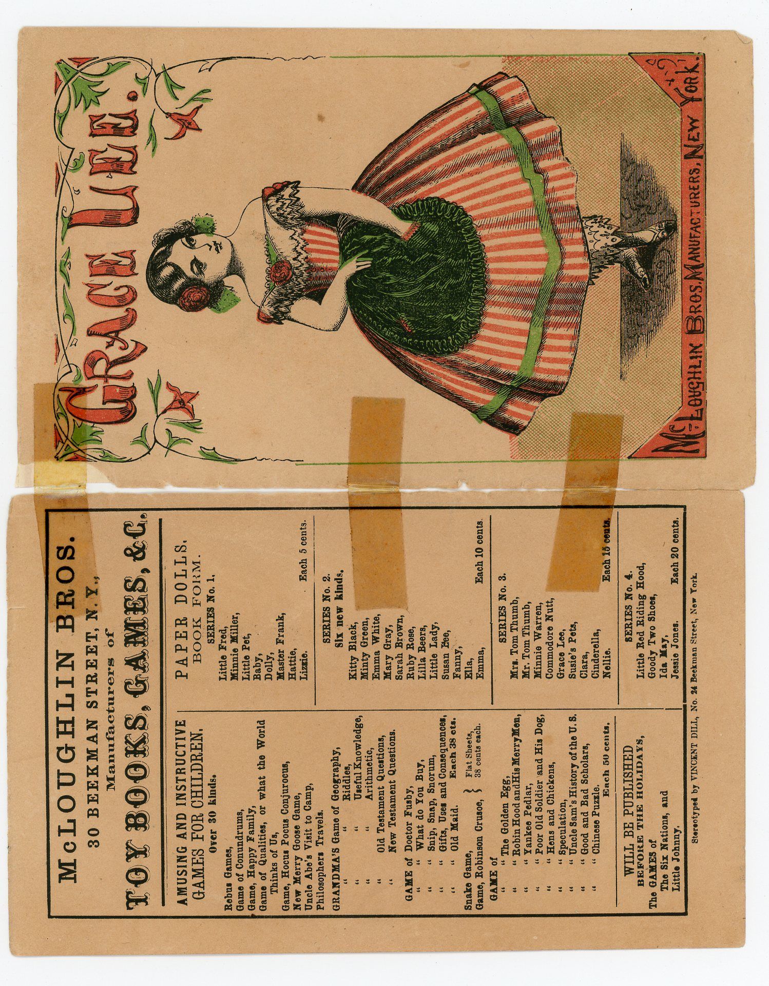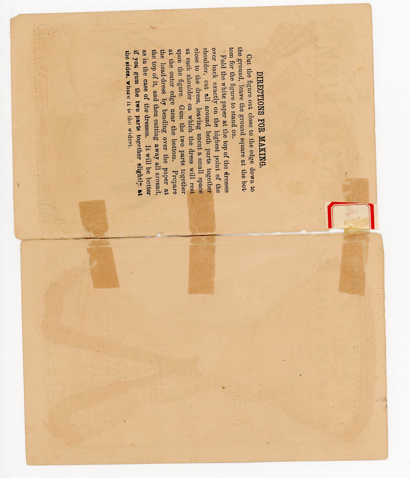 New York, 30 Beekman St: McLoughlin, 1868. The folder is separated at the fold with tape repair and stain. Else fine.. A hand colored two-sided paper doll on 5 3/4" x 3" card. An uncut thread-stitched booklet with six uncut costumes and hats. All with elaborate detail and hand colored embellishments. The inside of the folder includes printed Directions for Making. From the Paper Dolls, Book Form., Series No. 3.