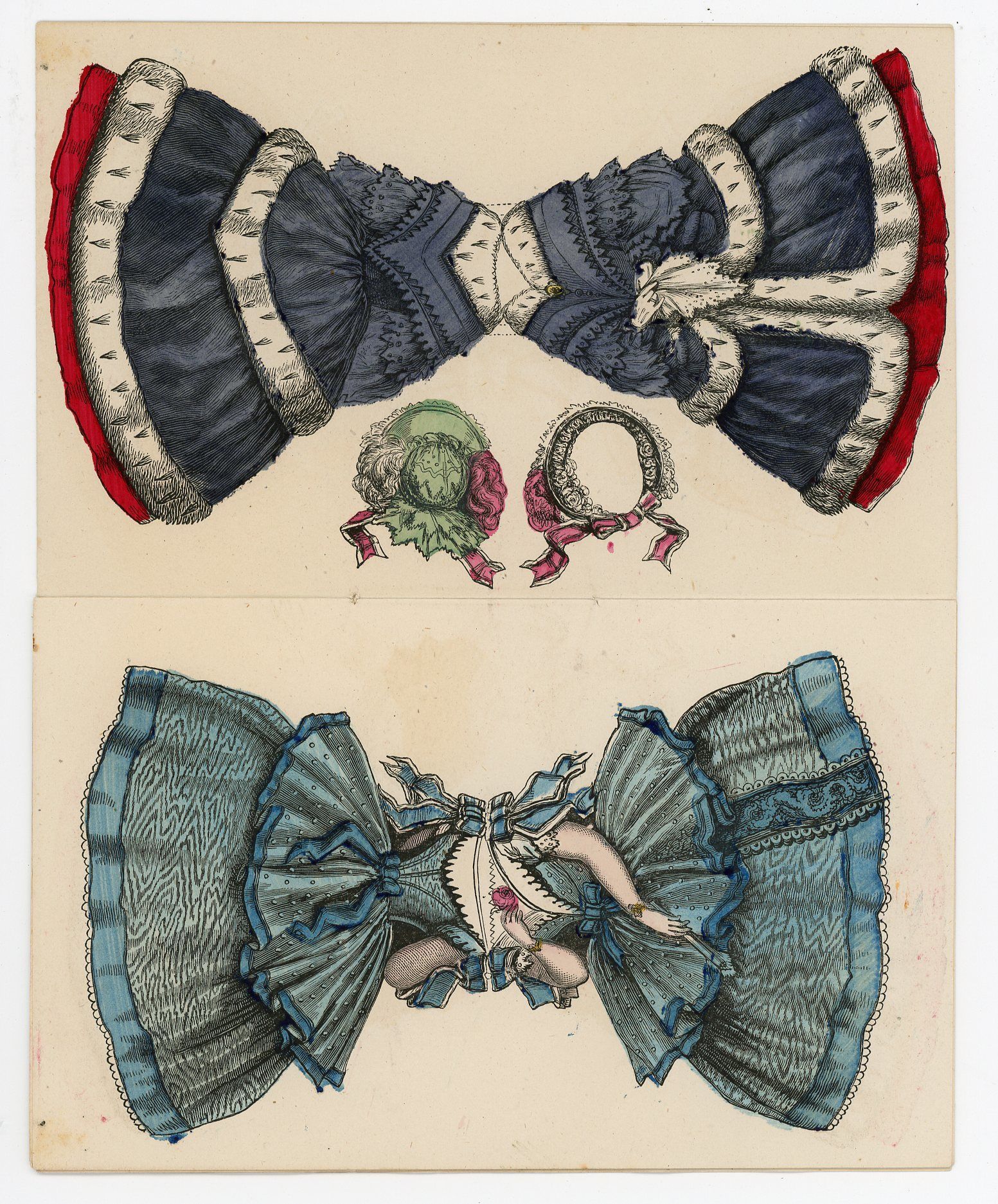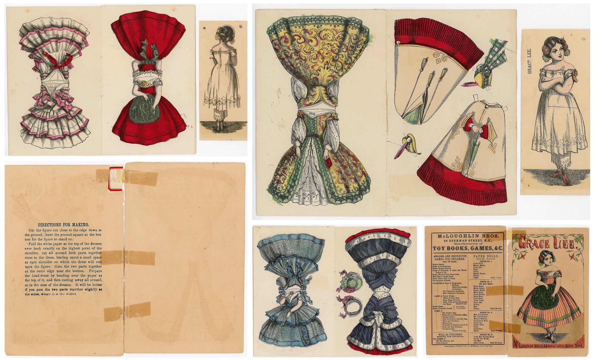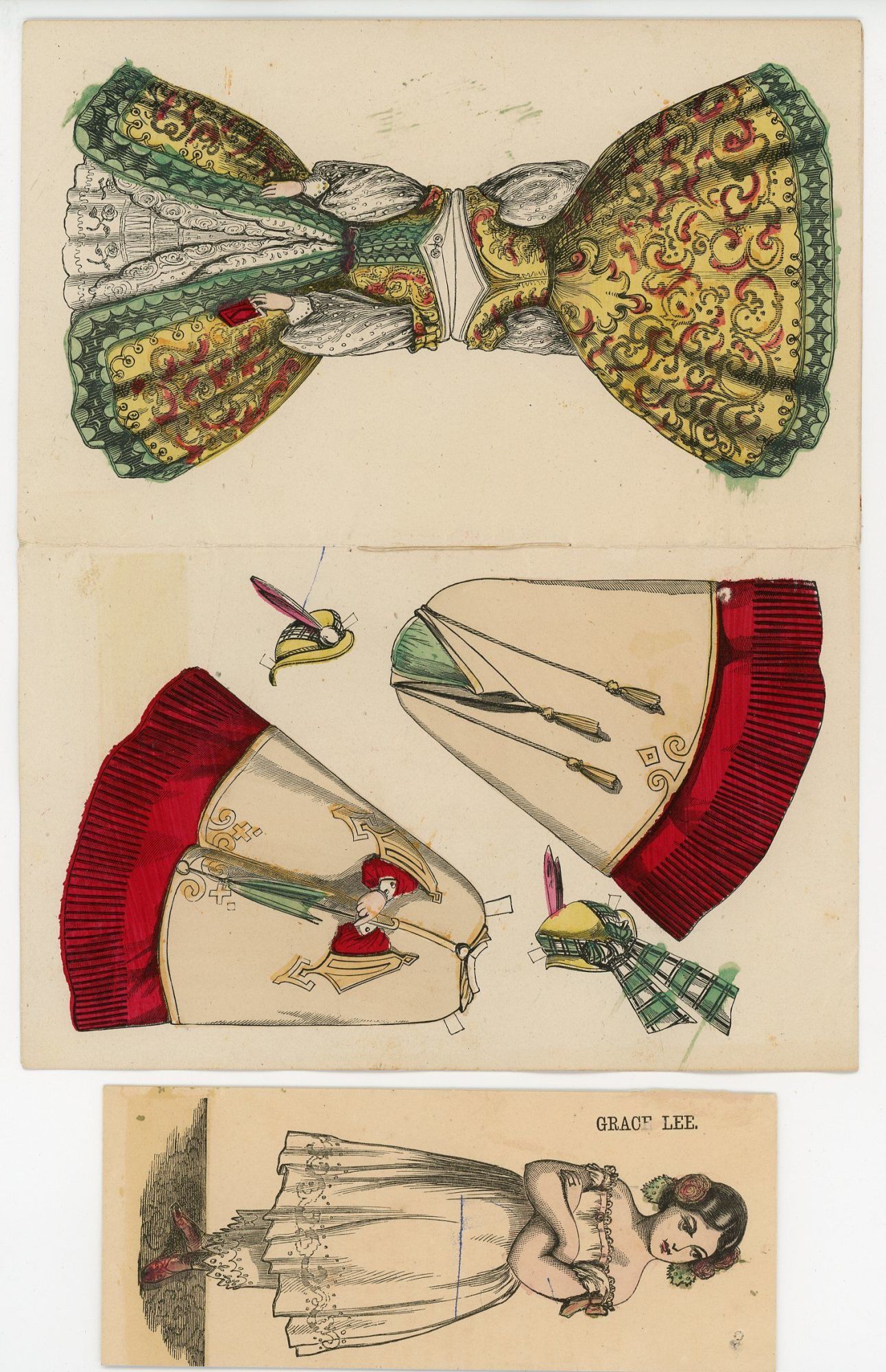 New York, 30 Beekman St: McLoughlin, 1868. The folder is separated at the fold with tape repair and stain. Else fine.. A hand colored two-sided paper doll on 5 3/4" x 3" card. An uncut thread-stitched booklet with six uncut costumes and hats. All with elaborate detail and hand colored embellishments. The inside of the folder includes printed Directions for Making. From the Paper Dolls, Book Form., Series No. 3.