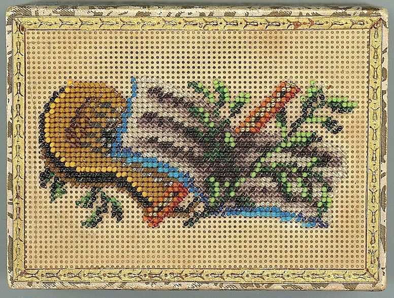 Minimal edge wear. Light paper fad on underside.. A 2 3/4" x 3 3/4" litho on pressed board box with inner sleeve for holding playing cards. The top surface is perforated or punch paper (20 punch holes/inch) with embossed die-cut gilt border. The beadwork design is created using miniature glass and metal beads. The scene depicts a lyre, flute and music book.