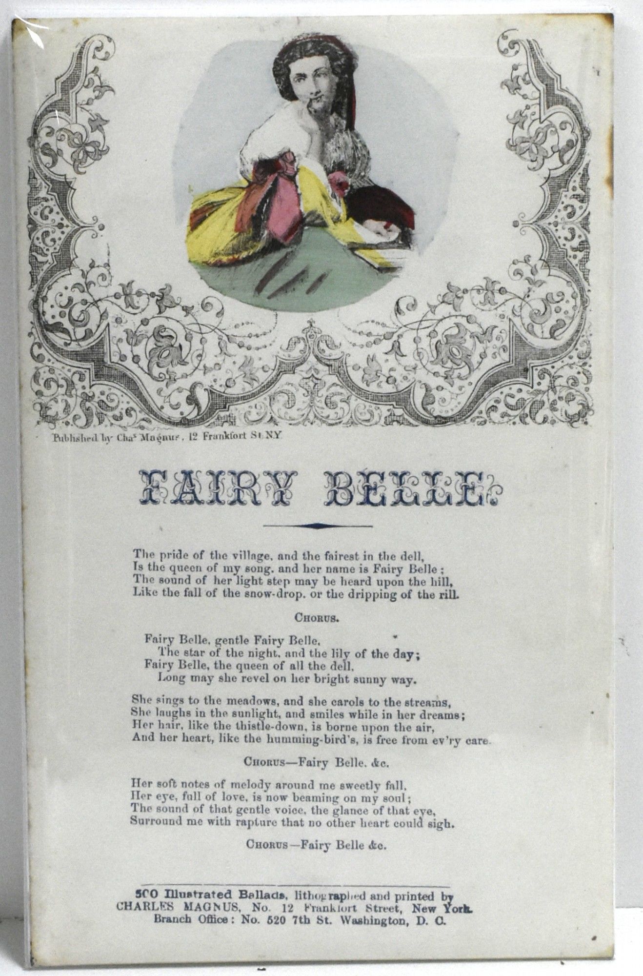 New York: Charles Magnus, 1860. One of Charles Magnus's "500 Illustrated Ballads". Fairy Belle is a broadside or songsheet from the Civil War era. Text printed in blue, with black decorations and a hand colored illustration of a thoughtful woman at the top of the sheet. 20 cm. x 12.5 cm.
