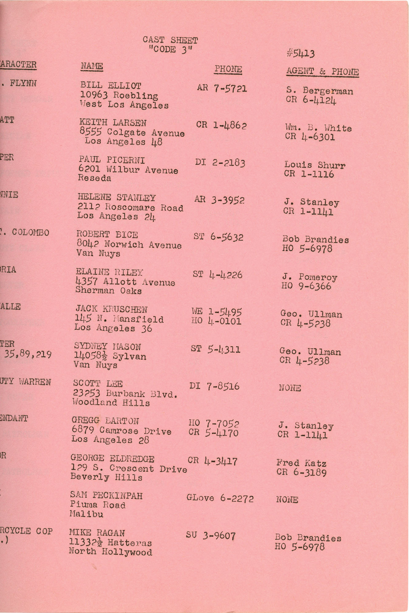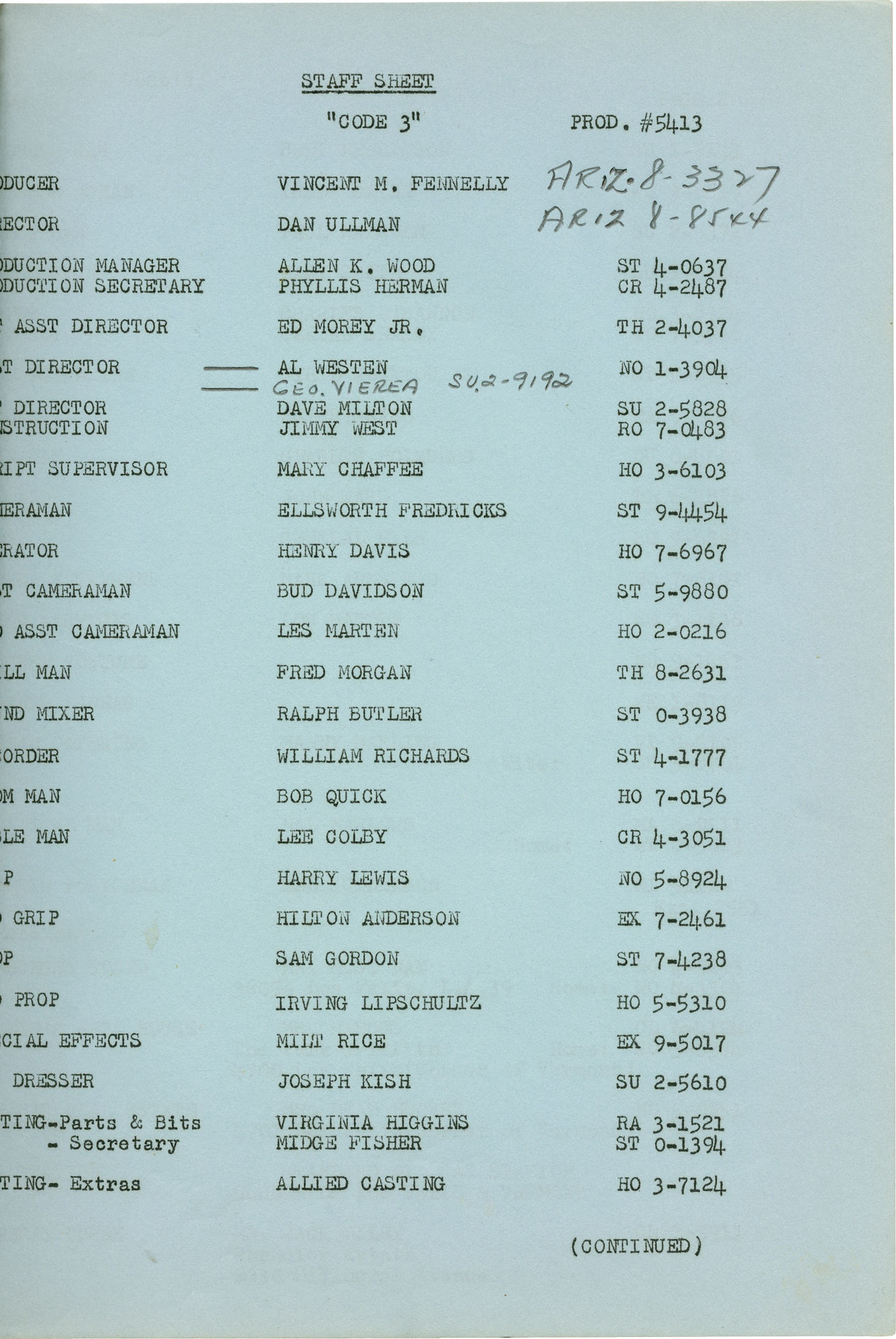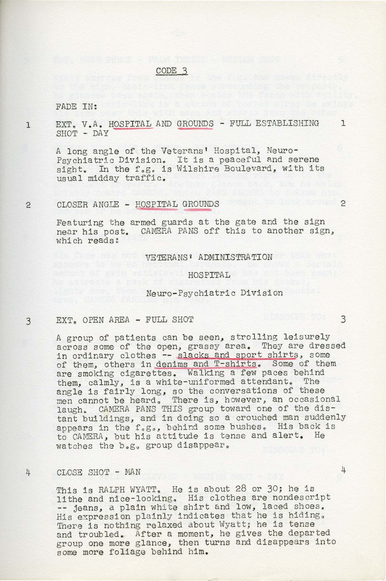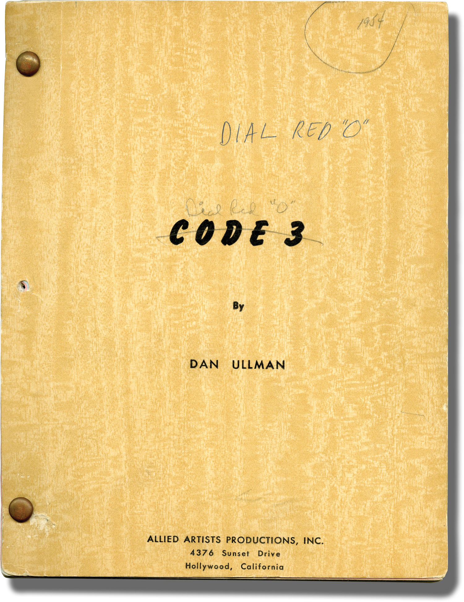 Glendale, CA: Allied Artists, 1954. Shooting script for the 1955 film noir, here under the working title "Code 3," with the working title crossed through on the front wrapper and "Dial Red O" written above it twice, once in manuscript pencil and once in manuscript ink. Copy belonging to an uncredited crew member, with annotations throughout in red pencil, primarily noting locations or props.
