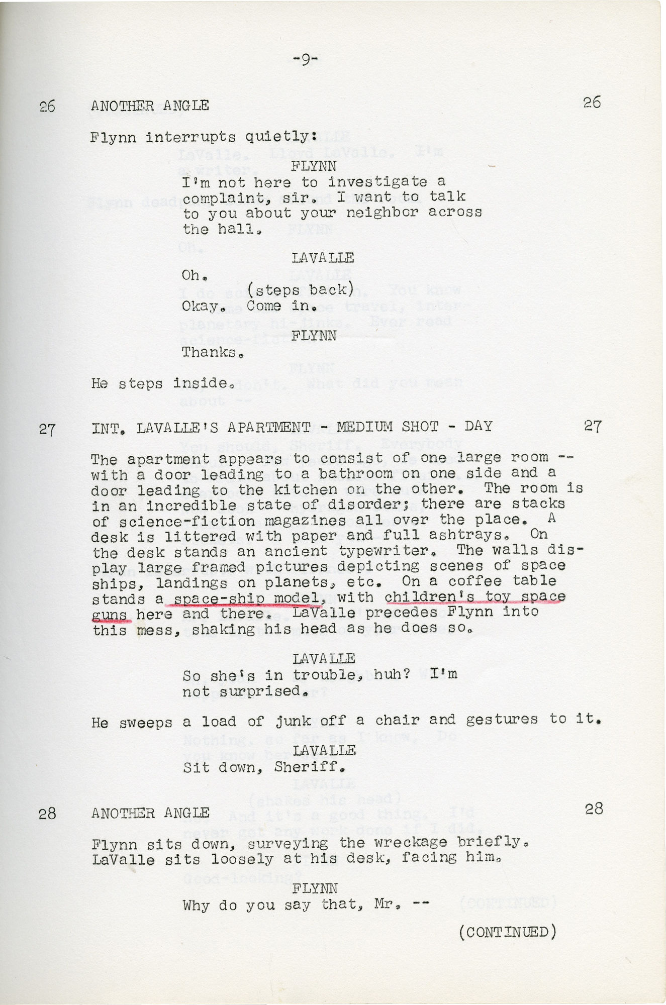 Printed beige titled wrapper, with credits for director and screenwriter Dan Ullman and a Sunset Script Service stamp on the verso of the rear wrapper. Distribution page present, with receipt removed, dated October 29, 1954. 104 leaves, with last leaf of text numbered 99. Mimeograph duplication, with Blue revision pages throughout, dated 11-2-54. Pages Near Fine, wrapper Very Good Plus, bound with two gold brads.
