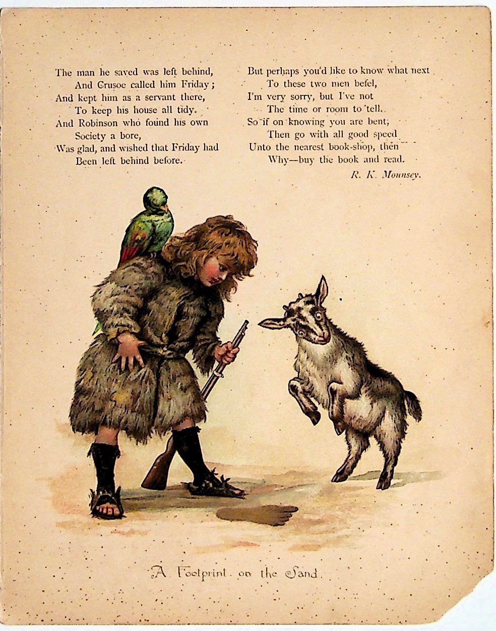London and New York: Ernest Nister and E.P. Dutton & Co, 1900. Unbound. Very Good. Unbound. Chromolithograph illustration from a poem "Robinson Crusoe." Small chip to bottom corner, light dampstaining to bottom corner (not affecting image), light browning to margins, and light speckles of foxing. A few lines from the rhyme are included on the print. Includes a seperate page of text including the full text of the poem. Size: about 9 x 7 inches. PRINT/123019.