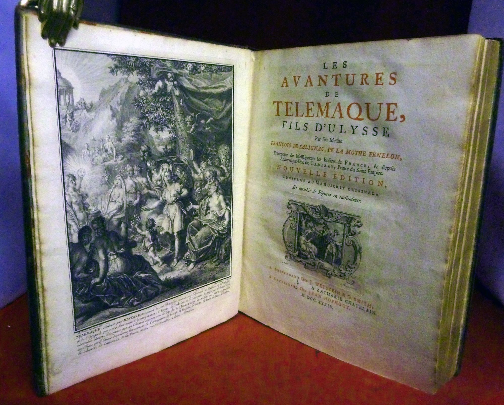 Amsterdam & Rotterdam: J. Wetstein & G. Smith, & Zacharie Chatelain; Jean Hofhout, 1734. Nouvelle Edition. leather_bound. Contemporary full mottled calf. Aeg. Very good/Near fine. [(2), X, XVII] 424 pages. 28.5 x 23 cm. Folding map, 24 plates engraved by Balthasar Bernaerts, Philipp Van Gunst, Louis Surugue and Jacob Folkema after Louis Fabricius Dubourg, Bernard Picart and Guillaume-François-Laurent Debrie with 22 engraved tail pieces. There was also a 1734 folio edition of this work limited to 150 copies. The engravings of the two editions are similar. Our copy contains the suppressed "Ode," last six pages of the text. First edition published 1699: it was also considered an attack on the divine right of absolute monarchy, and the the most popular book of its time. BRUNET. p.1214 calls it a "belle edition." GORDON N. RAY. p.8: depicts frontispiece herein. Bookplate of Armand-Jules de Rohan, Archbishop of Reims. Raised bands, spine panels in gilt floral arabesques, triple gilt border panels, marbled endpapers, spine ends conserved.