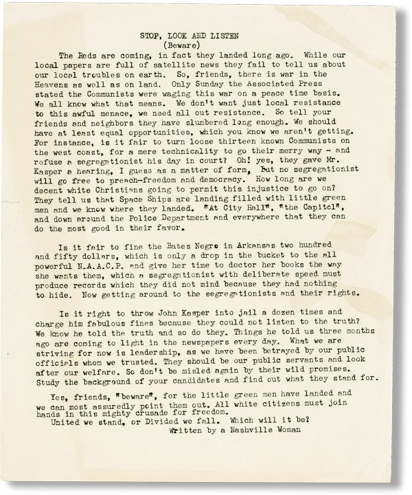 Presumably self-published handbill by an anonymous "Nashville Woman," arguing for the innocence of segregationist gadfly John Kasper (who served an eight month sentence for conspiracy in 1957) and suggesting that space ships full of "little green men" [i.e. communists] were taking over city halls, police departments and state houses throughout the South, bringing with them an alien ideology of racial integration. "Yes, friends, 'beware', for the little green men have landed and we can most assuredly point them out. All white citizens must join hands in this mighty crusade for freedom." An illustrative relic of the tiny intersection of Sputnik fever and white supremacy; undated but given the repeated references to Kasper and to "satellite news," 1957 seems a safe bet.