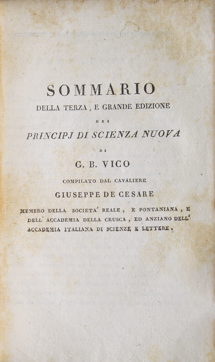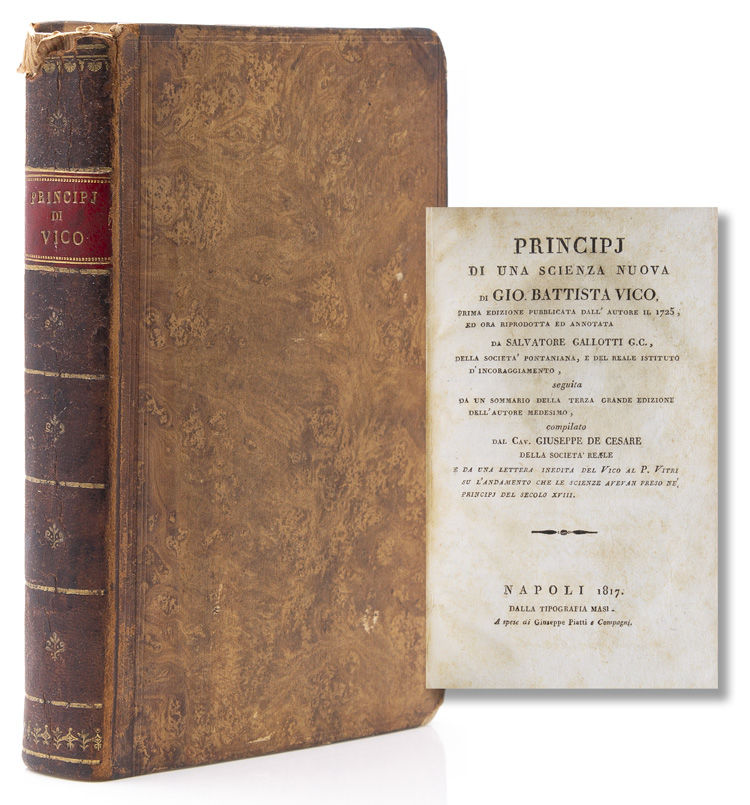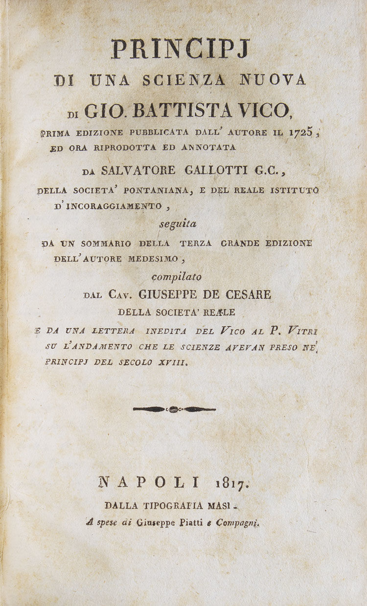 Napoli: Dalla Tipografia Mas, 1817. The first reprint of the 1725 edition, with notes and ammendments from the third edition of 1744; editions printed between 1744 and 1817 reprinted the third edition of 1744. Frontispiece. 8vo. Tan contemporary calf, red leather labe, head chipped. The first reprint of the 1725 edition, with notes and ammendments from the third edition of 1744; editions printed between 1744 and 1817 reprinted the third edition of 1744. Frontispiece. 8vo.