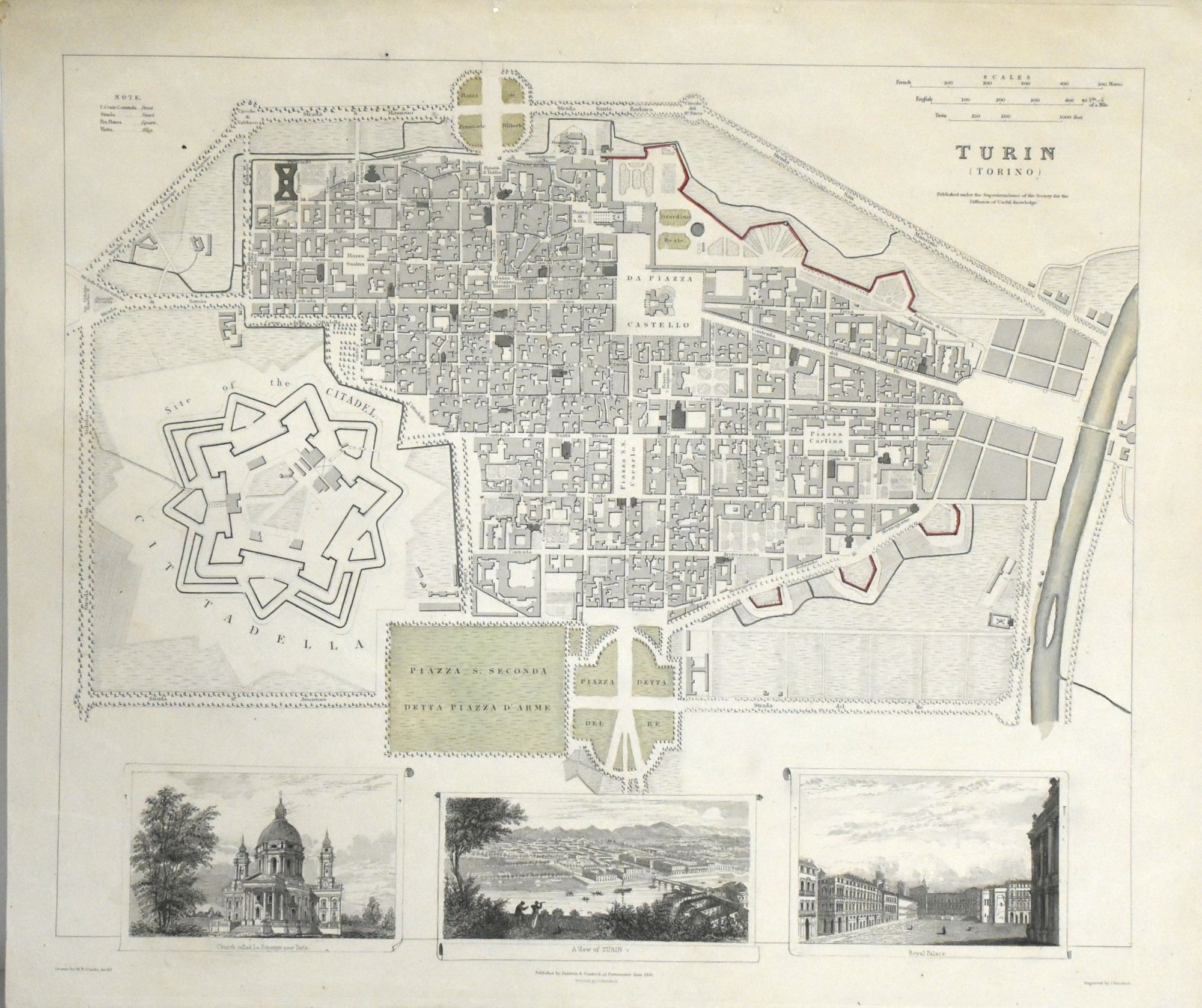 MAP OF TURIN FROM MAPS MODERN AND ANCIENT London: Baldwin & Cradock, 1830 By London: Baldwin & Cradock, 1830. A map of the city of Turin, with three engraved views of the city at the bottom edge. Measuring about 14 x 16.5 in.