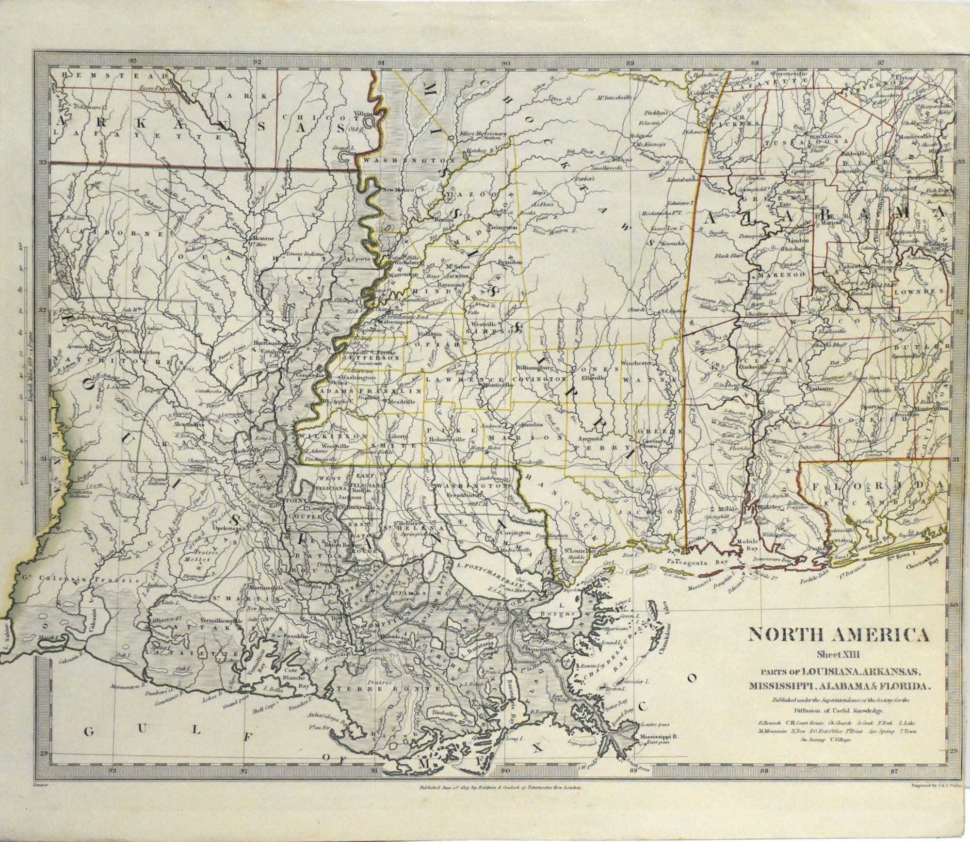 London: Baldwin & Cradock, 1830. A map of a few of the southern states, mainly Louisiana, Mississippi, and Alabama, with hand colored borders. Measuring about 14 x 16.5 in.