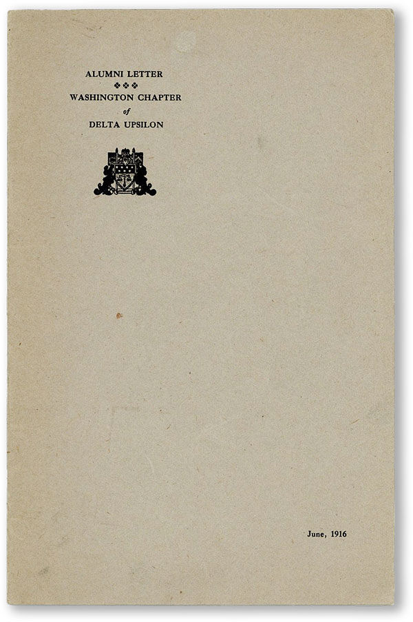 N.p. [Seattle?]: Washington Chapter, Delta Upsilon, 1916. Octavo pamphlet (22cm). Printed card wrappers; 16pp; illus. Trivial cover wear; Very Good to Near Fine. Finely-printed newsletter for graduates of the University of Washington chapter of the Delta Upsilon fraternity. Includes updates on UW happenings, noting the considerable accomplishments of various fraternity brothers both enrolled and graduated. With special attention to athletics. Among those pictured are the legendary UW linebacker Ray "Mike" Hunt ('16) and the multi-sport standout twins Ed and Elmer Leader. The Washington Chapter of Delta Upsilon lost its charter in 2018 over allegations of hazing.