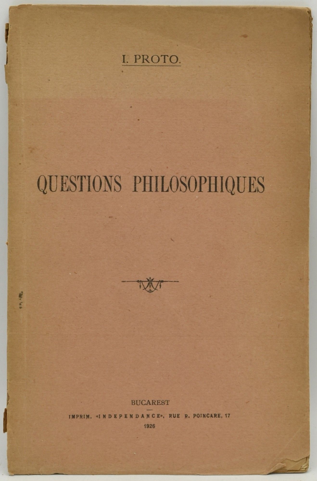 Bucarest: Imprim. Independance, Rue R. Poincare, 17, 1926. Original Sewn Wrappers. Good binding. A French philosophical pamphlet, perhaps by the Romanian philosopher Ion Petrovici, on religion and metaphysics. Printed in Bucharest during its Golden Age; during the 1920's and 30's inter-war period, the city was known as Micul Paris or 'Little Paris,' due to the boom in elaborate architectural works and cultural activities, up until the devastation of the city in WWII. Inscribed on the verso of the title page: "A mon home(?) Georgine en signe d'estime et de sympathie" signed and dated June 1928. Chapter titles include: L'ame est elle de l'energie? De l'ame; L'ame fonction du corps; l'ame chez l'homme; analyse de l'ame; de la notion de Dieu; et ce l'intelligence qui a cree le monde, ou est-ce le monde qui a cree l'intelligence? La metaphysique a-t-elle droit a l'existence; le principe de l'heterogeneite. Toning to the title page, some sunning to the covers, and beginning of separation along the spine. Sewn pamphlet with original pink paper wrappers. 68, [1] pp. An uncommon artifact from the height of Bucharest's past. Not located in OCLC. Good binding.