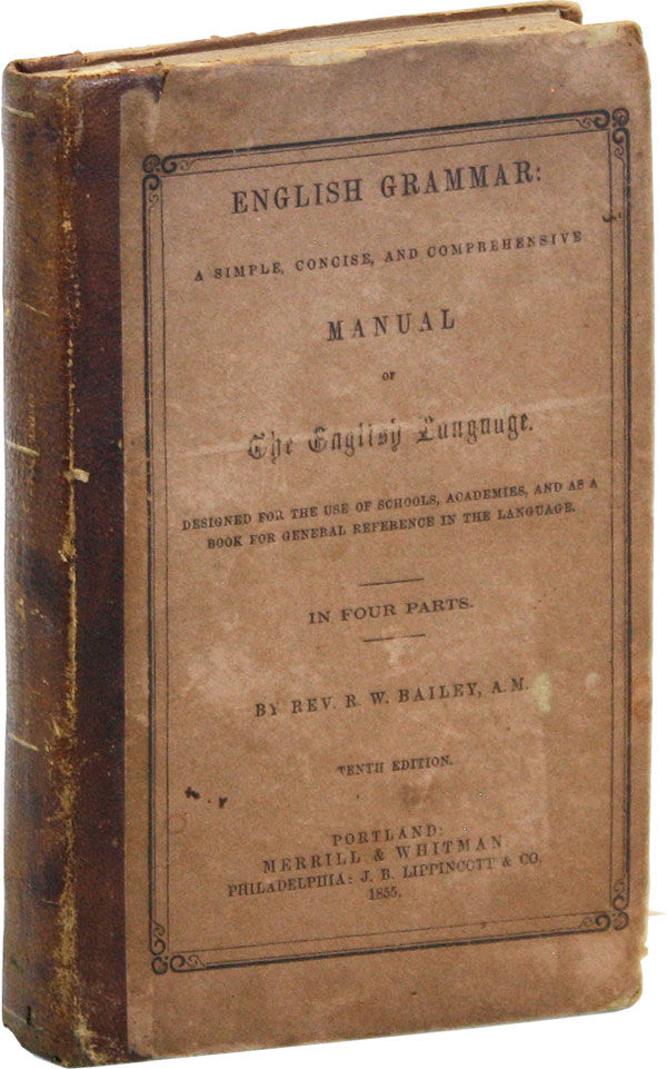 An English grammar manual designed primarily for use in schools and other institutions, this book also covers etymology, syntax, prosody, orthography, and more, as taught in the 1850's. A representative of Merrill & Whitman signed and inscribed this copy to L.H. Ludden Esq., a name belonging to a Maine lawyer practicing at the time.