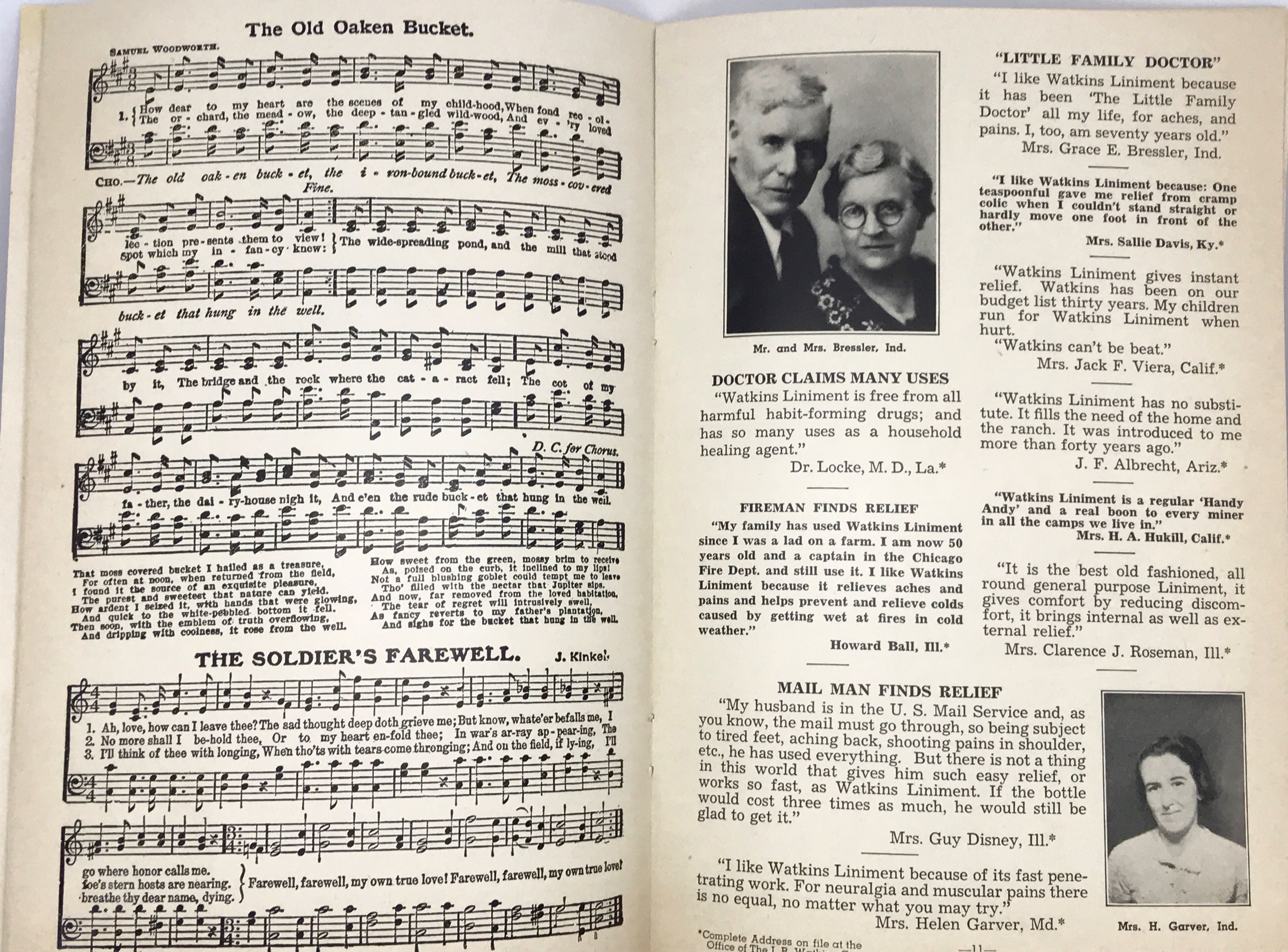 Newark, NJ: The J.R. Watkins Co. , c. 1930. Staplebound wraps. Illustrated wraps. Very good. 9 x 5 1/2 in. 24 pages. Song book/promotional advertisement for Watkins Liniment. Filled with customer reviews and testimonials. Black and white illustrations. Spine lightly rubbed.