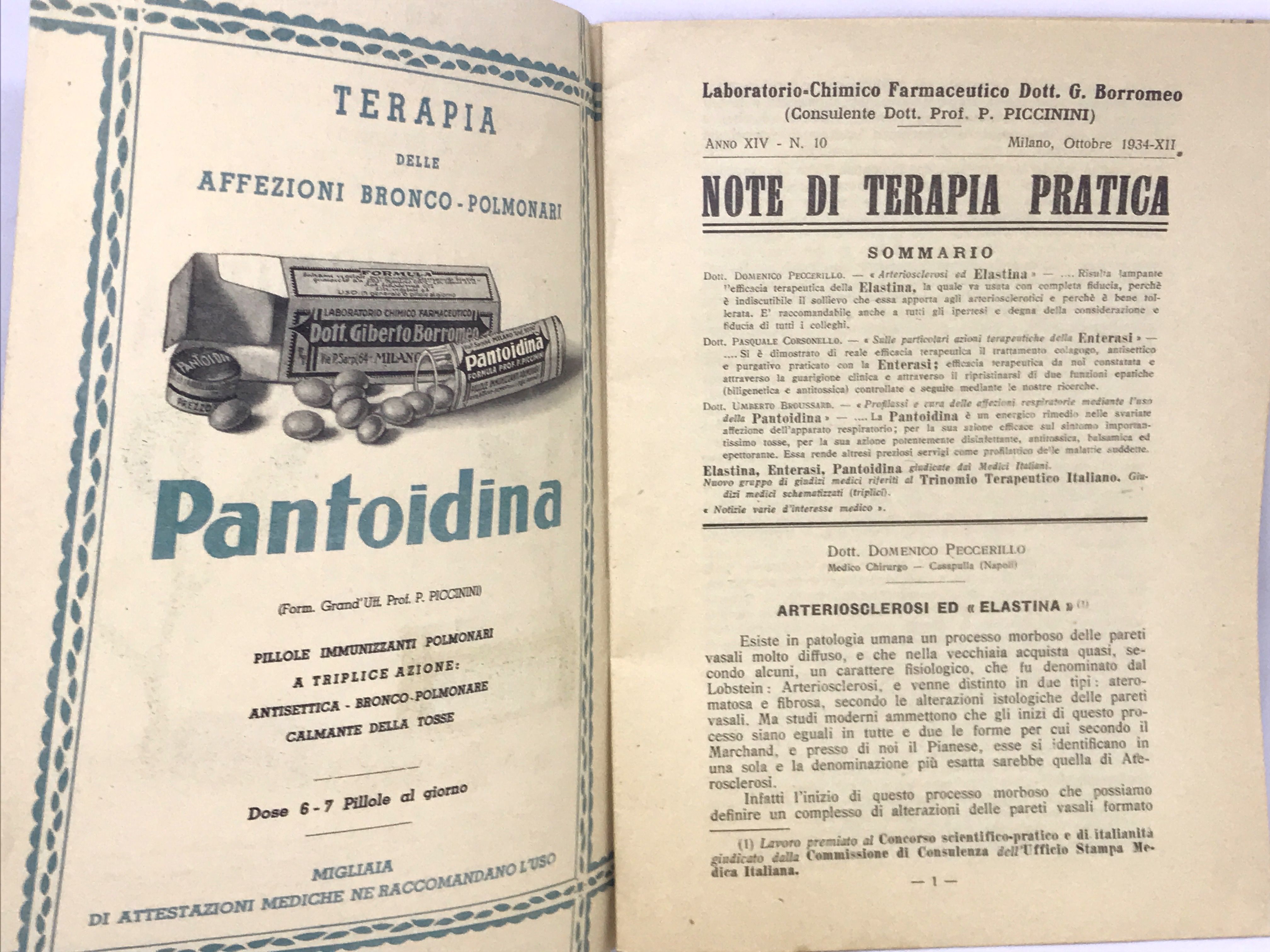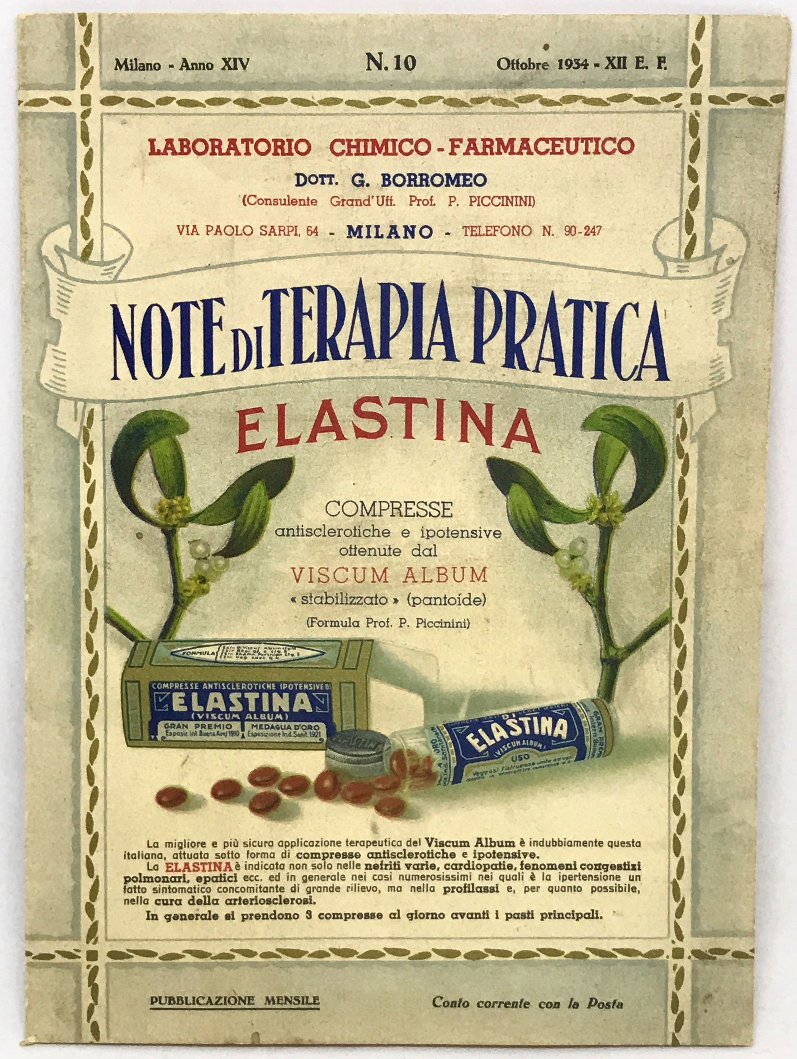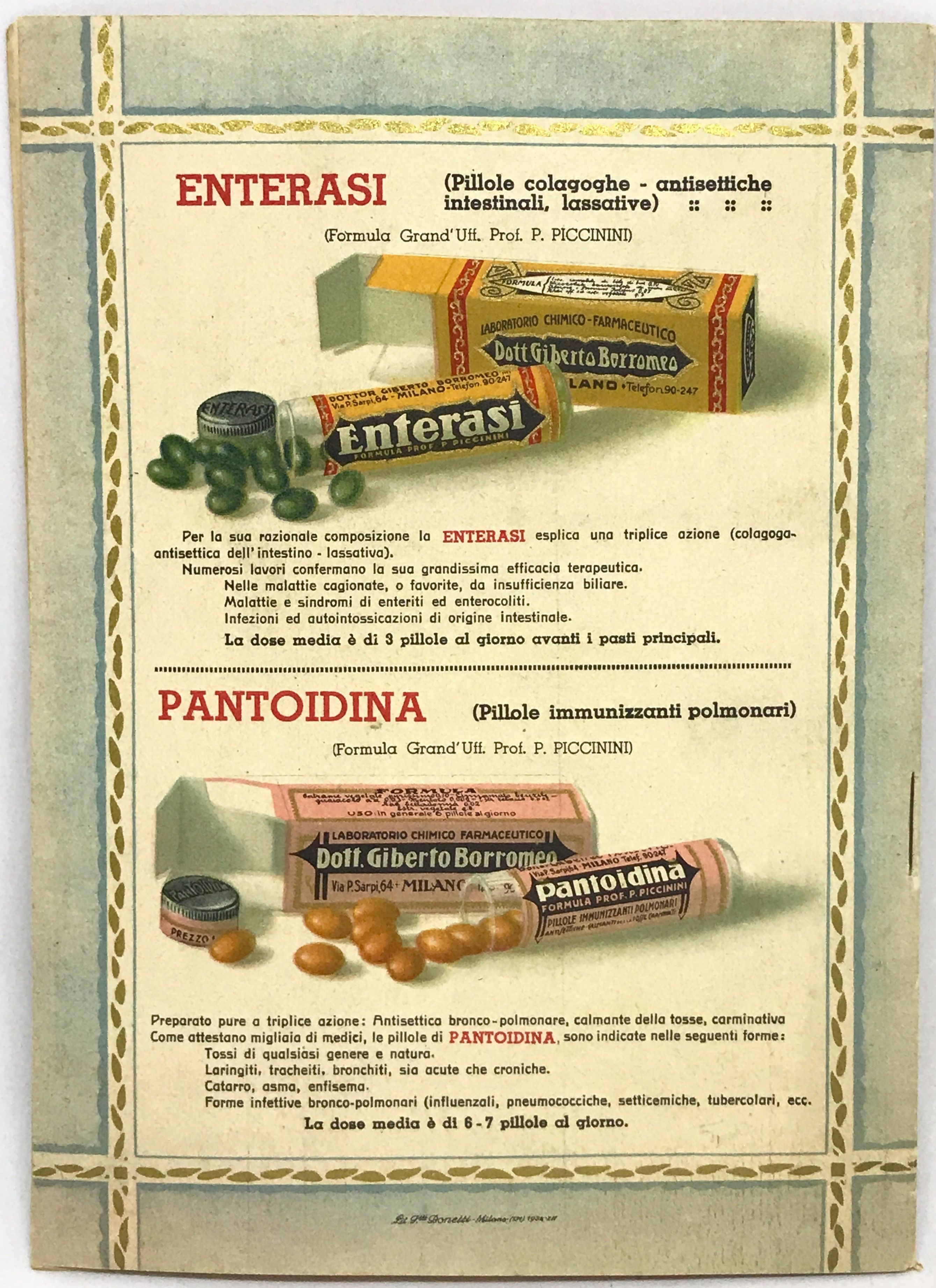 Milan, 1934. Staplebound. Color illustrated wraps, gilt decorations. Very good. 31 pages. 20 x 14.5 Elegant chromolithographic covers. Italian language monthly periodical/promotional booklet for three products: Elastina, Enterasi, and Pantoidina, including 12 pages of testimonials by Italian doctors. Dubious claims of relieving Gastritis, Heart Disease, and Hepatitis accompanied by case studies. Light toning.