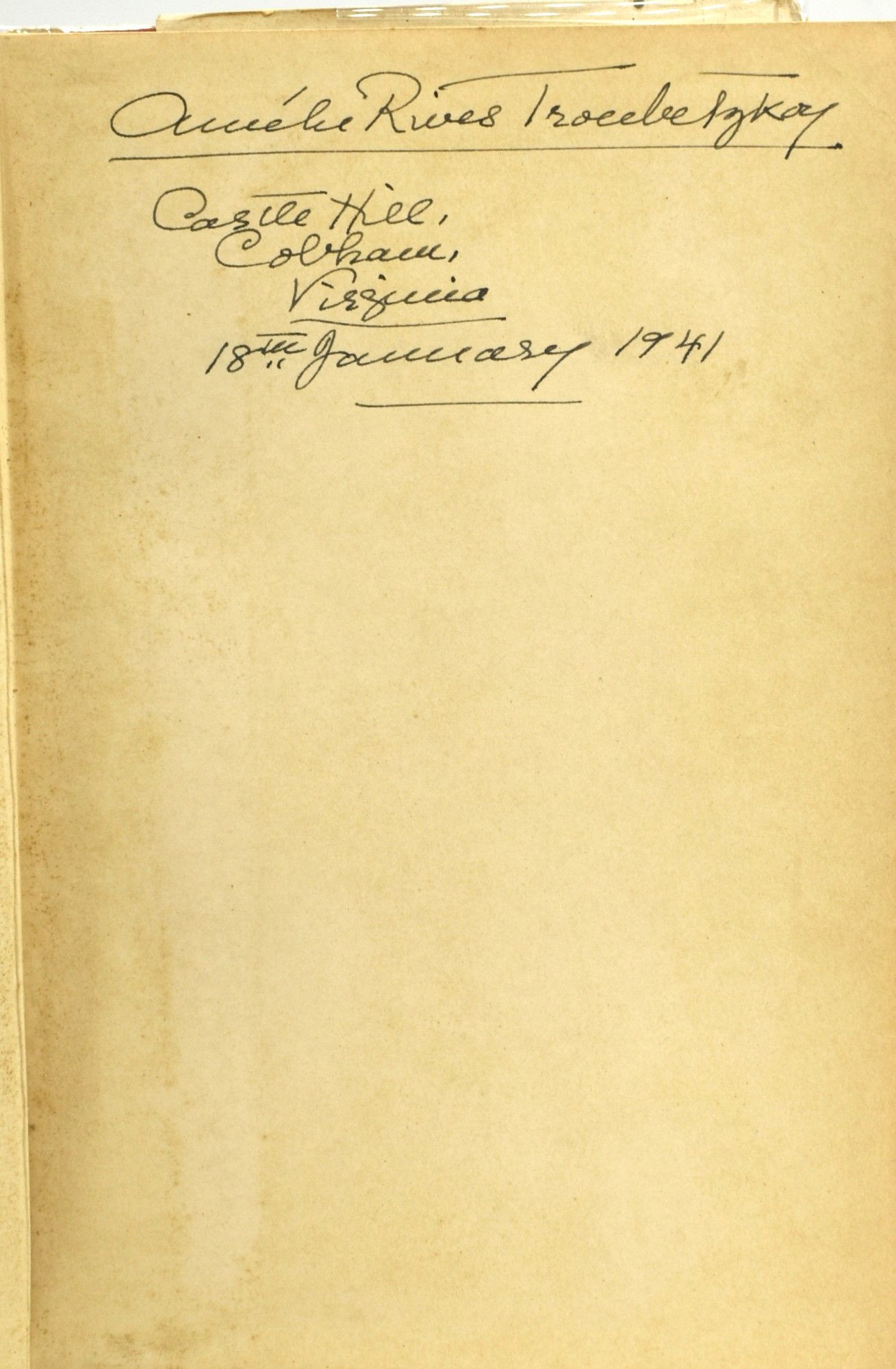 New York: Sheridan House, 1941. First US Edition. Hard Cover. Very Good binding/Poor dust jacket. Previously owned by Amelie Rives Troubetzkoy, the American author best known for her first novel, The Quick and the Dead, with her signature on the front endpaper, dated January 1941. An unfortunate '1936' penned at the bottom of the title page. Binding somewhat cocked. Significant wear and tearing to the dustjacket, with loss to the bottom half of the dustjacket spine. Red cloth with a Poor First Ed. dustjacket. Very Good binding / Poor dust jacket.