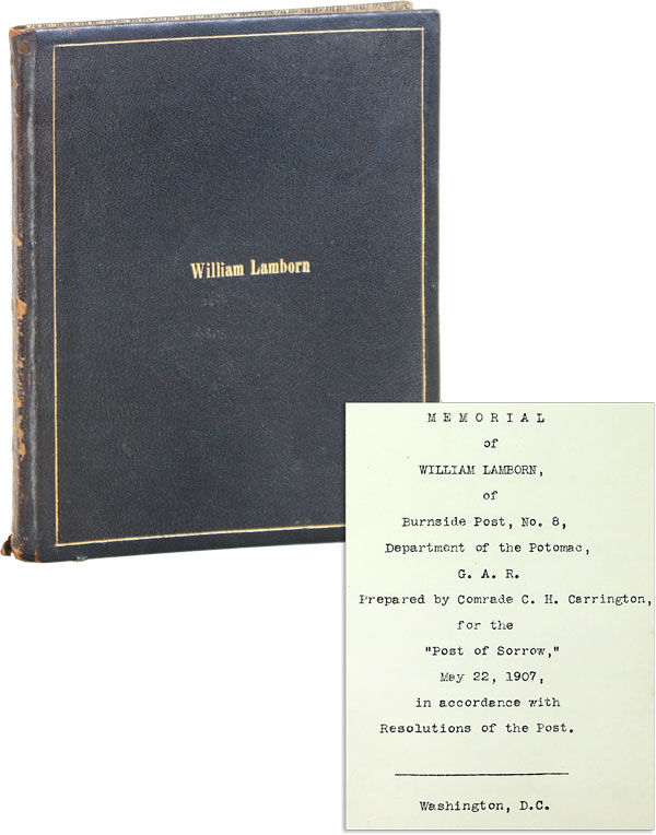 Washington DC: [Grand Army of the Republic, Burnside Post No. 8, Department of the Potomac], 1907. Edition not stated. Octavo (20cm); black leatherette, stamped in gilt; 19pp. Boards yawning, with mild rubbing and wear; chipping to spine, hinges slightly bumped. Contents hand-typed and unusually bound; textblock toned, with light foxing and soiling throughout. Very Good, very rare example of a Grand Army of the Republic (G.A.R.) memorial book.