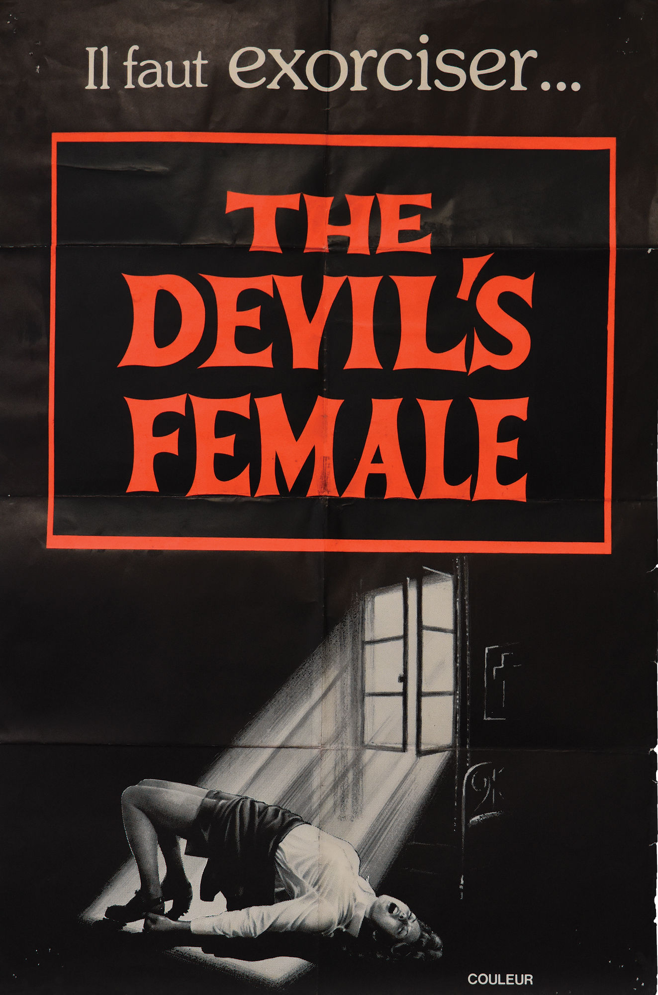 N.p.: Constantin-Film, 1976. Vintage French-Canadian poster for the 1974 German film, "Magdalena, vom Teufel besessen," released in the US as "Beyond the Darkness," "Magdalena, Possessed by the Devil," and "The Devil’s Female." With the latter title tipped on to the poster, demonstrating the ad hoc distribution process for grindhouse and exploitation films, which often saw titles change at a moment’s notice to better catch the public’s attention (and sometimes trick them into seeing a film they’ve already seen).